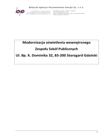 Modernizacja oświetlenia wewnętrznego Zespołu Szkół Publicznych Ul. Bp. K. Dominika 32, 83-200 Starogard Gdański 1 Karta audytu oświetlenia wewnętrznego obiektu 1. Dane ogólne 1. Konstrukcja/technologia tradycyjna z elementami prefabrytkow anymi 2. Liczba kondygnacji 4. Powierzchnia netto budynku 5. Powierzchnia użytkowa części mieszkalnej 6. Powierzchnia użytkowa lokali użytkowych oraz innych pomieszczeń 7. Liczba lokali mieszkalnych 8. Liczba osób użytkujących budynek 9. Sposób przygotowania ciepłej wody 10. Rodzaj systemu ogrzewczego budynku 12. Inne dane charakteryzujące budynek 2. Zainstalowana moc w oświetleniu wewnętrznym kW 4/1 2 631,7 0 2 631,7 0 542 centralne z msc centralne z msc Stan Stan po przed moderni moderni zacji zacją 26,70 19,90 1. zainstalowana moc 3. Charakterystyka energetyczna oświetlenia 1. Roczne zużycie energii na oświetlenie wewnętrzne MWh 53,5 37,5 4. Średnia cena energii brutto z VAT 1. Średnia cena energii brutto z VAT zł/MWh 541,94 541,94 5. Charakterystyka ekonomiczna optymalnego wariantu przedsięwzięcia termomodernizacyjnego Planowana kwota kredytu [zł]oszczędność kosztów energii [zł/rok] Roczna 8 681,85 Planowane nakłady całkowite 154 518,00 (z VAT) Roczne[zł] zmniejszenie zapotrzebowania na energię [%] 30,0 2 1. Cel i zakres opracowania ................................................................................................................. 4 2. Istniejące oprawy oświetleniowe .................................................................................................... 4 3. Modernizacja oświetlenia ............................................................................................................... 5 4. Warianty modernizacji .................................................................................................................... 6 5. Wariant 1 ......................................................................................................................................... 6 6. 5.1. Wskaźniki................................................................................................................................. 7 5.2. Nakłady i oszczędności ............................................................................................................ 8 5.3. Okres zwrotu inwestycji .......................................................................................................... 8 Wariant 2 ......................................................................................................................................... 9 6.1. Wskaźniki................................................................................................................................. 9 6.2. Nakłady i oszczędności .......................................................................................................... 10 6.3. Okres zwrotu inwestycji ........................................................................................................ 10 7. Efekt ekologiczny ........................................................................................................................... 11 8. Podsumowanie .............................................................................................................................. 11 3 1. Cel i zakres opracowania Celem opracowania jest analiza zużycia energii elektrycznej na cele oświetlenia Zespołu Szkół Publicznych, Ul. Bp.K. Dominika 32, 83-200 w Starogardzie Gdańskim, jak również wskazanie możliwości ograniczenia zużycia energii oraz związanych z tym nakładów inwestycyjnych. W zakres niniejszego opracowania włączone jest oświetlenie wewnętrznych powierzchni ogrzewanych budynku. Audyt został opracowany zgodnie z Ustawą z dnia 15 kwietnia 2011 r. o efektywności energetycznej Dz.U. nr 94, poz.551 oraz Rozporządzenia Ministra Infrastruktury z dnia 3.06.2014 w sprawie metodologii obliczania charakterystyki energetycznej budynku. Oszczędności w zużyciu energii dla źródeł światła obliczone są przy założeniu, że natężenie oświetlenia powierzchni, mierzone w luksach [lm/m2], po modernizacji spełnia wymagania normy PN-EN 12464-1 Światło i oświetlenie – Oświetlenie miejsc pracy. Inwentaryzację źródeł oświetlenia w zakresie niezbędnym dla wykonania niniejszego audytu oraz dobór modernizowanych źródeł wykonała Spółka Neox z Gdańska. 2. Istniejące oprawy oświetleniowe Dokonano oceny istniejącej instalacji elektrycznej zasilającej oświetlenie wewnętrzne oraz przeprowadzono inwentaryzację opraw oświetleniowych. Tabela 2.1 zawiera zestawienie mocy i ilość opraw oświetleniowych. Łączna moc zainstalowana w oświetleniu wynosi ok. 27 kW. Inwentaryzację źródeł oświetlania w poszczególnych pomieszczeniach zawiera Tabela 2.1. Tabela 2.1 Zestawienie opraw oświetleniowych Typ oprawy Sztuk Moc [kW] Świetlówki 2x36W 106 7,6 Świetlówki 2x36W 204 15 Świetlówka 36W 15 1,1 Żarówka 60W 28 1,7 Lampy sodowe 72W 18 1,3 Halogeny 150W 6 0,9 377 27,3 kW Łącznie Wiele z zainstalowanych opraw jest zdekompletowanych, nie posiada dyfuzorów lub osłon. W większości są to oprawy starego typu, a ponad 80% mocy zainstalowanej, są to świetlówki o mocy od 36W do 72W. 4 3. Modernizacja oświetlenia Oświetlenie wewnętrzne w ZSP zakwalifikowano do wymiany. W sali gimnastycznej oświetlenie jest niewystarczające. W kilku przypadkach oprawy nie świecą pełną mocą (brakuje wkładów lub część opraw nie działa). Rys. 1 przedstawia oprawy oświetleniowe jednego z pomieszczeń ze zdekompletowanymi lub zabrudzonymi dyfuzorami. Rys. 2 przedstawia ogólny widok na stare oprawy sali gimnastycznej, a Rys. 3 jedną z opraw w przybliżeniu. Rys. 1 Przykład zdekompletowanych i zabrudzonych opraw Rys. 2 Ogólny widok na stare oprawy Sali gimnastycznej 5 Rys. 3 Stara oprawa na Sali gimnastycznej 4. Warianty modernizacji Zaproponowano dwa warianty modernizacj