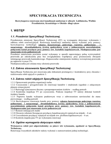 SPECYFIKACJA TECHNICZNA Bezwykopowa renowacja sieci kanalizacji sanitarnej w ulicach Lubliniecka, Wielkie Przedmieście, Krasickiego w Oleśnie- długi rękaw 1. WSTĘP 1.1. Przedmiot Specyfikacji Technicznej. Przedmiotem niniejszej Specyfikacji Technicznej (ST) są wymagania dotyczące wykonania i odbioru robót renowacyjnych. Renowację kanalizacji sanitarnej należy wykonać przy pomocy bezwykopowej technologii rękawa bezszwowego pokrytego warstwą poliuretanu i nasączonego dwuskładnikową żywicą epoksydową wraz z jednoczesnym uszczelnieniem połączenia kanał przyłącze przy pomocy tzw. kształtek kapeluszowych . Niedopuszczalne jest stosowanie żywic poliestrowych Przedmiot zamówienia powinien zostać wykonany w sposób zapewniający pełną wytrzymałość przewodu po zakończeniu prac bez uwzględniania współpracy przy przenoszeniu obciążeń istniejącego przewodu kamionkowego. Dopuszczalne zmniejszenie średnicy wewnętrznej przewodu po naprawie wynosi 5%. Niedopuszczalna jest zmiana trasy ułożenia przewodu 1.2. Zakres stosowania Specyfikacji Technicznej. Specyfikacja Techniczna jest stosowana jako dokument przetargowy i kontraktowy przy zlecaniu i realizowaniu robót ujętych w punkcie 3. 1.3. Zakres robót objętych Specyfikacją Techniczną. 1.3.1 Opracowanie projektu organizacji ruchu. 1.3.2 Czyszczenie i przygotowanie do renowacji kanałów i studzienek (zgodnie z załączonym planem sytuacyjnym) 1.3.3 Rurociągi tymczasowe tłoczne z przepompowaniem ścieków – według potrzeb 1.3.4 Kontrolna inspekcja TV po czyszczeniu. Podczas inspekcji TV należy dokonać kontroli średnicy kanału. 1.3.5 Naprawa kanału wykopem punktowym wraz z odtworzeniem nawierzchni do stanu pierwotnego – według potrzeb 1.3.6 Bezwykopowa renowacja kanału przy pomocy rękawa bezszwowego pokrytego warstwą poliuretanu i nasączonego dwuskładnikową żywicą epoksydową wraz z jednoczesnym uszczelnieniem połączenia kanał przyłącze przy pomocy tzw. kształtek kapeluszowych . Niedopuszczalne jest stosowanie żywic poliestrowych 1.3.7 Remont istniejących studni 1.3.8 Otwarcie robotem frezującym przyłączy kanalizacyjnych wpiętych na trójnik – 4 szt. 1.3.8 Uszczelnienie przyłączy wpiętych na trójnik tzw. profilem kapeluszowym – 4 szt. 1.3.8 Kontrola inspekcyjna TV po wykonaniu renowacji 1.4. Ogólne wymagania dotyczące robót. Wykonawca robót jest odpowiedzialny za jakość ich wykonania, zgodność ze Specyfikacją Techniczną. Renowację wszystkich odcinków należy wykonać z zastosowaniem jednej technologii. 2. MATERIAŁY 2.1. Materiały użyte do budowy powinny spełniać warunki określone w odpowiednich normach przedmiotowych i Aprobacie Technicznej a w szczególności: Rękaw uszczelniający - rękaw bezszwowy pokryty warstwą poliuretanu i nasączony dwuskładnikową żywicą epoksydową, o grubości zapewniającej przenoszenie obciążeń gruntu, obciążeń hydrostatycznych oraz obciążeń eksploatacyjnych przy założeniu całkowitego zniszczenia naprawianego przewodu bez uwzględniania jego roli przy przenoszeniu obciążeń. Rękaw uszczelniający musi spełniać następujące wymagania: a) nasączone żywicami powierzchnie wewnętrzne i zewnętrzne rękawa powinny być gładkie, pozbawione wad w postaci niejednorodności i wtrąceń ciał obcych, końce rękawa powinny być obcięte równo i prostopadle do osi, b) barwa rękawa przed zainstalowaniem powinna być na całej jego powierzchni jednakowa pod względem odcienia i intensywności, c) moduł Younga nie mniejszy niż 2400 MPa, określany zgodnie z EN1228, d) minimalne grubości rękawa po utwardzeniu określane zgodnie z EN1228, e) sztywność obwodowa nie powinna być mniejsza niż 2kN/m2, określana zgodnie z EN ISO178, f) odporność chemiczna w zakresie pH 6-9 i temperatury do 60 °C, g) odporność na ścieranie, h) wymiary rękawa dobrane do średnicy kanału, i) przyleganie rękawa do powierzchni wewnętrznej kanału na całej długości równomiernego utwardzenia rękawa, j) zapewnienie właściwego stanu kanału po renowacji w postaci gładkiej powierzchni kanału, 2.2. Jakość rękawa przeznaczonego udokumentowana poprzez: do renowacji musi być Dokument identyfikacyjny dostawę, zawierający : - nazwę i znak producenta - nazwę materiału - średnicę rękawa - długość rękawa - grubość rękawa - datę produkcji i miejsce przeznaczenia 2.3. Studzienki kanalizacyjne remont. Doszczelnienie studni oraz remont kinet należy wykonać za pomocą chemii budowlanej. Należy zamontować odpowiednią ilość stopni włazowych. 2.4. Beton. Beton hydrotechniczny B-15, B-25 powinien odpowiadać wymaganiom PN-89/B-30016 Cementy specjalne - Cement hydrotechniczny oraz PN-EN 206-1:2002 (U) Beton - Część 1: Wymagania, właściwości, produkcja i zgodność. Beton hutniczy lub równoważny. 2.5. Zaprawa cementowa. Zaprawa cementowa powinna odpowiadać wymaganiom PN-B-14501. 2.6. Materiały izolacyjne. Lepik asfaltowy według PN-74/B-26640. 2.7. Składowanie materiałów. Wszystkie wyroby należy układać według poszczególnych grup, wielkości i gatunków w sposób zapewniający stateczność oraz umożliwiający dostęp do poszczególnych stosów lub pojedynczych elementów. Powierzchnia składowania powinna być utwardzona i zabezpieczona przed gromadzeniem się ścieków sanitarnych wód opadowych. Kształtki i złączki. Kształtki, złączki i inne materiały (uszczelki, środki do czyszczenia, otp.) powinny być składowane w sposób uporządkowany z zachowaniem powyżej opisanych dla rur kanałowych środków ostrożności. Przechowywanie paneli. Transportować do miejsca montażu wg zleceń producenta w sposób nie pogarszający właściwości rękawa. Składowanie w miejscu montażu wg zaleceń producenta. Przechowywanie rękawa. Rękaw transportować do miejsca montażu wg zaleceń producenta w sposób nie pogarszający właściwości rękawa. 2.8. Badanie rękawa przy dostawie p