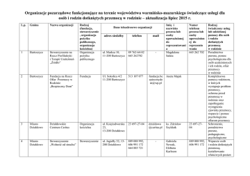 Organizacje pozarządowe funkcjonujące na terenie województwa warmińsko-mazurskiego świadczące usługi dla osób i rodzin dotkniętych przemocą w rodzinie – aktualizacja lipiec 2015 r. L.p. Gmina Nazwa organizacji Rodzaj (fundacja, stowarzyszenie , organizacja pożytku publicznego, organizacja kościelna) Organizacja pożytku publicznego Dane teleadresowe organizacji adres siedziby telefon mail ul. Marksa 10, 11-200 Bartoszyce 89 762-64-82 665 262702 - Imię i nazwisko prezesa lub osoby upoważnionej do reprezentowani a Magdalena Sałata Numer telefonu prezesa lub osoby upoważnion ej do reprezento wania 665 262 702 1 Bartoszyce Stowarzyszenie na Rzecz Profilaktyki i Terapii Uzależnień ,,Źródło” 2 Bartoszyce Fundacja na Rzecz Ofiar Przemocy w Rodzinie „Bezpieczny Dom” Fundacja Ul. Sokolica 4/2 11-200 Bartoszyce 513 107 077 fundacja.be zpiecznydo [email protected] Aneta Majak 3 Miasto Działdowo Działdowskie Centrum Caritas Organizacja kościelna ul. Księżodworska 23, 13-200 Działdowo 23 697-27-04 dzialdowo @caritas.pl ks. Zdzisław Szyldatk 23 697-2704 4 Miasto Działdowo Stowarzyszenie „Wolność od strachu” Stowarzyszenie ul. Jagiełły 32, 13200 Działdowo 889 088 992, 606 991 172 664 885 721 - Gabriela Nowak, Elżbieta Karlsson 889 088 992, 606 991 172 Rodzaj świadczony usług lub udzielanej pomocy dla osób i rodzin dotkniętych przemocą w rodzinie Poradnictwo prawne, pomoc psychologiczna dla osób uzależnionych i ich rodzin, ofiar przemocy w rodzinie Kompleksowa pomocy rodzinom, w których występuje problem przemocy, ochrona przed przemocą w rodzinie oraz zapobieganie wystąpienia zjawiska przemocy, wsparcie i pomoc psychologiczna ofiarom przemocy Schronienie, poradnictwo prawne, pedagogiczne, psychologiczne Wsparcie osób i rodzin dotkniętych przemocą, kształtowanie właściwych postaw 5 Miasto Elbląg Elbląskie Centrum Mediacji i Aktywizacji Społecznej Stowarzyszenie ul. Zw. Jaszczurczego 17/101, 82-300 Elbląg 55 642-44-25 esas_1@ wp.pl Anna Olszewska 55 642-4425 Pomoc psychologiczna pedagogiczna oraz prawna 6 Miasto Elbląg Liga Kobiet Polskich Oddział Terenowy w Elblągu Stowarzyszenie ul. Grunwaldzka 31, 82-300 Elbląg 55 233 -49-23 elkop.elbla [email protected] Danuta Janczuk 55 233-4423 Wsparcie psychologiczne, pedagogiczne, porady prawne 7 Miasto Elbląg Stowarzyszenie ul. Robotnicza 29, 82-300 Elbląg 55 649-69-49 barten@ poczta. onet.pl ks. Edward Rysztowski 55 649-6949 Pomoc psychologiczna, terapeutyczna 8 Miasto Elbląg Stowarzyszenie bogus22@ wp.pl Bogusław Mikuski 55 233-9494 Miasto Elbląg Stowarzyszenie ul. Żeromskiego 22, 82-300 Elbląg ul. Zw. Jaszczurczego 17 pok. 113, 82-300 Elbląg 55 233-94-94 9 Stowarzyszenie Katolicki Ruch Antynarkotyczny „KARAN” Stowarzyszenie Pomocy Rodzinie „Szansa” Stowarzyszenie „Szansa na rozwój” 55 649-11 -44 biuro@sza nsanarozw oj.com Alicja Sepetowska 55 649-1144 10 Miasto Elbląg Organizacja kościelna ul. Zamkowa 17, 82-300 Elbląg 55 232-66-09 - ks. Wojciech Borowski 55 232-6609 11 Miasto Elbląg Poradnia Rodzinna Caritas Diecezji Elbląskiej Towarzystwo Przyjaciół Dzieci Stowarzyszenie ul. 1 Maja 37, 82-300 Elbląg 55 232-82-10 - Łukasz Dembiński 55 232-8210 12 Miasto Elbląg Stowarzyszenie ul. Płk. Dąbka 79, 82-300 Elbląg 600 889 722 - Maria Gallera 600 889 722 13 Miasto Elbląg Stowarzyszenie ul. Tuwima 4, 82-300 Elbląg 55 648-39-69 sskjar@ wp.pl Mirosław Borzęcki 55 648-3969 14 Miasto Iława Stowarzyszenie Inicjatorów Społecznych „Przyjazny Krąg” Stowarzyszenie Społeczno-Kulturalne „JAR” Stowarzyszenie „Przystań” Organizacja pożytku publicznego, Stowarzyszenie ul. Chełmińska 1, 14-200 Iława 89 649-92-08, 89 648-62-38 stowarzysz enie@ przystan.ila wa.pl Arkadiusz Karpiński 89 648-6238 Wsparcie informacyjne, konsultacyjne Wsparcie terapeutyczne, psychologiczne, pedagogiczne, porady prawne Wsparcie terapeutyczne, psychologiczne Wsparcie terapeutyczne, psychologiczne, prawne Wsparcie informacyjne, pedagogiczne, socjoterapeutyczne Wsparcie informacyjne, pedagogiczne Pomoc psychologiczna poradnictwo, terapia indywidualna i grupowa, pomoc prawna 15 Morąg Towarzystwo Przyjaciół Dzieci Oddział Okręgowy w Morągu Organizacja pożytku publicznego ul. Jana Pawła II 1, 14-300 Morąg 89 757-63-60 tpdmorag @wp.pl Krystyna Sałak 509 876 146 16 Morąg Morąskie Stowarzyszenie Wspierania Rodzin Stowarzyszenie ul. Żeromskiego 19, 14-300 Morąg 89 757-44-40 mostwr@ wp.pl Krystyna Prajwocka 606 611 825 17 Miasto Mrągowo Stowarzyszenie Wielokierunkowej Pomocy „Remedium” Stowarzyszenie ul. Kościelna 2, 11-700 Mrągowo 531 278 298 remedium. mragowo@ op.pl Bożena AnackaOlszewska 531 278 298 18 Miasto Mrągowo Stowarzyszenie na Rzecz Pomocy Rodzinie „Synapsa” Stowarzyszenie ul. Osiedle Mazurskie 37, 11-700 Mrągowo 661 665 192 synapsa2@ synapsa. mragowo. pl Iwona Krywiczanin 661 665 192 19 Nidzica Stowarzyszenie „Chorcylia, STOP Chorobom Cywilizacyjnym” Stowarzyszenie ul. Żeromskiego 10 a, 13-100 Nidzica 691 400 409 chorcylia@ interia.pl Piotr Jastrzębowski 691 400 409 20 Olsztyn ”CARITAS” Organizacja ul. Grunwaldzka 89 523-64-02 interwencja ks. Paweł Zięba 89 523-64- Poradnictwo i terapia psychologiczna dla uczestników Warsztatów Terapii Zajęciowej i Środowiskowego Domu Samopomocy, wsparcie i opieka dla dzieci uczestników świetlicy środowiskowej Poradnictwo pedagogiczne i psychologiczne, pomoc materialna, informowanie o instytucjach wspomagających rodziny z problemem Specjalistyczne poradnictwo dla osób z zaburzeniami psychicznymi i upośledzeniem umysłowym Telefon zaufania, mediacje, pomoc prawna i psychologiczna osobom pokrzywdzonym przestępstwem Przeciwdziałanie przemocy w środowisku lokalnym, pomoc osobom Ośrodek 21 22 Olsztyn Olsztyn Archidiecezji Warmińskiej kościelna 45, 10-125 Olsztyn WarmińskoMazurskiego Stowarzyszenia Pomocy Rodzinie „Sukurs” Stowarzyszenie ul. Kopernika 45, 10-512 Olsztyn Katolickie Stow