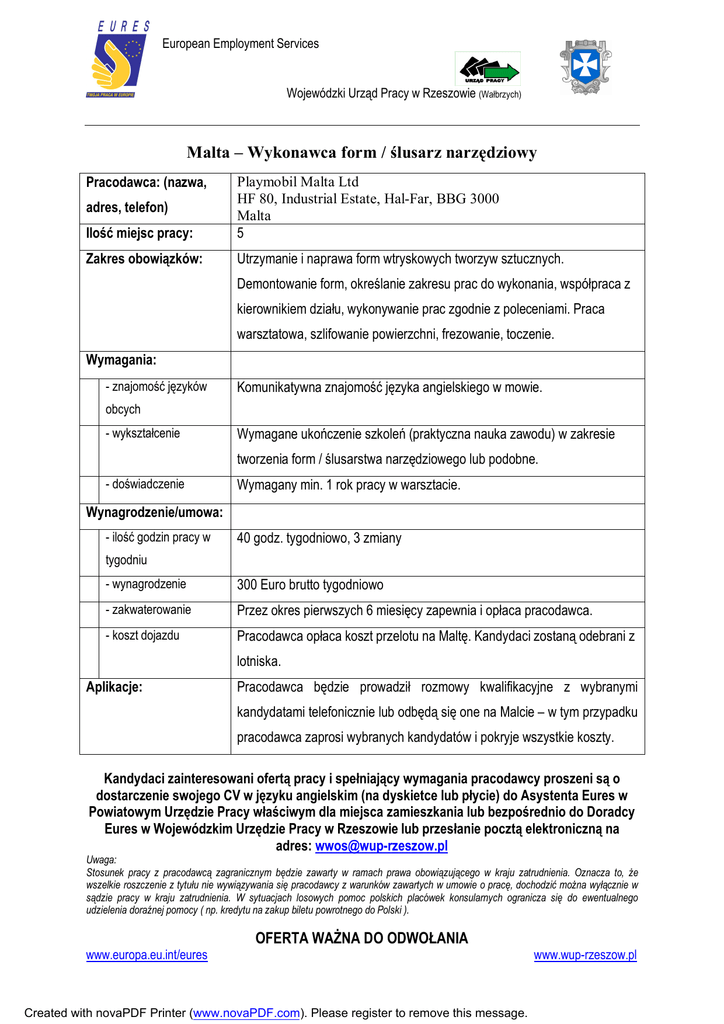 European Employment Services Wojewódzki Urząd Pracy w Rzeszowie (Wałbrzych) Malta – Wykonawca form / ślusarz narzędziowy Pracodawca: (nazwa, Ilość miejsc pracy: Playmobil Malta Ltd HF 80, Industrial Estate, Hal-Far, BBG 3000 Malta 5 Zakres obowiązków: Utrzymanie i naprawa form wtryskowych tworzyw sztucznych. adres, telefon) Demontowanie form, określanie zakresu prac do wykonania, współpraca z kierownikiem działu, wykonywanie prac zgodnie z poleceniami. Praca warsztatowa, szlifowanie powierzchni, frezowanie, toczenie. Wymagania: - znajomość języków Komunikatywna znajomość języka angielskiego w mowie. obcych - wykształcenie Wymagane ukończenie szkoleń (praktyczna nauka zawodu) w zakresie tworzenia form / ślusarstwa narzędziowego lub podobne. - doświadczenie Wymagany min. 1 rok pracy w warsztacie. Wynagrodzenie/umowa: - ilość godzin pracy w 40 godz. tygodniowo, 3 zmiany tygodniu - wynagrodzenie 300 Euro brutto tygodniowo - zakwaterowanie Przez okres pierwszych 6 miesięcy zapewnia i opłaca pracodawca. - koszt dojazdu Pracodawca opłaca koszt przelotu na Maltę. Kandydaci zostaną odebrani z lotniska. Aplikacje: Pracodawca będzie prowadził rozmowy kwalifikacyjne z wybranymi kandydatami telefonicznie lub odbędą się one na Malcie – w tym przypadku pracodawca zaprosi wybranych kandydatów i pokryje wszystkie koszty. Kandydaci zainteresowani ofertą pracy i spełniający wymagania pracodawcy proszeni są o dostarczenie swojego CV w języku angielskim (na dyskietce lub płycie) do Asystenta Eures w Powiatowym Urzędzie Pracy właściwym dla miejsca zamieszkania lub bezpośrednio do Doradcy Eures w Wojewódzkim Urzędzie Pracy w Rzeszowie lub przesłanie pocztą elektroniczną na adres: [email protected] Uwaga: Stosunek pracy z pracodawcą zagranicznym będzie zawarty w ramach prawa obowiązującego w kraju zatrudnienia. Oznacza to, że wszelkie roszczenie z tytułu nie wywiązywania się pracodawcy z warunków zawartych w umowie o pracę, dochodzić można wyłącznie w sądzie pracy w kraju zatrudnienia. W sytuacjach losowych pomoc polskich placówek konsularnych ogranicza się do ewentualnego udzielenia doraźnej pomocy ( np. kredytu na zakup biletu powrotnego do Polski ). OFERTA WAŻNA DO ODWOŁANIA www.europa.eu.int/eures Created with novaPDF Printer (www.novaPDF.com). Please register to remove this message. www.wup-rzeszow.pl