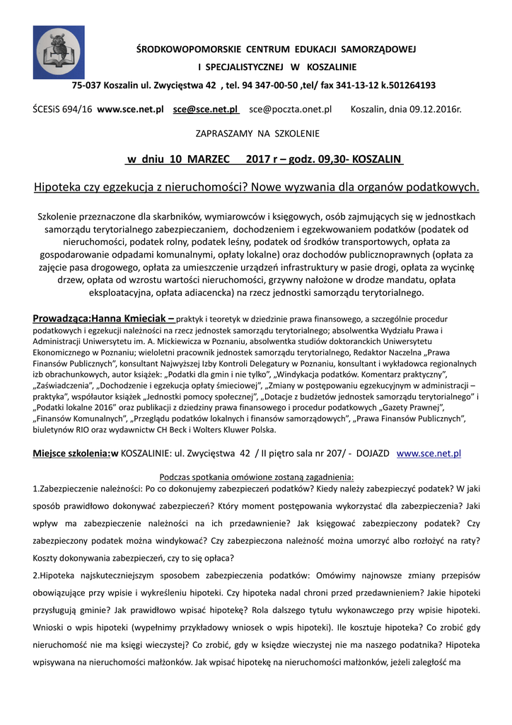 ŚRODKOWOPOMORSKIE CENTRUM EDUKACJI SAMORZĄDOWEJ I SPECJALISTYCZNEJ W KOSZALINIE 75-037 Koszalin ul. Zwycięstwa 42 , tel. 94 347-00-50 ,tel/ fax 341-13-12 k.501264193 ŚCESiS 694/16 www.sce.net.pl [email protected] [email protected] Koszalin, dnia 09.12.2016r. ZAPRASZAMY NA SZKOLENIE w dniu 10 MARZEC 2017 r – godz. 09,30- KOSZALIN Hipoteka czy egzekucja z nieruchomości? Nowe wyzwania dla organów podatkowych. Szkolenie przeznaczone dla skarbników, wymiarowców i księgowych, osób zajmujących się w jednostkach samorządu terytorialnego zabezpieczaniem, dochodzeniem i egzekwowaniem podatków (podatek od nieruchomości, podatek rolny, podatek leśny, podatek od środków transportowych, opłata za gospodarowanie odpadami komunalnymi, opłaty lokalne) oraz dochodów publicznoprawnych (opłata za zajęcie pasa drogowego, opłata za umieszczenie urządzeń infrastruktury w pasie drogi, opłata za wycinkę drzew, opłata od wzrostu wartości nieruchomości, grzywny nałożone w drodze mandatu, opłata eksploatacyjna, opłata adiacencka) na rzecz jednostki samorządu terytorialnego. Prowadząca:Hanna Kmieciak – praktyk i teoretyk w dziedzinie prawa finansowego, a szczególnie procedur podatkowych i egzekucji należności na rzecz jednostek samorządu terytorialnego; absolwentka Wydziału Prawa i Administracji Uniwersytetu im. A. Mickiewicza w Poznaniu, absolwentka studiów doktoranckich Uniwersytetu Ekonomicznego w Poznaniu; wieloletni pracownik jednostek samorządu terytorialnego, Redaktor Naczelna „Prawa Finansów Publicznych”, konsultant Najwyższej Izby Kontroli Delegatury w Poznaniu, konsultant i wykładowca regionalnych izb obrachunkowych, autor książek: „Podatki dla gmin i nie tylko”, „Windykacja podatków. Komentarz praktyczny”, „Zaświadczenia”, „Dochodzenie i egzekucja opłaty śmieciowej”, „Zmiany w postępowaniu egzekucyjnym w administracji – praktyka”, współautor książek „Jednostki pomocy społecznej”, „Dotacje z budżetów jednostek samorządu terytorialnego” i „Podatki lokalne 2016” oraz publikacji z dziedziny prawa finansowego i procedur podatkowych „Gazety Prawnej”, „Finansów Komunalnych”, „Przeglądu podatków lokalnych i finansów samorządowych”, „Prawa Finansów Publicznych”, biuletynów RIO oraz wydawnictw CH Beck i Wolters Kluwer Polska. Miejsce szkolenia:w KOSZALINIE: ul. Zwycięstwa 42 / II piętro sala nr 207/ - DOJAZD www.sce.net.pl Podczas spotkania omówione zostaną zagadnienia: 1.Zabezpieczenie należności: Po co dokonujemy zabezpieczeń podatków? Kiedy należy zabezpieczyć podatek? W jaki sposób prawidłowo dokonywać zabezpieczeń? Który moment postępowania wykorzystać dla zabezpieczenia? Jaki wpływ ma zabezpieczenie należności na ich przedawnienie? Jak księgować zabezpieczony podatek? Czy zabezpieczony podatek można windykować? Czy zabezpieczona należność można umorzyć albo rozłożyć na raty? Koszty dokonywania zabezpieczeń, czy to się opłaca? 2.Hipoteka najskuteczniejszym sposobem zabezpieczenia podatków: Omówimy najnowsze zmiany przepisów obowiązujące przy wpisie i wykreśleniu hipoteki. Czy hipoteka nadal chroni przed przedawnieniem? Jakie hipoteki przysługują gminie? Jak prawidłowo wpisać hipotekę? Rola dalszego tytułu wykonawczego przy wpisie hipoteki. Wnioski o wpis hipoteki (wypełnimy przykładowy wniosek o wpis hipoteki). Ile kosztuje hipoteka? Co zrobić gdy nieruchomość nie ma księgi wieczystej? Co zrobić, gdy w księdze wieczystej nie ma naszego podatnika? Hipoteka wpisywana na nieruchomości małżonków. Jak wpisać hipotekę na nieruchomości małżonków, jeżeli zaległość ma tylko mąż? Czy można wpisać hipotekę przed terminem płatności? Czy po wpisaniu hipoteki można wystawić tytuł wykonawczy? Czy do wpisu hipoteki potrzebna jest klauzula wykonalności i jak ją zdobyć. Czy hipoteka ma znaczenie w egzekucji zaległego podatku? Kto i na jakiej podstawie ma obowiązek wykreślić hipotekę? Najnowsze orzecznictwo. 3.Egzekucja z nieruchomości: Kiedy wójt sięga po egzekucję z nieruchomości? Czy do egzekucji z nieruchomości muszę mieć wpisaną hipotekę? Naczelnik urzędu skarbowego czy komornik sądowy, kto prowadzi egzekucję z nieruchomości? Od czego zacząć? Przedstawimy wzory wniosku o egzekucję z nieruchomości. Jak „przyłączyć się” do egzekucji z nieruchomości prowadzonej przez komornika sądowego? Rola zgłoszenia wierzytelności. Czy wójt może przejąć nieruchomość za długi w postępowaniu egzekucyjnym? Jak przebiega egzekucja z nieruchomości? Na co należy zwrócić szczególną uwagę? Jak dzielona jest kwota uzyskana z licytacji? Co zrobić jeśli nie dostaliśmy swoich zaległości? Co zrobić jeśli organ egzekucyjny umorzy egzekucję z nieruchomości (nie sprzeda nieruchomości)? Odpowiemy na nurtujące wierzycieli pytania w zakresie egzekucji z nieruchomości. 4.Pytania i dyskusja uczestników.pan.lublin.pl lubaksem Uczestnicy otrzymują zaświadczenie o ukończeniu szkolenia. Odpłatność : 350,00 zł od osoby - płatne przelewem 7 DNI od otrzymania rachunku . W cenie zapewniamy: catering oraz materiały szkoleniowe. Zgłoszenie na szkolenie prosimy wypełnić i przesłać faxem /tel/fax 94-341-13-12. Zgłaszając uczestnictwo faxem prosimy o potwierdzenie telefoniczne. W przypadku nie zebrania odpowiedniej ilości osób organizator zastrzega sobie prawo odwołania szkolenia lub zmiany terminu,miejsca szkolenia. DYREKTOR Andrzej Urbanek Z G Ł O S Z E N I E – „HIPOTEKA CZY EGZEKUCJA ” 10.03.2017 r –g.09.30 KOSZALIN KARTA ZGŁOSZENIOWA- DANE DO WYSTAWIENIA FAKTURY /NAZWA,ADRES ,NIP/ ................................................................................................................................................. NIP ...................................................... TEL. ................................................ 1. .....................................