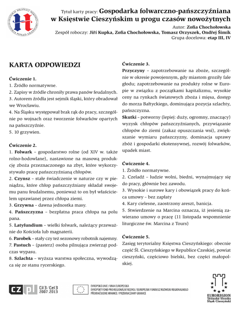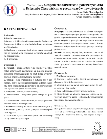 Tytuł karty pracy: Gospodarka folwarczno-pańszczyźniana w Księstwie Cieszyńskim u progu czasów nowożytnych Autor: Zofia Chochołowska Zespół roboczy: Jiří Kupka, Zofia Chochołowska, Tomasz Orzyszek, Ondřej Šimík Grupa docelowa: etap III, IV KARTA ODPOWIEDZI Ćwiczenie 1. 1. Źródło normatywne. 2. Zapisy w źródle chroniły prawa panów feudalnych. 3. Autorem źródła jest sejmik śląski, który obradował we Wrocławiu. 4. Na Śląsku występował brak rąk do pracy, szczególnie po wojnach oraz tworzenie folwarków opartych Ćwiczenie 3. Przyczyny – zapotrzebowanie na zboże, szczególnie w okresie powojennym, gdy miastom groziły fale głodu; zapotrzebowanie na produkty rolne w Europie w związku z początkami kapitalizmu, wysokie ceny na rynkach światowych zboża i mięsa, dostęp do morza Bałtyckiego, dominująca pozycja szlachty, pańszczyzna. Skutki – potworny (lepiej: duży, ogromny, znaczący) wyzysk chłopów pańszczyźnianych, przywiązanie chłopów do ziemi (zakaz opuszczania wsi), zwiększanie wymiaru pańszczyzny, dominacja uprawy zbóż i gospodarki ekstensywnej, rozwój folwarków, Ćwiczenie 2. 1. Folwark – gospodarstwo rolne (od XIV w. także upadek miast. rolno-hodowlane), nastawione na masową produkcję zboża przeznaczonego na zbyt, które wykorzy- Ćwiczenie 4. 1. Źródło normatywne. stywało pracę pańszczyźnianą chłopów. 2. Czynsz – stałe świadczenie w naturze czy w pie- 2. Czeladź – ludzie wolni, biedni, wynajmujący się niądzu, które chłop pańszczyźniany składał swoje- do pracy, głównie bez zawodu. mu panu feudalnemu, ponieważ to on był właścicie- 3. Wysokie i surowe kary i obowiązek pracy do końca umowy – bez zapłaty lem uprawianej przez chłopa ziemi. 4. Kary cielesne, zaostrzony areszt, banicja. 3. Grzywna – dawna jednostka masy. 4. Pańszczyzna – bezpłatna praca chłopa na polu 5. Stwierdzenie na Marcina oznacza, iż jesienią zawierano umowy o pracę (11 listopada wspomnienie pana. 5. Latyfundium – wielki folwark, należący przeważ- liturgiczne św. Marcina z Tours) nie do Kościoła lub magnaterii. 6. Parobek – stały czy też sezonowy robotnik najemny. Ćwiczenie 5. 7. Pastuch – (pasterz) osoba pilnująca zwierząt pod- Zasięg terytorialny Księstwa Cieszyńskiego: obecnie część Śl. Cieszyńskiego w Republice Czeskiej, powiat czas wypasu. 8. Szlachta – wyższa warstwa społeczna, wywodzą- cieszyński, częściowo bielski, bez części małopolskiej. ca się ze stanu rycerskiego. na pańszczyźnie. 5. 10 grzywien. Gospodarka folwarczno-pańszczyźniana w Księstwie Cieszyńskim u progu czasów nowożytnych Księstwo Cieszyńskie miało w różnych wiekach rożny obszar, min. ziemia Oświęcimsko-Żywiecka i Bytomska. Według tradycji historycznych tak sprzedane tereny Piastów cieszyńskich nadal można określać mianem Księstwa (czy Śląska) Cieszyńskiego. Ćwiczenie 6. Resztki zabudowań po folwarkach, tam, gdzie nie zdążyły ich zniszczyć Państwowe Gospodarstwa Rolne (PGR), gospodarstwa chłopskie, lasy chłopskie, itp. Ćwiczenie 7. Wnioski: zmniejszenie areału Księstwa, powstanie państw stanowych niższego rzędu – Status Minores), zwiększenie wyzysku poddanych. Cel osiągnięcie najwyższych zysków – zachowały się supliki (pisma, skargi lub prośby) chłopów ze sprzedanych części Księstwa, nie z pozostałych resztek. Bibliografia: Chlebowczyk J., Cieszyńskie szkice historyczne, Katowice 1984. Kuliszer J., Powszechna historia gospodarcza średniowiecza i czasów nowożytnych, Warszawa 1961. Historia chłopów śląskich, red. S. Inglot, Warszawa 1979. Historia Śląska, red. K. Maleczyński, Wrocław, Warszawa, Kraków 1985. Michalkiewicz S., Sydor J., Dzieje Śląska w wypisach, Warszawa 1964. Panic I., Śląsk Cieszyński w początkach czasów nowożytnych (1528-1653), Czeski Cieszyn 2011. Popiołek K., Historia Śląska od pradziejów do 1945 roku, Katowice 1972.