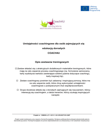 Umiejętności coachingowe dla osób zajmujących się edukacją dorosłych COACH4U Opis zestawów treningowych Zestaw składać się z atrakcyjnych dodatkowych materiałów treningowych, które mają na celu wsparcie procesu coachingowego (np. formularze samooceny, karty wydobycia wartości zawierające solidne pytania dotyczące coachingu, karty inspiracji itp). Zestaw coachingowy powinien być zabawną i inspirującą pomocą, która ma na celu wsparcie osób, które chcą wykorzystać umiejętności coachingowe z podopiecznymi i/lub współpracownikami. Grupa docelowa składa się z dorosłych zajmujących się nauczaniem, którzy interesują się coachingiem, a także trenerów, którzy szukają inspirujących narzędzi. Projekt nr: 539839-LLP-1-2013-1-UK-GRUNDTVIG-GMP „Projekt został zrealizowany przy wsparciu Komisji Europejskiej. Niniejsza publikacja [komunikacja] odzwierciedla jedynie stanowisko jej autora i Komisja Europejska nie ponosi odpowiedzialności za umieszczoną w nich zawartość merytoryczną.” Cele SMART — skonkretyzowane, mierzalne, akceptowalne, realne, terminowe Poniżej znajdują się elementy skutecznego celu – celu, który opisuje normy zachowań, które określają, jak wygląda „odpowiednie zachowanie”. Akronim SMART pomoże nam zapamiętać te elementy. Skonkretyzowany miało miejsce. Cel powinien określać konkretne działanie lub zdarzenie, które będzie Mierzalny Cel i jego korzyści powinny być wymierne. Akceptowalny Cel powinno się osiągnąć przy dostępnych zasobach. Realny Cel powinien wymagać od Ciebie określenia jego prawdopodobieństwa. Terminowy Cel powinien określać okres, w którym zostanie osiągnięty. Oto kilka wskazówek, które Ci w ustaleniu skutecznego celu: 1. Opracuj kilka celów. Mając listę od pięciu do siedmiu elementów, możesz pracować nad nimi przez pewien okres. 2. Określone cele to deklaracje intencji, a nie pozycje na liście życzeń. Stwierdzenie „chcę złożyć podania do trzech szkół” nie jest wystarczająco silne. Stwierdzenie „złożę podania do trzech szkół” określa zamiar i jest silne. 3. Do każdego celu dopisz datę. Określ co i kiedy zamierzasz osiągnąć. Dobra lista powinna zawierać kilka krótkoterminowych i kilka długoterminowych celów. Możesz określić kilka celów na rok i kilka na odstępy dwóch lub trzech miesięcy. 4. Być konkretne. „Znaleźć pracę” jest zbyt ogólne — lepsze jest: „znaleźć i zbadać pięć ofert pracy przed końcem miesiąca”. Czasami bardziej ogólny cel może być lepszy dla długoterminowego celu, możesz zidentyfikować kilka bardziej konkretnych celów, które pozwolą Ci go osiągnąć. Projekt nr: 539839-LLP-1-2013-1-UK-GRUNDTVIG-GMP „Projekt został zrealizowany przy wsparciu Komisji Europejskiej. Niniejsza publikacja [komunikacja] odzwierciedla jedynie stanowisko jej autora i Komisja Europejska nie ponosi odpowiedzialności za umieszczoną w nich zawartość merytoryczną.” 5. Podziel się swoimi celami z kimś, kogo interesuje, czy je osiągniesz. Przedstaw swoje zamiary rodzicom, najlepszemu przyjacielowi, czy nauczycielce — pomoże Ci to osiągnąć sukces. 6. Zapisz swoje cele i połóż je w widocznym miejscu. Im częściej czytasz listę, tym więcej celów uda Ci się osiągnąć. 7. Przeglądaj i weryfikuj listę. Eksperymentuj z różnymi sposobami określania celów. Osiąganie celów poprawia się z praktyką, więc nie bój się nimi bawić. Załącznik: Cele SMART — skonkretyzowane, mierzalne, akceptowalne, realne, terminowe Projekt nr: 539839-LLP-1-2013-1-UK-GRUNDTVIG-GMP „Projekt został zrealizowany przy wsparciu Komisji Europejskiej. Niniejsza publikacja [komunikacja] odzwierciedla jedynie stanowisko jej autora i Komisja Europejska nie ponosi odpowiedzialności za umieszczoną w nich zawartość merytoryczną.” Gibbs 1988 Graham Gibbs przedstawia etapy w pełni zbudowanej analizy w następujący sposób: (Wstępne doświadczenia) Opis: „Co się stało? Nie osądzaj jeszcze, ani nie wyciągaj wniosków, po prostu opisz.” Uczucia: „Jakie były Twoje reakcje i uczucia? Ponownie nie przechodź jeszcze do ich analizy.” Ocena: „Co było złe lub dobre w tym doświadczeniu? Dokonaj oceny wartości.” Analiza: „Co może oznaczać sytuacja?” Użyj pomysłów spoza tego doświadczenia do pomocy.” „Co naprawdę się działo?” „Czy doświadczenia innych osób były podobne lub różne w istotny sposób?” Wnioski (ogólne): „Co można wywnioskować, w sensie ogólnym, z tych doświadczeń i jaką analizę można podjąć?” Wnioski (szczegółowe): „Co można wywnioskować z Twojej konkretnej, wyjątkowej, osobistej sytuacji lub sposobu działania?” Osobiste plany działania: „Co następnym razem zamierzasz robić inaczej w sytuacji tego typu?” „Jakie kroki zamierzasz podjąć w oparciu o to, czego się nauczyłeś/aś?” Projekt nr: 539839-LLP-1-2013-1-UK-GRUNDTVIG-GMP „Projekt został zrealizowany przy wsparciu Komisji Europejskiej. Niniejsza publikacja [komunikacja] odzwierciedla jedynie stanowisko jej autora i Komisja Europejska nie ponosi odpowiedzialności za umieszczoną w nich zawartość merytoryczną.” Sugestie Gibbsa często określane są jako cykl refleksji Gibbsa lub model refleksji Gibbsa. (1988), można je uprościć w sześć różnych etapów: Opis Uczucia Ocena Analiza Wnioski Plan działania Projekt nr: 539839-LLP-1-2013-1-UK-GRUNDTVIG-GMP „Projekt został zrealizowany przy wsparciu Komisji Europejskiej. Niniejsza publikacja [komunikacja] odzwierciedla jedynie stanowisko jej autora i Komisja Europejska nie ponosi odpowiedzialności za umieszczoną w nich zawartość merytoryczną.” Załącznik: Cele SMART — skonkretyzowane, mierzalne, akceptowalne, realne, terminowe Definicja celu: Co muszę zrobić, aby osiągnąć ten cel? Projekt nr: 539839-LLP-1-2013-1-UK-GRUNDTVIG-GMP „Projekt został zrealizowany przy wsparciu Komisji Europ