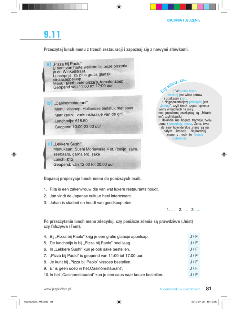 KUCHNIA I JEDZENIE 9.11 Przeczytaj lunch menu z trzech restauracji i zapoznaj się z nowymi słówkami. a) „Pizza bij Paolo” pizzeria U bent van harte welkom bij onze t. traa kels Win in de Lunchprijs: €5 plus gratis glaasje sinaasappelsap atensoep Menu: allerhande pizza’s, tomuur Geopend van 11:00 tot 17:00 b) „Casinorestaurant” Menu: vissoep, Hollandse biefstuk met saus naar keuze, varkenshaasje van de grill Lunchprijs: €18.50 Geopend 10:00-23:00 uur y Cz , esz wi że... • W kuchni holenderskiej jest wiele potraw i przekąsek z ryb. • Najpopularniejszą przekąską jest „haring”, czyli śledź, często sprzedawany w budkach na ulicy. Inną popularną przekąską są „frikadelen”, czyli klopsiki. • Holandia ma bogatą tradycję związaną z produkcją serów. Żółte, twarde sery holenderskie znane są na całym świecie. Najbardziej znane z nich to Gouda i Edammer. c) „Lekkere Sushi” Menukaart: Sushi Moriawase 4 st. (tonijn, zalm, zeebaars, garnalen), sake Lunch: €12 Geopend: van 12:00 tot 20:00 uur Dopasuj propozycje lunch menu do poniższych osób. 1. Rita is een zakenvrouw die van wat luxere restaurants houdt. 2. Jan vindt de Japanse cultuur heel interessant. 3. Johan is student en houdt van goedkoop eten. 1. .... 2. .... 3. .... Po przeczytaniu lunch menu zdecyduj, czy poniższe zdania są prawdziwe (Juist) czy fałszywe (Fout). 4. Bij „Pizza bij Paolo” krijg je een gratis glaasje appelsap. J/F 5. De lunchprijs is bij „Pizza bij Paolo” heel laag. J/F 6. In „Lekkere Sushi” kun je ook sake bestellen. J/F 7. „Pizza bij Paolo” is geopend van 11:00 tot 17:00 uur. J/F 8. Je kunt bij „Pizza bij Paolo” vissoep bestellen. J/F 9. Er is geen soep in het„Casinorestaurant”. J/F 10. In het „Casinorestaurant” kun je een saus naar keuze bestellen. J/F www.jezykiobce.pl niderlandzki_MK.indd 81 Niderlandzki w ćwiczeniach 81 2010-07-08 10:12:36 KUCHNIA I JEDZENIE 9.12 Połącz zwroty i wyrażenia niderlandzkie z ich polskimi odpowiednikami. 1. Heeft u al een keuze kunnen maken? a) To jest zbyt słodkie. 2. Excuseer, mag ik ...... bestellen? b) Smacznego! 3. Het is te zoet. c) To jest zbyt kwaśne. 4. Ik vind het lekker! d) Smakuje mi to! 5. Het is te zuur. e) “Musztarda po obiedzie” 6. Eet smakelijk! f) To jest zbyt słone. 7. Bedankt! Smakelijk eten! g) Dziękuję, ale nie jem mięsa. Jestem wegetarianinem/ką. 8. “Mosterd na de maaltijd” h) Dziękuję! Smacznego! 9. Het is te zout. i) Przepraszam, czy mogę zamówić...? 10. Dank je, maar ik eet geen vlees. j) Czy zdecydował/a już pan/pani? Ik ben vegetariër. 1. ..... 2. ..... 3. ..... 4. ..... 5. ..... 6. ..... 7. ..... 8. ..... 9. ..... 10. ..... 9.13 Po zapoznaniu się ze słownictwem z ćwiczenia 9.12 uzupełnij podane zdania odpowiednimi wyrazami. 1. ”Excuseer, heeft u al ........................................ ? 2. - “Eet smakelijk!”. - ”Bedankt, ........................................ eten!” 3. Deze appel is nog groen. Hij is te ........................................ . 4. Nu kunnen we er niets meer mee doen. Het is ........................................ na de maaltijd. 5. ........................................ , mag ik een rekening, alstublieft? 6. Mijn friet is te ........................................ . Ik kan ze echt niet eten. 7. Ik vind dit gerecht zo ........................................ ! 8. Ik eet geen vlees. Ik ben ........................................ . 9. Kelner, ik wil graag soep ........................................ . 10. Dit koekje is te ........................................ voor mij. Ik hou niet zo van suiker. 82 Niderlandzki w ćwiczeniach niderlandzki_MK.indd 82 2010-07-08 10:12:38