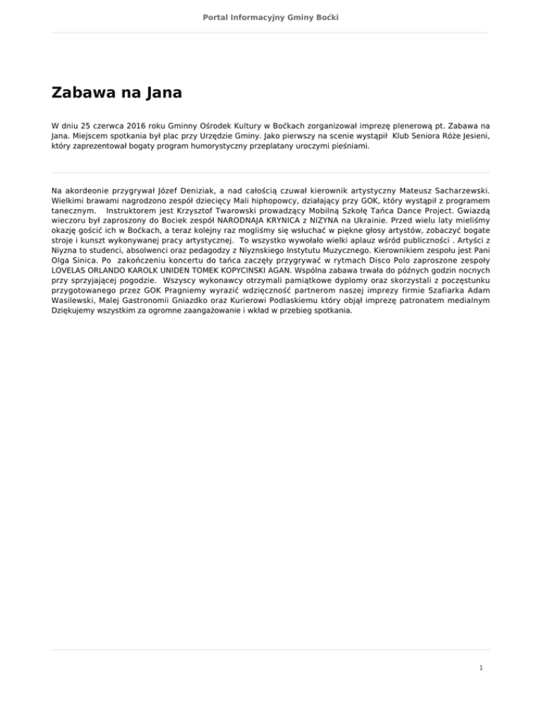 Portal Informacyjny Gminy Boćki Zabawa na Jana W dniu 25 czerwca 2016 roku Gminny Ośrodek Kultury w Boćkach zorganizował imprezę plenerową pt. Zabawa na Jana. Miejscem spotkania był plac przy Urzędzie Gminy. Jako pierwszy na scenie wystąpił Klub Seniora Róże Jesieni, który zaprezentował bogaty program humorystyczny przeplatany uroczymi pieśniami. Na akordeonie przygrywał Józef Deniziak, a nad całością czuwał kierownik artystyczny Mateusz Sacharzewski. Wielkimi brawami nagrodzono zespół dziecięcy Mali hiphopowcy, działający przy GOK, który wystąpił z programem tanecznym. Instruktorem jest Krzysztof Twarowski prowadzący Mobilną Szkołę Tańca Dance Project. Gwiazdą wieczoru był zaproszony do Bociek zespół NARODNAJA KRYNICA z NIZYNA na Ukrainie. Przed wielu laty mieliśmy okazję gościć ich w Boćkach, a teraz kolejny raz mogliśmy się wsłuchać w piękne głosy artystów, zobaczyć bogate stroje i kunszt wykonywanej pracy artystycznej. To wszystko wywołało wielki aplauz wśród publiczności . Artyści z Niyzna to studenci, absolwenci oraz pedagodzy z Niyznskiego Instytutu Muzycznego. Kierownikiem zespołu jest Pani Olga Sinica. Po zakończeniu koncertu do tańca zaczęły przygrywać w rytmach Disco Polo zaproszone zespoły LOVELAS ORLANDO KAROLK UNIDEN TOMEK KOPYCINSKI AGAN. Wspólna zabawa trwała do późnych godzin nocnych przy sprzyjającej pogodzie. Wszyscy wykonawcy otrzymali pamiątkowe dyplomy oraz skorzystali z poczęstunku przygotowanego przez GOK Pragniemy wyrazić wdzięczność partnerom naszej imprezy firmie Szafiarka Adam Wasilewski, Malej Gastronomii Gniazdko oraz Kurierowi Podlaskiemu który objął imprezę patronatem medialnym Dziękujemy wszystkim za ogromne zaangażowanie i wkład w przebieg spotkania. 1