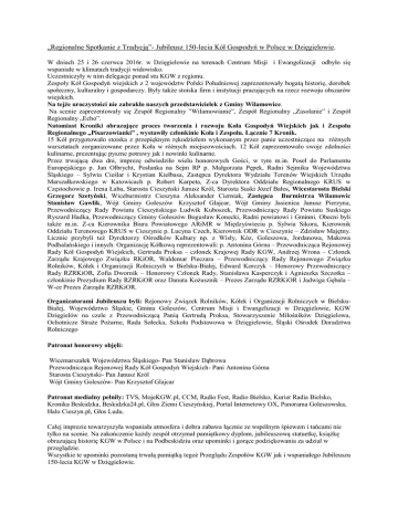 „Regionalne Spotkanie z Tradycją”- Jubileusz 150-lecia Kół Gospodyń w Polsce w Dzięgielowie. W dniach 25 i 26 czerwca 2016r. w Dzięgielowie na terenach Centrum Misji i Ewangelizacji odbyło się wspaniałe w klimatach tradycji widowisko. Uczestniczyły w nim delegacje ponad stu KGW z regionu. Zespoły Kół Gospodyń wiejskich z 2 województw Polski Południowej zaprezentowały bogatą historię, dorobek społeczny, kulturalny i gospodarczy. Były także stoiska firm i instytucji pracujących na rzecz rozwoju obszarów wiejskich. Na tejże uroczystości nie zabrakło naszych przedstawicielek z Gminy Wilamowice. Na scenie zaprezentowały się Zespół Regionalny ”Wilamowianie”, Zespół Regionalny „Zasolanie” i Zespół Regionalny „Echo”. Natomiast Kroniki obrazujące proces tworzenia i rozwoju Koła Gospodyń Wiejskich jak i Zespołu Regionalnego „Pisarzowianki” , wystawiły członkinie Koła i Zespołu. Łącznie 7 Kronik. 15 Kół przygotowało stoiska z przepięknym rękodziełem wykonanym przez panie uczestniczące na różnych warsztatach zorganizowane przez Koła w różnych miejscowościach. 12 Kół zaprezentowało swoje zdolności kulinarne, prezentując pyszne potrawy jak i nowinki kulinarne. Przez trwającą dwa dni, imprezę odwiedziło wielu honorowych Gości, w tym m.in. Poseł do Parlamentu Europejskiego p. Jan Olbrycht, Posłanka na Sejm RP p. Małgorzata Pępek, Radni Sejmiku Województwa Śląskiego – Sylwia Cieślar i Krystian Kiełbasa, Zastępca Dyrektora Wydziału Terenów Wiejskich Urzędu Marszałkowskiego w Katowicach p. Robert Karpeta, Z-ca Dyrektora Oddziału Regionalnego KRUS w Częstochowie p. Irena Łaba, Starosta Cieszyński Janusz Król, Starosta Suski Józef Bałos, Wicestarosta Bielski Grzegorz Szetyński, Wiceburmistrz Cieszyna Aleksander Cierniak, Zastępca Burmistrza Wilamowic Stanisław Gawlik, Wójt Gminy Goleszów Krzysztof Glajcar, Wójt Gminy Jasienica Janusz Pierzyna, Przewodniczący Rady Powiatu Cieszyńskiego Ludwik Kuboszek, Przewodniczący Rady Powiatu Suskiego Ryszard Hadka, Przewodniczący Gminy Goleszów Bogusław Konecki, Radni powiatowi i Gminni. Obecni byli także m.in. Z-ca Kierownika Biura Powiatowego ARiMR w Międzyświeciu p. Sylwia Sikora, Kierownik Oddziału Terenowego KRUS w Cieszynie p. Lucyna Czech, Kierownik ODR w Cieszynie – Zdzisław Majętny. Licznie przybyli też Dyrektorzy Ośrodków Kultury np. z Wisły, Kóz, Goleszowa, Jordanowa, Makowa Podhalańskiego i innych. Organizację Kółkową reprezentowali: p. Antonina Górna – Przewodnicząca Rejonowej Rady Kół Gospodyń Wiejskich, Gertruda Proksa – członek Krajowej Rady KGW, Andrzej Wrona – Członek Zarządu Krajowego Związku RKiOR, Waldemar Pieczara – Przewodniczący Rady Rejonowego Związku Rolników, Kółek i Organizacji Rolniczych w Bielsku-Białej, Edward Korczyk – Honorowy Przewodniczący Rady RZRKiOR, Zofia Dwornik – Honorowy Członek Rady, Stanisława Kasperczyk i Agnieszka Szczotka – członkinie Prezydium Rady RZRKiOR oraz Danuta Kożusznik – Prezes Zarządu RZRKiOR i Jadwiga Gębala – W-ce Prezes Zarządu RZRKiOR. Organizatorami Jubileuszu byli: Rejonowy Związek Rolników, Kółek i Organizacji Rolniczych w BielskuBiałej, Województwo Śląskie, Gmina Goleszów, Centrum Misji i Ewangelizacji w Dzięgielowie, KGW Dzięgielów na czele z Przewodniczącą Panią Gertrudą Proksa, Stowarzyszenie Miłośników Dzięgielowa, Ochotnicze Straże Pożarne, Rada Sołecka, Szkoła Podstawowa w Dzięgielowie, Śląski Ośrodek Doradztwa Rolniczego Patronat honorowy objęli: Wicemarszałek Województwa Śląskiego- Pan Stanisław Dąbrowa Przewodnicząca Rejonowej Rady Kół Gospodyń Wiejskich- Pani Antonina Górna Starosta Cieszyński- Pan Janusz Król Wójt Gminy Goleszów- Pan Krzysztof Glajcar Patronat medialny pełniły: TVS, MojeKGW.pl, CCM, Radio Fest, Radio Bielsko, Kurier Radia Bielsko, Kronika Beskidzka, Beskidzka24.pl, Głos Ziemi Cieszyńskiej, Portal Internetowy OX, Panorama Goleszowska, Halo Cieszyn.pl, Głos Ludu. Całej imprezie towarzyszyła wspaniała atmosfera i dobra zabawa łącznie ze wspólnym śpiewem i tańcami nie tylko na scenie. Na zakończenie każdy zespół otrzymał pamiątkowy dyplom, jubileuszową statuetkę, książkę obrazującą historię KGW w Polsce i na Podbeskidziu oraz upominki i gorące podziękowania za udział w przeglądzie. Wszystkie te upominki pozostaną trwałą pamiątką tegoż Przeglądu Zespołów KGW jak i wspaniałego Jubileuszu 150-lecia KGW w Dzięgielowie. Wszystkim organizatorom należą się słowa uznania za trud pracy włożony, by ta wspaniała uroczystość mogła odbyć się z naszym udziałem. Członkinie naszego Koła w tym dniu spędziły wspaniałą piknikową- niedzielę.. Syte wrażeń i przepysznego jedzenia wróciłyśmy do Pisarzowic. Przewodnicząca KGW Pisarzowice C.Puzoń