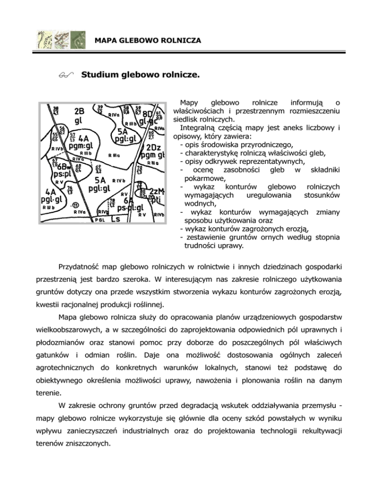 MAPA GLEBOWO ROLNICZA Studium glebowo rolnicze. Mapy glebowo rolnicze informują o właściwościach i przestrzennym rozmieszczeniu siedlisk rolniczych. Integralną częścią mapy jest aneks liczbowy i opisowy, który zawiera: - opis środowiska przyrodniczego, - charakterystykę rolniczą właściwości gleb, - opisy odkrywek reprezentatywnych, - ocenę zasobności gleb w składniki pokarmowe, - wykaz konturów glebowo rolniczych wymagających uregulowania stosunków wodnych, - wykaz konturów wymagających zmiany sposobu użytkowania oraz - wykaz konturów zagrożonych erozją, - zestawienie gruntów ornych według stopnia trudności uprawy. Przydatność map glebowo rolniczych w rolnictwie i innych dziedzinach gospodarki przestrzenią jest bardzo szeroka. W interesującym nas zakresie rolniczego użytkowania gruntów dotyczy ona przede wszystkim stworzenia wykazu konturów zagrożonych erozją, kwestii racjonalnej produkcji roślinnej. Mapa glebowo rolnicza służy do opracowania planów urządzeniowych gospodarstw wielkoobszarowych, a w szczególności do zaprojektowania odpowiednich pól uprawnych i płodozmianów oraz stanowi pomoc przy doborze do poszczególnych pól właściwych gatunków i odmian roślin. Daje ona możliwość dostosowania ogólnych zaleceń agrotechnicznych do konkretnych warunków lokalnych, stanowi też podstawę do obiektywnego określenia możliwości uprawy, nawożenia i plonowania roślin na danym terenie. W zakresie ochrony gruntów przed degradacją wskutek oddziaływania przemysłu mapy glebowo rolnicze wykorzystuje się głównie dla oceny szkód powstałych w wyniku wpływu zanieczyszczeń industrialnych oraz do projektowania technologii rekultywacji terenów zniszczonych. Mapę glebowo-rolniczą w skali 1:25 000 powiększamy do skali 1: 5 000 i zaznaczamy na niej: kompleksy rolniczej przydatności gleb, typy i podtypy gleb, gatunki gleb Gatunki gleb wyróżniamy kolorami (szrafem). Legenda: pgl - .... gl - .... pgm - .... ps - .... pl. - .... Ls - .... 2 gl. Bw kompl. rol. prz. typ i podtyp gl Oznaczenia do mapy glebowo-rolniczej (legenda): Kompleksy rolniczej przydatności gleb: 1 2 3 4 5 6 7 8 9 pszenny bardzo dobry pszenny dobry pszenny wadliwy żytni (żytnio-ziemniaczany) bardzo dobry żytni (żytnio-ziemniaczany) dobry żytni (żytnio-ziemniaczany) słaby żytnio-łubinowy zbożowo-pastewny mocny zbożowo-pastewny słaby 10 11 12 13 14 1z 2z 3z RN pszenny dobry śródgórski i podgórski zbożowy górski zbożowo-pastewny górski owsiano-pastewny górski gleby orne przeznaczone pod użytki zielone użytki zielone bardzo dobre i dobre użytki zielone średnie użytki zielone słabe i bardzo słabe gleby rolniczo nieprzydatne (pod zalesienie) Inne elementy treści mapy: Ls W WN lasy wody wody nieużytki N Tz PGL nieużytki rolnicze tereny zabudowane (o zwartej zabudowie) Państwowe Gospodarstwa Leśne Typy i podtypy gleb: bez znaku gleby o niewykształconym profilu A B gleby bielicowe i pseudobielicowe gleby brunatne właściwe Bw gleby brunatne wyługowane i brunatne kwaśne C Cz Cd D Dz F czarnoziemy właściwe czarnoziemy zdegradowane i gleby szare czarnoziemy deluwialne (namyte) czarne ziemie właściwe czarne ziemie zdegradowane i gleby szare mady FG G Em t Et m T M R Rb Rc Rd mady glejowe gleby glejowe gleby mułowo-torfowe gleby torfowo-mułowe gleby torfowe i murszowo-torfowe gleby murszowo mineralne i murszowate rędziny o niewykształconym profilu rędziny brunatne rędziny próchnicze (czarnoziemy i szare) rędziny deluwialne (namyte) Gatunki gleb (skład mechaniczny): żp żg pl żwiry piaszczyste ps piaski słabo gliniaste li lessy i utwory lessowate ilaste (gleby lessowe i lessowate mocne) pgl pg m gl gs gc piaski gliniaste lekkie ip i iły pylaste (gleby ilaste ciężkie) l s c rędziny lekkie żwiry gliniaste piaski luźne płz płi ls piaski gliniaste mocne gliny lekkie gliny średnie gliny ciężkie pyły zwykłe (gleby pyłowe lekkie i średnie) pyły ilaste (gleby pyłowe mocne) lessy i utwory lessowate zwykłe (gleby lessowe i lessowate lekkie i średnie) iły (gleby ilaste bardzo ciężkie) rędziny średnie rędziny ciężkie Rodzaje gleb: l ◊ d n utwory lessowe i lessowate pł utwory pyłowe pochodzenia wodnego ∆ utwory ze skał magmowych utwory ze skał osadowych o spoiwie niewęglanowym v wł utwory ze skał osadowych o spoiwie węglanowym rędziny gipsowe utwory deluwialne (namyte) torfy niskie torfy przejściowe i wysokie wapno łąkowe Oznaczenia szkieletowości: skład mechaniczny bez znaku podkreślenie składu mechanicznego jedną kreską podkreślenie składu mechanicznego dwoma kreską - gs gs sz r sk gleba bezszkieletowa (poniżej 10% szkieletu) gleba słabo szkieletowa (10-25% szkieletu) gleba silnie szkieletowa (25-50% szkieletu) gleba b. silnie szkieletowa (50-75% szkieletu) rumosz skalny (powyżej 75% szkieletu) gleba skalista (lita skała) Znaki dodatkowe: w skała węglanowa w podłożu gleb niecałkowitych p oznaczenie pylastości gleb - zmiana składu mechanicznego występuje na głębokości do 25 cm 10 ≈ . zmiana składu mechanicznego występuje na głębokości 25 - 50 cm 13 7.2 nr konturu powierzchnia w ha : zmiana składu mechanicznego występuje na głębokości 50 - 100 cm () rędziny mieszane oznacza się przez umieszczenie symbolu gatunku w nawiasie . .. zmiana składu mechanicznego występuje na głębokości 100 - 150 cm O 7 O . lokalizacja i nr odkrywki glebowej lokalizacja i nr odkrywki glebowej, z której pobrano próbki do analiz gleba podlega zlewom rzecznym .