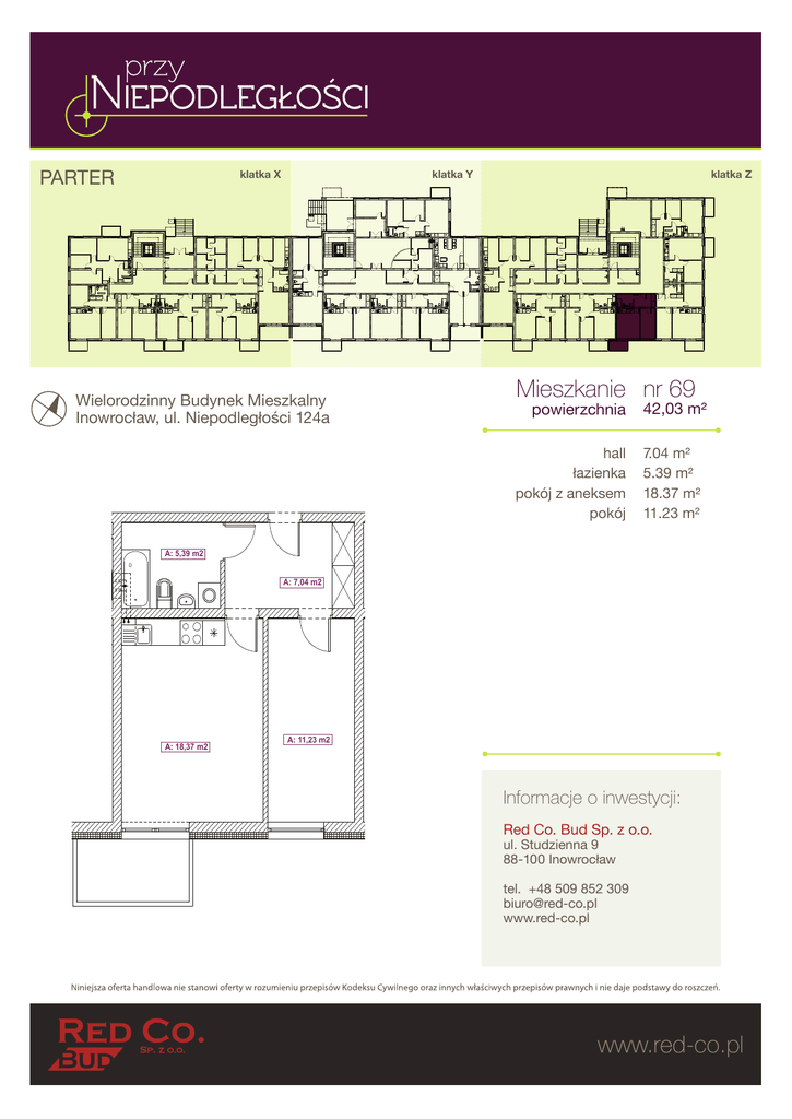 A: 8,74 m2 A: 4,61 m2 0 w w k k 0 w PARTER klatka X klatka Y klatka Z A: 20,92 m2 klatka Z A: 5,49 m2 k w w A: 10,48 m2 pom.gosp. wy G2 WielorodzinnygresBudynek Mieszkalny A: 6,76 m2 Inowrocław, ul. Niepodległości 124a A: 4,53 m2 Mieszkanie nr 69 powierzchnia 42,03 m� w k korytarz gres A: 66,29 m2 na G2 A: 4,71 m2 hall łazienka pokój z aneksem pokój A: 11,19 m2 k w 7.04 m� 5.39 m� 18.37 m� 11.23 m� A: 5,39 m2 A: 6,31 m2 0 0 0 w w w w A: 8,83 m2 A: 7,04 m2 k k k 0 w A: 16,38 m2 A: 18,37 m2 A: 11,23 m2 A: 11,81 m2 A: 23,39 m2 Informacje o inwestycji: Red Co. Bud Sp. z o.o. ul. Studzienna 9 88-100 Inowrocław tel. +48 509 852 309 [email protected] www.red-co.pl www.red-co.pl