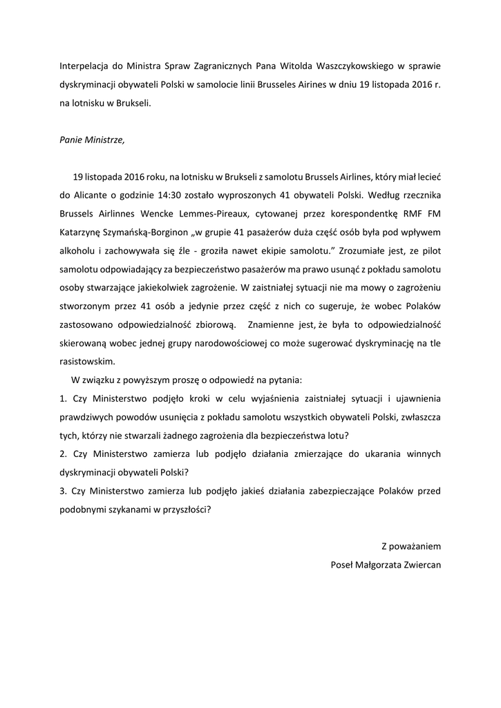 Interpelacja do Ministra Spraw Zagranicznych Pana Witolda Waszczykowskiego w sprawie dyskryminacji obywateli Polski w samolocie linii Brusseles Airines w dniu 19 listopada 2016 r. na lotnisku w Brukseli. Panie Ministrze, 19 listopada 2016 roku, na lotnisku w Brukseli z samolotu Brussels Airlines, który miał lecieć do Alicante o godzinie 14:30 zostało wyproszonych 41 obywateli Polski. Według rzecznika Brussels Airlinnes Wencke Lemmes-Pireaux, cytowanej przez korespondentkę RMF FM Katarzynę Szymańską-Borginon „w grupie 41 pasażerów duża część osób była pod wpływem alkoholu i zachowywała się źle - groziła nawet ekipie samolotu.” Zrozumiałe jest, ze pilot samolotu odpowiadający za bezpieczeństwo pasażerów ma prawo usunąć z pokładu samolotu osoby stwarzające jakiekolwiek zagrożenie. W zaistniałej sytuacji nie ma mowy o zagrożeniu stworzonym przez 41 osób a jedynie przez część z nich co sugeruje, że wobec Polaków zastosowano odpowiedzialność zbiorową. Znamienne jest, że była to odpowiedzialność skierowaną wobec jednej grupy narodowościowej co może sugerować dyskryminację na tle rasistowskim. W związku z powyższym proszę o odpowiedź na pytania: 1. Czy Ministerstwo podjęło kroki w celu wyjaśnienia zaistniałej sytuacji i ujawnienia prawdziwych powodów usunięcia z pokładu samolotu wszystkich obywateli Polski, zwłaszcza tych, którzy nie stwarzali żadnego zagrożenia dla bezpieczeństwa lotu? 2. Czy Ministerstwo zamierza lub podjęło działania zmierzające do ukarania winnych dyskryminacji obywateli Polski? 3. Czy Ministerstwo zamierza lub podjęło jakieś działania zabezpieczające Polaków przed podobnymi szykanami w przyszłości? Z poważaniem Poseł Małgorzata Zwiercan