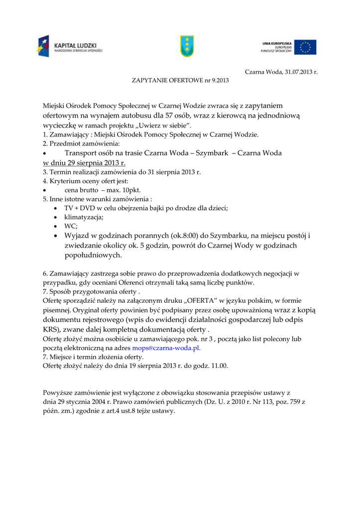 Czarna Woda, 31.07.2013 r. ZAPYTANIE OFERTOWE nr 9.2013 Miejski Ośrodek Pomocy Społecznej w Czarnej Wodzie zwraca się z zapytaniem ofertowym na wynajem autobusu dla 57 osób, wraz z kierowcą na jednodniową wycieczkę w ramach projektu „Uwierz w siebie”. 1. Zamawiający : Miejski Ośrodek Pomocy Społecznej w Czarnej Wodzie. 2. Przedmiot zamówienia:  Transport osób na trasie Czarna Woda – Szymbark – Czarna Woda w dniu 29 sierpnia 2013 r. 3. Termin realizacji zamówienia do 31 sierpnia 2013 r. 4. Kryterium oceny ofert jest:  cena brutto – max. 10pkt. 5. Inne istotne warunki zamówienia :  TV + DVD w celu obejrzenia bajki po drodze dla dzieci;  klimatyzacja;  WC;  Wyjazd w godzinach porannych (ok.8:00) do Szymbarku, na miejscu postój i zwiedzanie okolicy ok. 5 godzin, powrót do Czarnej Wody w godzinach popołudniowych. 6. Zamawiający zastrzega sobie prawo do przeprowadzenia dodatkowych negocjacji w przypadku, gdy oceniani Oferenci otrzymali taką samą liczbę punktów. 7. Sposób przygotowania oferty . Ofertę sporządzić należy na załączonym druku „OFERTA” w języku polskim, w formie pisemnej. Oryginał oferty powinien być podpisany przez osobę upoważnioną wraz z kopią dokumentu rejestrowego (wpis do ewidencji działalności gospodarczej lub odpis KRS), zwane dalej kompletną dokumentacją oferty . Ofertę złożyć można osobiście u zamawiającego pok. nr 3 , pocztą jako list polecony lub pocztą elektroniczną na adres [email protected]. 7. Miejsce i termin złożenia oferty. Ofertę złożyć należy do dnia 19 sierpnia 2013 r. do godz. 11.00. Powyższe zamówienie jest wyłączone z obowiązku stosowania przepisów ustawy z dnia 29 stycznia 2004 r. Prawo zamówień publicznych (Dz. U. z 2010 r. Nr 113, poz. 759 z późn. zm.) zgodnie z art.4 ust.8 tejże ustawy. OFERTA Wynajem autobusu z kierowcą na jednodniową wycieczkę. …………………….. …………………… Miejscowość data …………………………………. oznaczenie Oferenta /nazwa siedziba i adres, ewentualnie czytelna pieczątka/ oświadczam (-y), iż zadanie opisane w zapytaniu ofertowym MOPS Czarna Woda z dnia ……/..…../……… wykonam (-y) na warunkach zgodnych z treścią przedmiotowego zapytania przy zastosowaniu przedstawionych poniżej kryteriów: CENA Wyposażenie autobusu Załącznik: 1. kopia wpisu do ewidencji działalności gospodarczej lub kopia odpisu KRS,