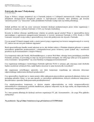 Artykuł pobrany ze strony http://www.ekonsument.pl/news-show-225.php Fairtrade dla mas? Podyskutuj 27.02.2008, Maria Żyjąc w Polsce i mogąc zaopatrzyć się w Fairtrade jedynie w 2 sklepach internetowych i kilku niszowych sklepikach ekologicznych dostępnych jedynie w największych miastach, takie problemy jak kwestia "przechwycenia" czy "nasycenia" rynku produktami Fairtrade wydaje nam się totalną abstrakcją. Jednak problem ten stał się coraz szerszym tematem dyskusji podejmowanym przez różne organizacje i podmioty związane z rynkiem Fairtrade w USA czy Europie Zachodniej. Kwestie te dobrze obrazuje opublikowany właśnie na portalu ngo.pl artykuł Wiara w sprawiedliwą kawę opowiadający o ogromnym zaangażowaniu luteranów w rozwój i promocje Fairtrade w USA. Kiedy w 1996 Luteranie zaczynali swoją walkę o sprawiedliwszy świat nikt praktycznie nie słyszał o Fairtrade. Czy po ponad 10 latach zmagań setek, a może nawet tysięcy organizacji na świecie zaangażowanych w rozwój FT, sukces ten nie stoi pod znakiem zapytania? Ruch sprawiedliwego handlu został założony po to, aby drobni rolnicy z Południa skupieni głównie w ramach niewielkich spółdzielni producenckich i zmarginalizowani przez światowy rynek zyskali siłę i możliwość przebicia się do konsumentów z krajów Północy. Czy korporacje takie jak Nestlé, McDonald’s, a nawet Wal-Mart, oferując kawę posiadającą certyfikat Fairtrade, pomimo, że powodują że staje się ona powszechnie dostępna, nie robią tego tylko po to by poprawić swój wizerunek i "przypodobać" się coraz bardziej wymagającym konsumentom? Czy organizacja metkująca i kontrolująca Fairtrade (głównie FLO) w sytuacji, gdy znaczącą część dochodu będzie uzyskiwać od dużych firm, nadal będzie stosować te same kryteria dla wszystkich? Jak organizacja certyfikująca sprawdzi, czy duże korporacje wypełniają jej zalecenia dotyczące odpowiedniego traktowania drobnych producentów? Czy sprawiedliwy handel jest w stanie pomóc słabo opłacanym pracownikom ogromnych plantacji, którzy nie posiadają udziałów firmy, w ten sam sposób, co niewielkim spółdzielniom, których członkowie mają prawo decydowania o sposobie funkcjonowania przedsiębiorstwa? Czy międzynarodowe korporacje, w dużym stopniu odpowiedzialne za wiele niesprawiedliwości zauważalnych w dzisiejszym systemie handlowym, poprzez włączenie się do tego ruchu, nie doprowadzą do zniszczenia wiarygodności FT? Te i inne pytania skłaniają do dyskusji zarówno organizacje FT, jak i konsumentów - do czego Was głęboko zachęcamy! Na podstawie: Ngo.pl (http://wiadomosci.ngo.pl/wiadomosci/333989.html)