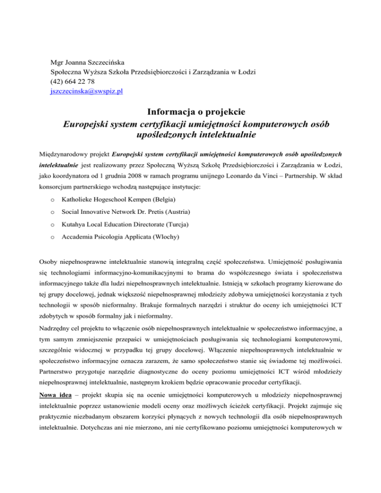 Mgr Joanna Szczecińska Społeczna WyŜsza Szkoła Przedsiębiorczości i Zarządzania w Łodzi (42) 664 22 78 [email protected] Informacja o projekcie Europejski system certyfikacji umiejętności komputerowych osób upośledzonych intelektualnie Międzynarodowy projekt Europejski system certyfikacji umiejętności komputerowych osób upośledzonych intelektualnie jest realizowany przez Społeczną WyŜszą Szkołę Przedsiębiorczości i Zarządzania w Łodzi, jako koordynatora od 1 grudnia 2008 w ramach programu unijnego Leonardo da Vinci – Partnership. W skład konsorcjum partnerskiego wchodzą następujące instytucje: o Katholieke Hogeschool Kempen (Belgia) o Social Innovative Network Dr. Pretis (Austria) o Kutahya Local Education Directorate (Turcja) o Accademia Psicologia Applicata (Wlochy) Osoby niepełnosprawne intelektualnie stanowią integralną część społeczeństwa. Umiejętność posługiwania się technologiami informacyjno-komunikacyjnymi to brama do współczesnego świata i społeczeństwa informacyjnego takŜe dla ludzi niepełnosprawnych intelektualnie. Istnieją w szkołach programy kierowane do tej grupy docelowej, jednak większość niepełnosprawnej młodzieŜy zdobywa umiejętności korzystania z tych technologii w sposób nieformalny. Brakuje formalnych narzędzi i struktur do oceny ich umiejętności ICT zdobytych w sposób formalny jak i nieformalny. Nadrzędny cel projektu to włączenie osób niepełnosprawnych intelektualnie w społeczeństwo informacyjne, a tym samym zmniejszenie przepaści w umiejętnościach posługiwania się technologiami komputerowymi, szczególnie widocznej w przypadku tej grupy docelowej. Włączenie niepełnosprawnych intelektualnie w społeczeństwo informacyjne oznacza zarazem, Ŝe samo społeczeństwo stanie się świadome tej moŜliwości. Partnerstwo przygotuje narzędzie diagnostyczne do oceny poziomu umiejętności ICT wśród młodzieŜy niepełnosprawnej intelektualnie, następnym krokiem będzie opracowanie procedur certyfikacji. Nowa idea – projekt skupia się na ocenie umiejętności komputerowych u młodzieŜy niepełnosprawnej intelektualnie poprzez ustanowienie modeli oceny oraz moŜliwych ścieŜek certyfikacji. Projekt zajmuje się praktycznie niezbadanym obszarem korzyści płynących z nowych technologii dla osób niepełnosprawnych intelektualnie. Dotychczas ani nie mierzono, ani nie certyfikowano poziomu umiejętności komputerowych w tej grupie docelowej, zwłaszcza w kontekście uznanych międzynarodowo systemów certyfikacji. Ten wynik wiąŜe się z drugim aspektem innowacyjności – nową metodą – nikt nie próbował jeszcze mierzyć umiejętności komputerowych tej grupy docelowej przy wykorzystaniu narzędzi on-line oraz w kontekście certyfikowanych egzaminów. Nowe narzędzie – projekt dostarczy młodym osobom niepełnosprawnym intelektualnie oraz szkołom narzędzie internetowe, przygotowane specjalnie na potrzeby projektu Easy ICT. Narzędzie zostanie opracowane w taki sposób, by posługiwać się nim mogły nawet osoby nieumiejące czytać. Rezultaty materialne wypracowane w projekcie: • Opis umiejętności komputerowych odpowiednich dla młodzieŜy niepełnosprawnej intelektualnie – zidentyfikowane i opisane umiejętności zostaną podzielone na grupy w zaleŜności od poziomu niepełnosprawności. • Internetowe narzędzie testujące – posiada następujące opcje: definiowanie kompetencji, tworzenie pytań testowych, przypisywanie pytań testowych do testu kompetencji (test kompetencji składa się z zestawu pytań, sprawdzającego daną kompetencję), przypisywanie testu kompetencji danemu kandydatowi. Test kompetencji będzie nadzorowany przez narzędzie testujące, z którego korzystać będą zarówno nauczyciele oceniający umiejętności komputerowe u młodych ludzi niepełnosprawnych intelektualnie, jak i osoby odpowiedzialne za prowadzenie egzaminów certyfikujących. • Platforma administracyjna – portal przygotowany w celu ułatwienia nauczycielom i administratorom pracy podczas procedur egzaminacyjnych oraz testów. Portal umoŜliwi wszystkim organizacjom rejestrację uczestników, wybór uczestników, przypisanie testów pojedynczym uczestnikom lub grupom uczestników, sporządzanie protokołów z egzaminów oraz przygotowywanie raportów z postępów poszczególnych uczestników. Portal ten będzie prowadzony jedynie w języku angielskim, więc niezbędna będzie podstawowa znajomość tego języka. • Dokumenty i procedury egzaminacyjne – pakiet procedur, których przestrzeganie będzie niezbędne podczas prowadzenia egzaminów oraz pakiet dokumentów, których uczestnicy będą uŜywali, by zarejestrować się na egzamin (formularz rejestracyjny, umowa, certyfikat etc.). • Rekomendacje potencjalnych ośrodków certyfikujących – pakiet kryteriów dla instytucji oraz przykłady potencjalnych organizacji certyfikujących, które prowadziłyby egzaminy w kaŜdym kraju partnerskim, definicja kryteriów wyboru: sektor, zasięg, związek z długoterminowymi grupami docelowymi. • Przewodnik Krok po kroku jak posługiwać się platformą EASY ICT Adres portalu do certyfikacji: http://certificate.easyict.eu/ Strona internetowa projektu: http://www.easyict.eu/