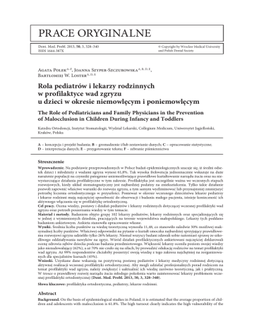 prace oryginalne Dent. Med. Probl. 2013, 50, 3, 328–340 ISSN 1644-387X © Copyright by Wroclaw Medical University and Polish Dental Society Agata PolekA–F, Joanna Szyper-SzczurowskaA, B, D, E, Bartłomiej W. LosterA, D, E Rola pediatrów i lekarzy rodzinnych w profilaktyce wad zgryzu u dzieci w okresie niemowlęcym i poniemowlęcym The Role of Pediatricians and Family Physicians in the Prevention of Malocclusion in Children During Infancy and Toddlers Katedra Ortodoncji, Instytut Stomatologii, Wydział Lekarski, Collegium Medicum, Uniwersytet Jagielloński, Kraków, Polska A – koncepcja i projekt badania; B – gromadzenie i/lub zestawianie danych; C – opracowanie statystyczne; D – interpretacja danych; E – przygotowanie tekstu; F – zebranie piśmiennictwa Streszczenie Wprowadzenie. Na podstawie przeprowadzonych w Polsce badań epidemiologicznych szacuje się, iż średni odsetek dzieci i młodzieży z wadami zgryzu wynosi 61,8%. Tak wysoka frekwencja jednoznacznie wskazuje na duże narażenie populacji na czynniki patogenne uniemożliwiające prawidłowe kształtowanie narządu żucia oraz na niewystarczające działania profilaktyczne w tym zakresie. Profilaktyka jest szczególnie ważna we wczesnych etapach rozwojowych, kiedy układ stomatognatyczny jest najbardziej podatny na zniekształcenia. Tylko takie działanie pozwoli zapewnić właściwe warunki do rozwoju zgryzu, a tym samym wyeliminować lub przynajmniej zmniejszyć potrzebę leczenia ortodontycznego w przyszłości. Ponieważ w okresie wczesnego dzieciństwa lekarze pediatrzy i lekarze rodzinni mają najczęściej sposobność do obserwacji i badania małego pacjenta, istnieje konieczność ich aktywnego włączania się w profilaktykę ortodontyczną. Cel pracy. Ocena wiedzy, postawy i działań pediatrów i lekarzy rodzinnych dotyczącej wczesnej profilaktyki wad zgryzu oraz potrzeb poszerzania wiedzy w tym temacie. Materiał i metody. Badaniem objęto grupę 102 lekarzy pediatrów, lekarzy rodzinnych oraz specjalizujących się w jednej z wymienionych dziedzin, pracujących na terenie województwa małopolskiego. Lekarzy tych poddano badaniom ankietowym. Ankieta stanowiła opracowanie własne. Wyniki. Średnia liczba punktów za wiedzę teoretyczną wynosiła 11,48, co stanowiło zaledwie 50% możliwej maksymalnej liczby punktów. Właściwej odpowiedzi na pytanie o kształt smoczka najbardziej sprzyjający prawidłowemu rozwojowi zgryzu udzieliło tylko 26% lekarzy. Niemal wszyscy badani zdawali sobie natomiast sprawę ze szkodliwego oddziaływania nawyków na zgryz. Wśród działań profilaktycznych ankietowani najczęściej deklarowali ocenę zdrowia zębów dziecka podczas badania przedmiotowego. Większość lekarzy oceniła poziom swojej wiedzy jako niezadowalający (62%), a aż 70% nie czuło się na siłach, by prowadzić edukację rodziców na temat profilaktyki wad zgryzu. Aż 99% respondentów chciałoby poszerzyć swoją wiedzę z tego zakresu najchętniej na zorganizowanych dla specjalistów kursach (45%). Wnioski. Uzyskane dane wskazują na pozytywną postawę pediatrów i lekarzy medycyny rodzinnej dotyczącą aktywnej realizacji wczesnej profilaktyki ortodontycznej. Aby mogli udzielać profesjonalnych porad rodzicom na temat profilaktyki wad zgryzu, należy zwiększyć i uaktualnić ich wiedzę zarówno teoretyczną, jak i praktyczną. W trosce o prawidłowy rozwój narządu żucia młodego pokolenia warto zainteresować lekarzy problemem wczesnej profilaktyki ortodontycznej (Dent. Med. Probl. 2013, 50, 3, 328–340). Słowa kluczowe: profilaktyka ortodontyczna, pediatrzy, lekarze rodzinni. Abstract Background. On the basis of epidemiological studies in Poland, it is estimated that the average proportion of children and adolescents with malocclusion is 61.8%. The high turnout clearly indicates the high vulnerability of the Rola pediatrów i lekarzy rodzinnych w profilaktyce wad zgryzu u dzieci 329 population to pathogenic agents that disrupt proper development of masticatory system and insufficient preventive measures in this regard. Prevention is especially important in the early stages of development when the stomatognathic system is most susceptible to distortion. Only this will ensure the proper conditions for development of the occlusion, and thereby eliminate, or at least reduce the need for orthodontic treatment in the future. Since early childhood pediatricians and family physicians are likely to have the opportunity to observe and study little patients, there is a need for their active involvement in orthodontic prevention. Objectives. Assessment of the knowledge, attitudes and actions of pediatricians and family physicians in the early prevention of malocclusion and the need to raise awareness of this topic. Material and Methods. The study involved 102 pediatricians, family physicians, and doctors specializing in one of mentioned areas, who work in southern Poland. They were tested with a questionnaire. The survey was their own development. Results. The average number of points for the theoretical knowledge was 11.48, which represented only 50% of the maximum possible number of points. The correct answer for the question of the shape of the nipple most conducive to the orderly development of occlusion marked only 26% of doctors. Almost all respondents were well aware of the harm and the impact of habits on the bite. Among the preventive measures, respondents most often declared child’s dental health assessment during the examination. Most doctors assess their knowledge as unsatisfactory (62%), and 70% did not feel strong enough to educate parents on the prevention of malocclusion. 99% of respondents would like to expand their knowledge of this topic, preferably in specialized courses for professionals (45%). Conclusions. The data shows a positive attitude of pediatricians and general practitioners towards the active implementation of early orthodontic prevention. It is necessary