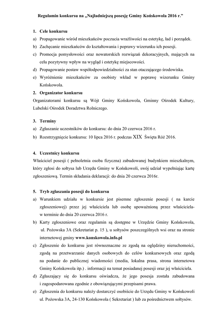 Regulamin konkursu na „Najładniejszą posesję Gminy Końskowola 2016 r.” 1. Cele konkursu a) Propagowanie wśród mieszkańców poczucia wrażliwości na estetykę, ład i porządek. b) Zachęcanie mieszkańców do kształtowania i poprawy wizerunku ich posesji. c) Promocja pomysłowości oraz nowatorskich rozwiązań dekoracyjnych, mających na celu pozytywny wpływ na wygląd i estetykę miejscowości. d) Propagowanie postaw współodpowiedzialności za stan otaczającego środowiska. e) Wyróżnienie mieszkańców za osobisty wkład w poprawę wizerunku Gminy Końskowola. 2. Organizator konkursu Organizatorami konkursu są Wójt Gminy Końskowola, Gminny Ośrodek Kultury, Lubelski Ośrodek Doradztwa Rolniczego. 3. Terminy a) Zgłaszanie uczestników do konkursu: do dnia 20 czerwca 2016 r. b) Rozstrzygnięcie konkursu: 10 lipca 2016 r. podczas XIX Święta Róż 2016. 4. Uczestnicy konkursu Właściciel posesji ( pełnoletnia osoba fizyczna) zabudowanej budynkiem mieszkalnym, który zgłosi do sołtysa lub Urzędu Gminy w Końskowoli, swój udział wypełniając kartę zgłoszeniową. Termin składania deklaracji: do dnia 20 czerwca 2016r. 5. Tryb zgłaszania posesji do konkursu a) Warunkiem udziału w konkursie jest pisemne zgłoszenie posesji ( na karcie zgłoszeniowej) przez jej właściciela lub osobę upoważnioną przez właścicielaw terminie do dnia 20 czerwca 2016 r. b) Karty zgłoszeniowe oraz regulamin są dostępne w Urzędzie Gminy Końskowola, ul. Pożowska 3A (Sekretariat p. 15 ), u sołtysów poszczególnych wsi oraz na stronie internetowej gminy www.konskowola.info.pl c) Zgłoszenie do konkursu jest równoznaczne ze zgodą na oględziny nieruchomości, zgodą na przetwarzanie danych osobowych do celów konkursowych oraz zgodą na podanie do publicznej wiadomości (media, lokalna prasa, strona internetowa Gminy Końskowola itp.) . informacji na temat posiadanej posesji oraz jej właściciela. d) Zgłaszający się do konkursu oświadcza, że jego posesja została zabudowana i zagospodarowana zgodnie z obowiązującymi przepisami prawa. e) Zgłoszenia do konkursu należy dostarczyć osobiście do Urzędu Gminy w Końskowoli ul. Pożowska 3A, 24-130 Końskowola ( Sekretariat ) lub za pośrednictwem sołtysów. f) Złożenie zgłoszenia jest równoznaczne z akceptacją warunków konkursu. g) Dodatkowe informacje o konkursie można uzyskać telefonicznie pod numerem telefonu 81 881 62 01 bądź bezpośrednio w Urzędzie Gminy w Końskowoli. 6. Warunki przeprowadzenia konkursu a) Organizator konkursu zastrzega sobie prawo do odstąpienia od rozstrzygnięcia konkursu, jeżeli nie wpłyną co najmniej 3 zgłoszenia do konkursu. b) Organizator konkursu zastrzega sobie prawo do nierozpatrywania zgłoszeń, które wpłyną do Urzędu Gminy w Końskowoli po terminie wskazanym w niniejszym regulaminie. c) Konkursem objęte są nieruchomości leżące w granicach administracyjnych Gminy Końskowola. 7. Ocena zgłoszonych posesji, kryteria Po zakończeniu przyjmowania zgłoszeń komisja konkursowa dokona wizytacji i oceny zgłoszonych posesji (w dniu 1 - 6 lipca 2016 r.). Komisja dokona oceny na przygotowanej karcie. Przyjmuje się skalę od 1 do 5 punktów za każde z kryteriów oceny. Ocena ostateczna jest suma punktów przyznanych za każde z kryteriów. Wygrywa posesja, której suma punktów będzie największa. W przypadku równej liczby głosów decyduje głos Przewodniczącego Komisji Konkursowej. Kryteria podlegające ocenie są następujące: a) Utrzymanie czystości, ładu i porządku na terenie posesji b) Zagospodarowanie i utrzymanie zieleni w tym różnorodność kwiatów, krzewów i drzew c) Estetyka zabudowań d) Zagospodarowanie posesji elementami małej architektury (altanki, oczka wodne, studnie, skalniaki itp.) e) Oryginalność i pomysł na zagospodarowanie posesji f) Rozwiązania ekologiczne oraz elementy regionalne 8. Nagrody a) Właściciele trzech najwyżej ocenionych posesji otrzymają nagrody rzeczowe oraz pamiątkowe dyplomy. b) Pozostali uczestnicy konkursu otrzymają pamiątkowe dyplomy.