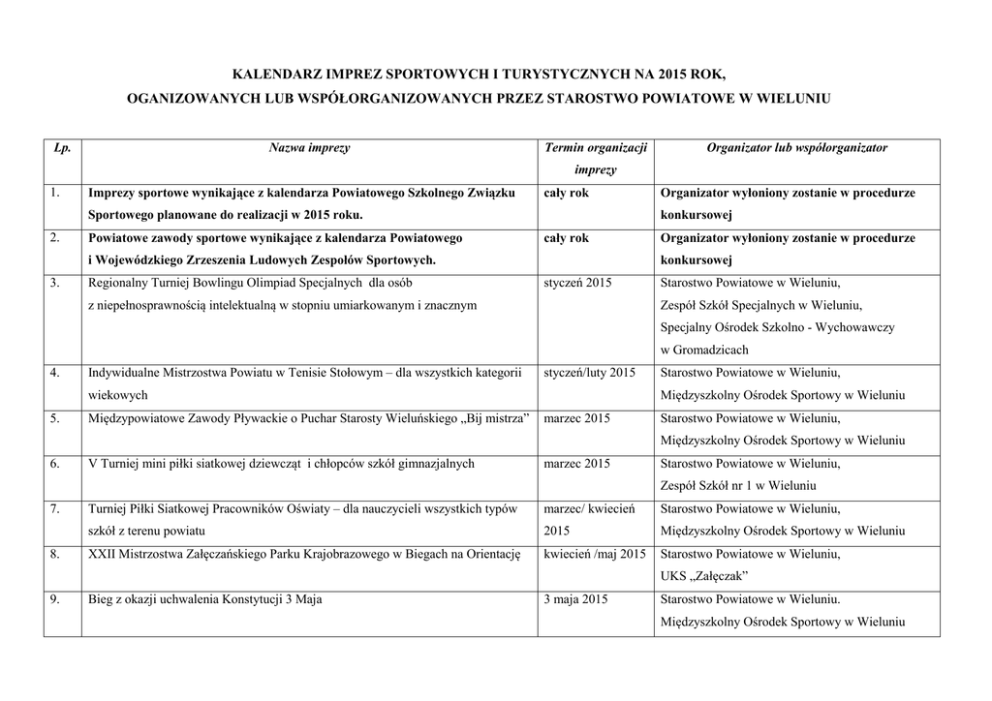 KALENDARZ IMPREZ SPORTOWYCH I TURYSTYCZNYCH NA 2015 ROK, OGANIZOWANYCH LUB WSPÓŁORGANIZOWANYCH PRZEZ STAROSTWO POWIATOWE W WIELUNIU Lp. Nazwa imprezy Termin organizacji Organizator lub współorganizator imprezy 1. Imprezy sportowe wynikające z kalendarza Powiatowego Szkolnego Związku cały rok Sportowego planowane do realizacji w 2015 roku. 2. Powiatowe zawody sportowe wynikające z kalendarza Powiatowego konkursowej cały rok i Wojewódzkiego Zrzeszenia Ludowych Zespołów Sportowych. 3. Regionalny Turniej Bowlingu Olimpiad Specjalnych dla osób Organizator wyłoniony zostanie w procedurze Organizator wyłoniony zostanie w procedurze konkursowej styczeń 2015 z niepełnosprawnością intelektualną w stopniu umiarkowanym i znacznym Starostwo Powiatowe w Wieluniu, Zespół Szkół Specjalnych w Wieluniu, Specjalny Ośrodek Szkolno - Wychowawczy w Gromadzicach 4. Indywidualne Mistrzostwa Powiatu w Tenisie Stołowym – dla wszystkich kategorii styczeń/luty 2015 wiekowych 5. Międzypowiatowe Zawody Pływackie o Puchar Starosty Wieluńskiego „Bij mistrza” Starostwo Powiatowe w Wieluniu, Międzyszkolny Ośrodek Sportowy w Wieluniu marzec 2015 Starostwo Powiatowe w Wieluniu, Międzyszkolny Ośrodek Sportowy w Wieluniu 6. V Turniej mini piłki siatkowej dziewcząt i chłopców szkół gimnazjalnych marzec 2015 Starostwo Powiatowe w Wieluniu, Zespół Szkół nr 1 w Wieluniu 7. 8. Turniej Piłki Siatkowej Pracowników Oświaty – dla nauczycieli wszystkich typów marzec/ kwiecień Starostwo Powiatowe w Wieluniu, szkół z terenu powiatu 2015 Międzyszkolny Ośrodek Sportowy w Wieluniu XXII Mistrzostwa Załęczańskiego Parku Krajobrazowego w Biegach na Orientację kwiecień /maj 2015 Starostwo Powiatowe w Wieluniu, UKS „Załęczak” 9. Bieg z okazji uchwalenia Konstytucji 3 Maja 3 maja 2015 Starostwo Powiatowe w Wieluniu. Międzyszkolny Ośrodek Sportowy w Wieluniu 10. Turniej piłki nożnej uczniów szkół podstawowych, gimnazjalnych maj 2015 i ponadgimnazjalnych „MOS – CUP Wieluń” 11. Masowy Bieg Uliczny „Pętla Wieluńska” w ramach ogólnopolskiej akcji „Cała Międzyszkolny Ośrodek Sportowy w Wieluniu maj 2015 Polska biega” - dzieci, młodzież i dorośli z terenu powiatu 12. Integrada 2015 - integracyjna impreza sportowo - rekreacyjna Starostwo Powiatowe w Wieluniu, Starostwo Powiatowe w Wieluniu, Międzyszkolny Ośrodek Sportowy w Wieluniu maj/czerwiec 2015 Starostwo Powiatowe w Wieluniu, Specjalny Ośrodek Szkolno-Wychowawczy w Gromadzicach, II Liceum Ogólnokształcące w Wieluniu 13. II Mityng Lekkoatletyczny skoku w dal dziewcząt i chłopców szkół gimnazjalnych czerwiec 2015 i ponadgimnazjalnych 14. Powiatowy Turniej Piłki Nożnej Dziewcząt i Chłopców (szkoły ponadgimnazjalne) Starostwo Powiatowe w Wieluniu, I Liceum Ogólnokształcące w Wieluniu czerwiec 2015 Starostwo Powiatowe w Wieluniu, Zespół Szkół nr 2 w Wieluniu 15. Turniej Piłki Plażowej szkół gimnazjalnych i ponadgimnazjalnych czerwiec 2015 Starostwo Powiatowe w Wieluniu, Międzyszkolny Ośrodek Sportowy w Wieluniu 16. Podsumowanie współzawodnictwa sportowego szkół Powiatu Wieluńskiego czerwiec 2015 Starostwo Powiatowe w Wieluniu 17. XVI Powiatowe Igrzyska Ziemi Wieluńskiej czerwiec 2015 Starostwo Powiatowe w Wieluniu, Urząd Gminy w Skomlinie 18. Nordic Walking „Pożegnanie lata” – plenerowa impreza integracyjna dla uczniów wrzesień 2015 szkół ponadgimnazjalnych i uczniów szkół specjalnych prowadzonych przez powiat Starostwo Powiatowe w Wieluniu, Zespół Szkół nr 2 w Wieluniu Wieluński 19. Międzynarodowy Turniej Piłki Ręcznej Oldbojów. październik 2015 Starostwo Powiatowe w Wieluniu, Międzyszkolny Klub Sportowy Wieluń 20. Regionalny Mityng Pływacki Olimpiad Specjalnych (dla osób z upośledzeniem grudzień 2015 Starostwo Powiatowe w Wieluniu, umysłowym w stopniu umiarkowanym i znacznym) – Międzynarodowy Dzień Osób Zespół Szkół Specjalnych w Wieluniu, Niepełnosprawnych Specjalny Ośrodek Szkolno - Wychowawczy w Gromadzicach