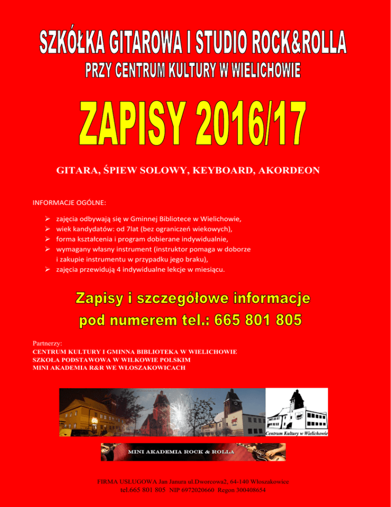 GITARA, ŚPIEW SOLOWY, KEYBOARD, AKORDEON INFORMACJE OGÓLNE: zajęcia odbywają się w Gminnej Bibliotece w Wielichowie, wiek kandydatów: od 7lat (bez ograniczeń wiekowych), forma kształcenia i program dobierane indywidualnie, wymagany własny instrument (instruktor pomaga w doborze i zakupie instrumentu w przypadku jego braku), zajęcia przewidują 4 indywidualne lekcje w miesiącu. Partnerzy: CENTRUM KULTURY I GMINNA BIBLIOTEKA W WIELICHOWIE SZKOŁA PODSTAWOWA W WILKOWIE POLSKIM MINI AKADEMIA R&R WE WŁOSZAKOWICACH FIRMA USŁUGOWA Jan Janura ul.Dworcowa2, 64-140 Włoszakowice tel.665 801 805 NIP 6972020660 Regon 300408654