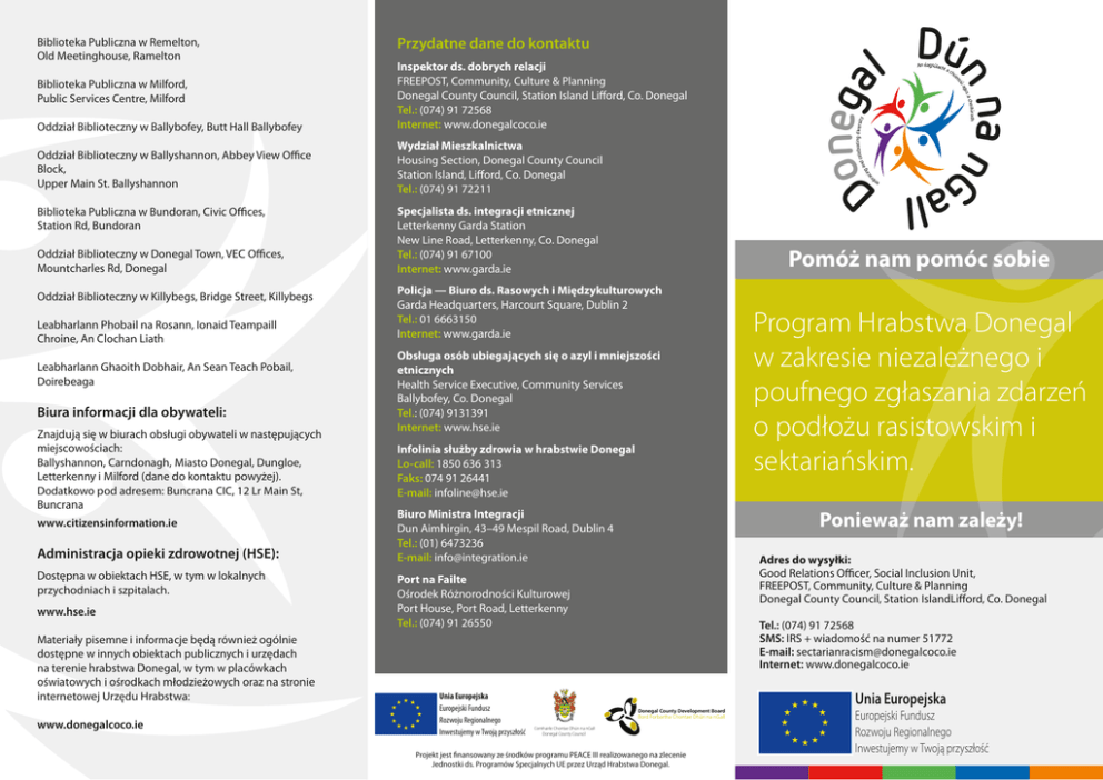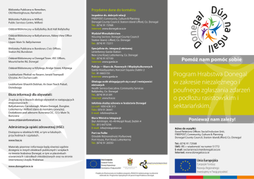 Biblioteka Publiczna w Bundoran, Civic Offices, Station Rd, Bundoran Oddział Biblioteczny w Donegal Town, VEC Offices, Mountcharles Rd, Donegal Oddział Biblioteczny w Killybegs, Bridge Street, Killybegs Leabharlann Phobail na Rosann, Ionaid Teampaill Chroine, An Clochan Liath Leabharlann Ghaoith Dobhair, An Sean Teach Pobail, Doirebeaga Biura informacji dla obywateli: Znajdują się w biurach obsługi obywateli w następujących miejscowościach: Ballyshannon, Carndonagh, Miasto Donegal, Dungloe, Letterkenny i Milford (dane do kontaktu powyżej). Dodatkowo pod adresem: Buncrana CIC, 12 Lr Main St, Buncrana www.citizensinformation.ie Administracja opieki zdrowotnej (HSE): Dostępna w obiektach HSE, w tym w lokalnych przychodniach i szpitalach. www.hse.ie Materiały pisemne i informacje będą również ogólnie dostępne w innych obiektach publicznych i urzędach na terenie hrabstwa Donegal, w tym w placówkach oświatowych i ośrodkach młodzieżowych oraz na stronie internetowej Urzędu Hrabstwa: www.donegalcoco.ie Specjalista ds. integracji etnicznej Letterkenny Garda Station New Line Road, Letterkenny, Co. Donegal Tel.: (074) 91 67100 Internet: www.garda.ie ing celebrat diversity and ing rac chu i Pomóż nam pomóc sobie Policja — Biuro ds. Rasowych i Międzykulturowych Garda Headquarters, Harcourt Square, Dublin 2 Tel.: 01 6663150 Internet: www.garda.ie Obsługa osób ubiegających się o azyl i mniejszości etnicznych Health Service Executive, Community Services Ballybofey, Co. Donegal Tel.: (074) 9131391 Internet: www.hse.ie Infolinia służby zdrowia w hrabstwie Donegal Lo-call: 1850 636 313 Faks: 074 91 26441 E-mail: [email protected] Biuro Ministra Integracji Dun Aimhirgin, 43–49 Mespil Road, Dublin 4 Tel.: (01) 6473236 E-mail: [email protected] Program Hrabstwa Donegal w zakresie niezależnego i poufnego zgłaszania zdarzeń o podłożu rasistowskim i sektariańskim. Ponieważ nam zależy! Adres do wysyłki: Good Relations Officer, Social Inclusion Unit, FREEPOST, Community, Culture & Planning Donegal County Council, Station IslandLifford, Co. Donegal Port na Failte Ośrodek Różnorodności Kulturowej Port House, Port Road, Letterkenny Tel.: (074) 91 26550 Unia Europejska Europejski Fundusz Rozwoju Regionalnego Inwestujemy w Twoją przyszłość onega Wydział Mieszkalnictwa Housing Section, Donegal County Council Station Island, Lifford, Co. Donegal Tel.: (074) 91 72211 An éagsúlach ta em b Oddział Biblioteczny w Ballyshannon, Abbey View Office Block, Upper Main St. Ballyshannon l Dú heiliúradh sac agu iú ms Oddział Biblioteczny w Ballybofey, Butt Hall Ballybofey Inspektor ds. dobrych relacji FREEPOST, Community, Culture & Planning Donegal County Council, Station Island Lifford, Co. Donegal Tel.: (074) 91 72568 Internet: www.donegalcoco.ie n na n Biblioteka Publiczna w Milford, Public Services Centre, Milford Przydatne dane do kontaktu ll D Ga Biblioteka Publiczna w Remelton, Old Meetinghouse, Ramelton Tel.: (074) 91 72568 SMS: IRS + wiadomość na numer 51772 E-mail: [email protected] Internet: www.donegalcoco.ie Unia Europejska Donegal County Development Board Bord Forbartha Chontae Dhún na nGall Comhairle Chontae Dhún na nGall Donegal County Council Projekt jest finansowany ze środków programu PEACE III realizowanego na zlecenie Jednostki ds. Programów Specjalnych UE przez Urząd Hrabstwa Donegal. Europejski Fundusz Rozwoju Regionalnego Inwestujemy w Twoją przyszłość Co to jest sektarianizm i rasizm? Sektarianizm Sektarianizm to postępowanie, zachowanie lub wypowiedzi, które wywyższają lub poniżają ludzi ze względu na ich przekonania polityczne lub religijne. Rasizm Rasizm to postępowanie, zachowanie lub wypowiedzi, które wywyższają lub poniżają ludzi ze względu na kolor skóry, kulturę lub pochodzenie etniczne. Co to jest zdarzenie o podłożu rasistowskim lub sektariańskim? Zdarzenie o podłożu rasistowskim nie musi być przestępstwem; może być dowolnym przejawem rasizmu lub sektarianizmu, które zostało oficjalnie zdefiniowane w następujący sposób: „każde zdarzenie, które zostanie odebrane jako działanie o podłożu rasistowskim lub sektariańskim przez osobę poszkodowaną lub przez inną osobę“. Czym jest program Hrabstwa Donegal w zakresie zgłaszania zdarzeń o podłożu rasistowskim i sektariańskim? Partnerstwo dla Pokoju i Porozumienia Komisji ds. Rozwoju Hrabstwa Donegal ma wspólną wizję: „Donegal jako hrabstwo, w którym nie ma już rasizmu i sektarianizmu, a wszyscy mieszkańcy czują się jednakowo szanowani i pewni swojej przynależności do społeczności lokalnej“. Pomóż nam pomóc sobie: Program został opracowany jako projekt pilotażowy i polega na utworzeniu niezależnego mechanizmu umożliwiającego poufne zgłaszanie przez lokalną społeczność wszelkich przejawów rasizmu i sektarianizmu, do których dochodzi na terenie hrabstwa Donegal. Ponieważ nam zależy! Osoba dokonująca zgłoszenia może pozostać anonimowa lub zażądać przekazania swojego zgłoszenia do odpowiedniej instytucji, która udzieli jej wsparcia i porady. Program został opracowany w ramach planu działania Donegal Peace III na lata 2008–2010, z którego wynikało, że nie ma dostępnych danych dotyczących występowania wobec zdarzeń o podłożu rasistowskim i sektariańskim na terenie hrabstwa. Jest to działanie międzyinstytucjonalne, w którego realizacji uczestniczą: administracja opieki zdrowotnej HSE, Urząd Hrabstwa Donegal, Komisja ds. Kształcenia Zawodowego VEC w hrabstwie Donegal, Centrum Informacji dla Obywateli, Policja, firmy działające na rzecz rozwoju regionalnego, ośrodki młodzieżowe oraz przedstawiciele mniejszości z terenu hrabstwa Donegal. Jak to działa? Jeżeli jesteś osobą poszkodowaną w zdarzeniu o podłożu rasistowskim lub sektariańskim lub jeżeli jesteś ofiarą dyskryminacji na tle rasowym lub sektariańskim albo ktoś z Twoich znajomych jest osobą poszkodowaną w taki