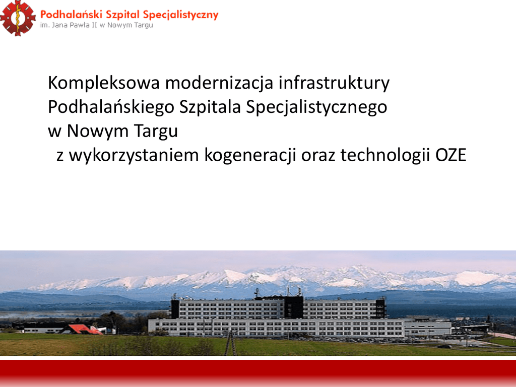 Kompleksowa modernizacja infrastruktury Podhalańskiego Szpitala Specjalistycznego w Nowym Targu z wykorzystaniem kogeneracji oraz technologii OZE Agenda • Dlaczego zmiany? • Charakterystyka szpitala • Zakres audytu • Wymagane usprawnienia – Pozyskanie energii – Termomodernizacja – Modernizacja sieci Dlaczego zmiany? Prawo Ustawa o efektywności energetycznej z dnia 15 kwietnia 2011r nakłada na jednostki sektora publicznego obowiązek przeprowadzania audytu energetycznego zgodnego z wytycznymi określonymi w Rozporządzenia Ministra Infrastruktury. Konkurencja Ograniczając koszty stałe (energia, ciepło), szpital ma możliwość świadczenia usług ponosząc niższe koszty. Co najważniejsze, zmniejszenie kosztów energii nie wpływa w żadnym stopniu na pogorszenie jakości świadczonych usług. Wizerunek Szpital podejmując działania proefektywnościowe kreuje wizerunek jednostki nastawionej na innowacje i rozwój. Pacjenci odbierają przekaz, że szpital dba o utrzymanie najwyższej jakości w każdym obszarze. Charakterystyka szpitala • Podhalański Szpital Specjalistyczny w Nowym Targu jest wielospecjalistyczną placówką medyczną, która według danych z 2013 r. przyjęła około 155 tysięcy pacjentów we wszystkich oddziałach i poradniach. • Na obiekty szpitala składają się budynki niskie (budynek B - 2 kondygnacje, oraz budynki C, D, H 4 kondygnacji) i wysoki budynek A – 9 kondygnacji. Budynki są połączone w jedną całość przewiązkami E, F i G. • Budynki powstawały od roku 1980 i były kilkakrotnie modyfikowane. Powierzchnia zabudowana budynków wynosi 49 432 m2, powierzchnia użytkowa ogrzewanej części szpitala to 39 546 m2. • Szpital zatrudnia 950 osoby , a na terenie Szpitala pracuje około 1200 osób. Zakres audytu Przegląd instalacji centralnego ogrzewania i ciepłej wody użytkowej, • wentylacji, awaryjnego zasilania oraz źródeł ciepła i chłodu; • Analiza zapotrzebowania sezonowego na energię cieplną szpitala, wraz z opisem wykorzystywanych źródeł pozyskania energii; • Opracowanie założeń do gospodarki paliwami, energią elektryczną i cieplną, z uwzględnieniem optymalizacji kosztowej; • Ocenę potencjału oszczędności oraz wyznaczenie uzasadnionych zmian w zarządzaniu poborem energii; • Opracowanie założeń i wytycznych do instalacji urządzeń pomiarowych ciepła, paliw i pozostałych nośników energii oraz do bieżącego monitoringu energetycznego obiektu; • Analiza badań termowizyjnych przeprowadzonych w przeszłości; • Analiza korzyści instalacji źródła kogeneracyjnego, OZE lub instalacji magazynowania energii do celów współpracy z wewnętrzną siecią szpitala; • Zalecenia audytu; Wymagane usprawnienia – Pozyskanie energii Stan wyjściowy Proponowane usprawnienia Szpital obecnie do uzyskania energii cieplnej wykorzystuje kotłownie własną, której moc określana jest przez zespół czterech kotłów o mocy 2,3 MW każdy, jest wystarczająca do pokrycia potrzeb ogrzewania centralnego, ciepłej wody użytkowej oraz wentylacji i klimatyzacji. Energia elektryczna szpitala pozyskiwana jest z sieci lokalnej spółki dystrybucyjnej. Zapotrzebowanie szpitala szacowane jest na 3 500 MWh rocznie. Ilość ta pozycjonuje szpital w Nowym Targu w grupie budynków o zwiększonym zapotrzebowaniu na energię elektryczną. Dodatkowo szpital utrzymuje awaryjne źródło zasilania. Instalacja układu kogeneracyjnego do produkcji energii cieplnej i elektrycznej - proponuje się zabudowę gazowego źródła kogeneracyjnego opartego o parametrach mocy 270 kWe/315 kWt. Układ będzie współpracować z istniejącymi urządzeniami, instalacjami i sieciami elektrycznymi, cieplnymi i gazowymi eksploatowanymi na terenie kotłowni. Zastosowanie pomp ciepła dla systemów grzewczych - proponuje się zainstalowanie pomp ciepła wykorzystujących ciepło pochodzące ze ścieków szpitala. Całodobowy zrzut ścieków szacowany jest na 200 m3. Instalacja źródła fotowoltaicznego produkcji energii elektrycznej analiza zabudowy terenu Szpitala ujawniła możliwość bezproblemowej instalacji elektrowni fotowoltaicznej o mocy zainstalowanych źródeł od 300 – 500 kW. Zmiana paliwa – w trakcie audytu potwierdzono możliwości techniczne wykorzystania paliwa gazowego w zainstalowanych kotłach. Stwierdzono jednoznacznie, że stosowanie paliwa mieszanego (82% gaz ziemny, 18% olej opałowy) umożliwia osiągnięcie znacznych oszczędności . Wymagane usprawnienia – Termomodernizacja Stan wyjściowy Proponowane usprawnienia Analizowano celowość podjęcia następujących przedsięwzięć termomodernizacyjnych: Wymiana okien i drzwi aluminiowych na stolarkę pasywną (trzy szybową) ze współczynnikiem przenikania ciepła na poziomie co najmniej 0,8. Wymiana dotyczyć ma łącznej powierzchni około 4 980 m2 drzwi i okien . a) ocieplenie przegród zewnętrznych, b) wymiana okien aluminiowych, c) Modernizacja systemu wentylacji mechanicznej, Ocieplenie przegród zewnętrznych w tym ocieplenie stropodachu warstwą 25 cm styropianu wraz z folią z balastem. Dodatkowo docieplenie ścian zewnętrznych styropianem o grubości 25 cm, wykonane metodą lekko mokra z tynkiem. Oszacowano powierzchnię docieplenia na około 13 300 m2. Audyt przeprowadzono przy wykorzystaniu kamery termowizyjnej oraz dostępnych analiz opłacalności rozwiązań termomodernizacyjnych. Modernizacja systemu wentylacji mechanicznej – modernizacja dotyczy wyłącznie technologii odzysku ciepła i obejmuje wyposażenie central wentylacyjnych w moduły z glikolowymi wymiennikami ciepła o sprawności min 50%. Instalacja nie wymaga dużych nakładów finansowych. Wymagane usprawnienia – Modernizacja sieci Stan wyjściowy Przed przeprowadzonym audytem zarządzanie popytem ograniczało się do posiadania instalacji awaryjnego zasilania (wymaganej dla każdego szpitala). Zużycie energii nie było monitorowane, a cechy energooszczędności 