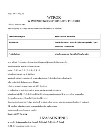 Sygn. akt VI Ka 3/14 WYROK W IMIENIU RZECZYPOSPOLITEJ POLSKIEJ Dnia 20 lutego 2014 r. Sąd Okręgowy w Elblągu VI Wydział Karny Odwoławczy w składzie: Przewodnicząca: SSO Natalia Burandt Sędziowie: SO Małgorzata Kowalczyk-Przedpełska (spr.) SO Irena Linkiewicz Protokolant st.sekr.sądowy Kamila Obuchowicz przy udziale Prokuratora Prokuratury Okręgowej Krzysztofa Piwowarczyka po rozpoznaniu w dniu 20 lutego 2014r., sprawy C. M. (1), C. B. (1), A. K., J. K. (1) oskarżonych z art. 291 §1 kk i inne na skutek apelacji wniesionych przez oskarżonego A. K. i obrońców oskarżonych od wyroku Sądu Rejonowego w Elblągu z dnia 17 stycznia 2013 r., sygn. akt VIII K 558/11 I. zaskarżony wyrok utrzymuje w mocy uznając apelacje obrońców oskarżonych C. M. (1), C. B. (1), A. K. i J. K. (1) oraz oskarżonego A. K. za oczywiście bezzasadne; II. zasądza na rzecz Kancelarii Adwokackiej (...) i Kancelarii Adwokackiej (...) po 516,60 zł. brutto tytułem obrony oskarżonych przed sądem II instancji; III. zwalnia oskarżonych od ponoszenia kosztów sądowych za postępowanie odwoławcze w całości. Sygn. akt VI Ka 3/14 UZASADNIENIE w części dotyczącej oskarżonych C. M. (1), C. B. (1) i J. K. (1) C. M. (1) oskarżony został o to, że: I. w okresie od 01 maja 2009 roku do 01 czerwca 2010 roku w E. i T. działając czynem ciągłym z góry powziętym zamiarem oraz w sposób wskazujący, iż uczynił sobie z popełnienia przestępstwa w tym skarbowych stałe źródło dochodu, wielokrotnie nabył w celu dalszego wprowadzenia do obrotu uzyskany za pomocą czynu zabronionego nielegalnie odkażony alkohol etylowy w łącznej ilości nie mniejszej niż 2.600 litrów o łącznej wartości rynkowej nie mniejszej niż 208.000 zł, który następnie zbył innym osobom, osiągając z tego tytułu korzyść wysokości nie mniejszej niż 39.000 zł tj. o czyn z art. 291 § 1 kk. w zw. z art. 294 § 1 kk. w zw. z art. 65 § 1 k.k. w zw. z art. 12 kk. C. B. (1) oraz A. K. oskarżeni zostali o to, że: II. w okresie od 01 maja 2009 roku do 01 czerwca 2010 roku w E. działając wspólnie i w porozumieniu (...) ciągłym z góry powziętym zamiarem oraz w sposób wskazujący, iż uczynili sobie z popełniania przestępstwa w tym skarbowych stałe źródło dochodu, wielokrotnie nabyli w celu dalszego wprowadzenia do obrotu uzyskany za pomocą czynu zabronionego nielegalnie odkażony alkohol etylowy w łącznej ilości nie mniejszej niż 5.200 litrów o łącznej wartości rynkowej nie mniejszej niż 416.000 zł, który następnie zbył innym osobom, osiągając z tego tytułu korzyść majątkową w wysokości nie mniejszej niż 93.000 zł tj. o czyn z art. 291 § 1 k.k. w zw. z art. 294 § 1 k.k. w zw. z art. 65 § 1 k.k. w zw. z art. 12 k.k J. K. (1) oskarżony został o to, że: I. w okresie od 01 maja 2009 roku do 01 czerwca 2010 roku w E. i T. działając czynem ciągłym z góry powziętym zamiarem oraz w sposób wskazujący, iż uczynił sobie z popełnienia przestępstwa w tym skarbowych stałe źródło dochodu, wielokrotnie nabył w celu dalszego wprowadzenia do obrotu uzyskany za pomocą czynu zabronionego nielegalnie odkażony alkohol etylowy w łącznej ilości nie mniejszej niż 900 litrów o łącznej wartości rynkowej nie mniejszej niż 72.000 zł, który następnie zbył innym osobom, osiągając z tego tytułu korzyść majątkową w wysokości nie mniejszej niż 10.800 zł tj. o czyn z art. 291 § 1 k.k. w zw. z art. 65 § 1 k.k. w zw. z art. 12 Wyrokiem z dnia 17 stycznia 2013 r. w sprawie sygn. VIII K 558/11 Sąd Rejonowy w Elblągu: I. uznał oskarżonego C. M. (1) za winnego popełnienia czynu zarzucanego mu aktem oskarżenia i czyn ten zakwalifikował jako występek z art. 291 § 1 k.k. w zw. z art. 294 § 1 k.k. w zw. z art. 65 § 1 k.k. w zw. z art. 12 k.k. i za to na podstawie art. 294 § 1 k.k. w zw. z art. 65 § 1 k.k. wymierzył mu karę 1 (jednego ) roku i 6 (sześciu) miesięcy pozbawienia wolności; II. na podstawie art. 69 § 1 i 2 kk w zw. z art. 70 § 2 kk w zw. z art. 65 § 1 k.k. wykonanie orzeczonej wobec C. M. (1) kary pozbawienia wolności warunkowo zawiesił tytułem próby na okres 4 (czterech) lat; III. na podstawie art. 45 § 1 kk orzekł wobec oskarżonego C. M. (1) przepadek na rzecz Skarbu Państwa równowartości korzyści majątkowej uzyskanej ze sprzedaży nielegalnie odkażonego alkoholu etylowego w łącznej kwocie 39.000 zł (trzydzieści dziewięć tysięcy), IV. na podstawie art. 73 § 2 kk w zw. z art. 65 § 1 kk oddał oskarżonego C. M. (1) w okresie próby pod dozór kuratora; V. uznał oskarżoną C. B. (1) za winną popełnienia czynu zarzucanego jej aktem oskarżenia i czyn ten zakwalifikował jako występek z art. 291 § 1 k.k. w zw. z art. 294 § 1 k.k. w zw. z art. 65 § 1 k.k. w zw. z art. 12 k.k. i za to na podstawie art. 294 § 1 k.k. w zw. z art. 65 § 1 k-k. wymierzył jej karę 2 (dwóch) lat pozbawienia wolności; VI. na podstawie art. 69 § 1 i 2 kk w zw. z art. 70 § 2 kk w zw. z art. 65 § 1kk wykonanie orzeczonej wobec oskarżonej C. B. (1) kary pozbawienia wolności warunkowo zawiesił tytułem próby na okres 4 (czterech) lat; VII. na podstawie art. 45 § 1 kk orzekł wobec oskarżonej C. B. przepadek na rzecz Skarbu Państwa równowartości korzyści majątkowej uzyskanej ze sprzedaży nielegalnie odkażonego alkoholu etylowego w łącznej kwocie 63.600 zł (sześćdziesiąt trzy tysiące sześćset złotych), VIII. na podstawie art. 73 § 2 kk w zw. z art. 65 § 1 kk oddał oskarżoną C. B. (1), w okresie próby pod dozór kuratora; IX. uznał oskarżonego J. K. (1) za winnego popełnienia czynu zarzucanego mu aktem oskarżenia i czyn ten zakwalifikował jako występek z art. 291 § 1 k.k. w zw. z art. 12 k.k. i za to na podstawie art. 291 § 1 k.k. wymierzył mu karę 10 (dziesięciu) miesięcy pozbawienia wolności; X. na podstawie art. 69 § 1 i 2 kk w zw. z art. 70 § 2 kk wykonanie orzeczonej wobec J. K. (1) kary poz