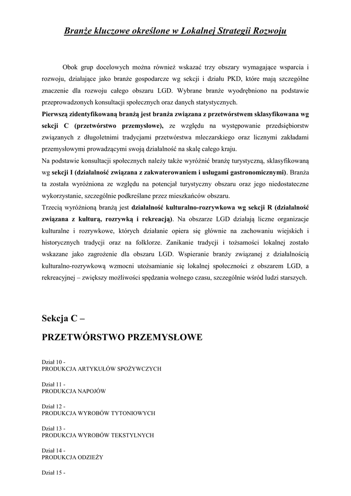 Branże kluczowe określone w Lokalnej Strategii Rozwoju Obok grup docelowych można również wskazać trzy obszary wymagające wsparcia i rozwoju, działające jako branże gospodarcze wg sekcji i działu PKD, które mają szczególne znaczenie dla rozwoju całego obszaru LGD. Wybrane branże wyodrębniono na podstawie przeprowadzonych konsultacji społecznych oraz danych statystycznych. Pierwszą zidentyfikowaną branżą jest branża związana z przetwórstwem sklasyfikowana wg sekcji C (przetwórstwo przemysłowe), ze względu na występowanie przedsiębiorstw związanych z długoletnimi tradycjami przetwórstwa mleczarskiego oraz licznymi zakładami przemysłowymi prowadzącymi swoją działalność na skalę całego kraju. Na podstawie konsultacji społecznych należy także wyróżnić branżę turystyczną, sklasyfikowaną wg sekcji I (działalność związana z zakwaterowaniem i usługami gastronomicznymi). Branża ta została wyróżniona ze względu na potencjał turystyczny obszaru oraz jego niedostateczne wykorzystanie, szczególnie podkreślane przez mieszkańców obszaru. Trzecią wyróżnioną branżą jest działalność kulturalno-rozrywkowa wg sekcji R (działalność związana z kulturą, rozrywką i rekreacją). Na obszarze LGD działają liczne organizacje kulturalne i rozrywkowe, których działanie opiera się głównie na zachowaniu wiejskich i historycznych tradycji oraz na folklorze. Zanikanie tradycji i tożsamości lokalnej zostało wskazane jako zagrożenie dla obszaru LGD. Wspieranie branży związanej z działalnością kulturalno-rozrywkową wzmocni utożsamianie się lokalnej społeczności z obszarem LGD, a rekreacyjnej – zwiększy możliwości spędzania wolnego czasu, szczególnie wśród ludzi starszych. Sekcja C – PRZETWÓRSTWO PRZEMYSŁOWE Dział 10 PRODUKCJA ARTYKUŁÓW SPOŻYWCZYCH Dział 11 PRODUKCJA NAPOJÓW Dział 12 PRODUKCJA WYROBÓW TYTONIOWYCH Dział 13 PRODUKCJA WYROBÓW TEKSTYLNYCH Dział 14 PRODUKCJA ODZIEŻY Dział 15 - PRODUKCJA SKÓR I WYROBÓW ZE SKÓR WYPRAWIONYCH Dział 16 PRODUKCJA WYROBÓW Z DREWNA ORAZ KORKA, Z WYŁĄCZENIEM MEBLI; PRODUKCJA WYROBÓW ZE SŁOMY I MATERIAŁÓW UŻYWANYCH DO WYPLATANIA Dział 17 PRODUKCJA PAPIERU I WYROBÓW Z PAPIERU Dział 18 POLIGRAFIA I REPRODUKCJA ZAPISANYCH NOŚNIKÓW INFORMACJI Dział 19 WYTWARZANIE I PRZETWARZANIE KOKSU I PRODUKTÓW RAFINACJI ROPY NAFTOWEJ Dział 22 PRODUKCJA WYROBÓW Z GUMY I TWORZYW SZTUCZNYCH Dział 23 PRODUKCJA WYROBÓW Z POZOSTAŁYCH MINERALNYCH SUROWCÓW NIEMETALICZNYCH Dział 25 PRODUKCJA METALOWYCH WYROBÓW GOTOWYCH, Z WYŁĄCZENIEM MASZYN I URZĄDZEŃ Dział 26 PRODUKCJA KOMPUTERÓW, WYROBÓW ELEKTRONICZNYCH I OPTYCZNYCH Dział 27 PRODUKCJA URZĄDZEŃ ELEKTRYCZNYCH Dział 28 PRODUKCJA MASZYN I URZĄDZEŃ, GDZIE INDZIEJ NIESKLASYFIKOWANA Dział 30 PRODUKCJA POZOSTAŁEGO SPRZĘTU TRANSPORTOWEGO Dział 31 PRODUKCJA MEBLI Dział 32 POZOSTAŁA PRODUKCJA WYROBÓW Dział 33 NAPRAWA, KONSERWACJA I INSTALOWANIE MASZYN I URZĄDZEŃ Sekcja I – DZIAŁALNOŚĆ ZWIĄZANA Z ZAKWATEROWANIEM I USŁUGAMI GASTRONOMICZNYMI Dział 55 ZAKWATEROWANIE Dział 56 DZIAŁALNOŚĆ USŁUGOWA ZWIĄZANA Z WYŻYWIENIEM Sekcja R – DZIAŁALNOŚĆ ZWIĄZANA Z KULTURĄ, ROZRYWKĄ I REKREACJĄ Dział 90 Działalność twórcza związana z kulturą i rozrywką Dział 91 DZIAŁALNOŚĆ BIBLIOTEK, ARCHIWÓW, MUZEÓW ORAZ POZOSTAŁA DZIAŁALNOŚĆ ZWIĄZANA Z KULTURĄ Dział 92 DZIAŁALNOŚĆ ZWIĄZANA Z GRAMI LOSOWYMI I ZAKŁADAMI WZAJEMNYMI Dział 93 DZIAŁALNOŚĆ SPORTOWA, ROZRYWKOWA I REKREACYJNA