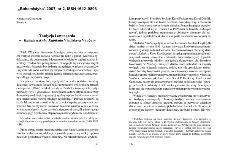 literatury dla dzieci w pierwszej po³owie XX wieku. Eksperymentalny charakter utworu V. Vanèury pokazuje bezsporn¹ wartoœæ wzajemnego przenikania ró¿nych konwencji literackich. Konwencji, które nie tylko nie stoj¹ wobec siebie w opozycji, ale wzajemnie siê uzupe³niaj¹. Z punktu widzenia wspó³czesnego odbiorcy literatury, którego czytelnicza edukacja przyzwyczai³a ju¿ do literatury eksperymentalnej (strumieñ œwiadomoœci w prozie J. Joyce’a czy obecnoœæ elementów kultury wysokiej i niskiej w poezji lingwistycznej M. Bia³oszewskiego), synkretyczny charakter utworu dla dzieci V. Vanèury