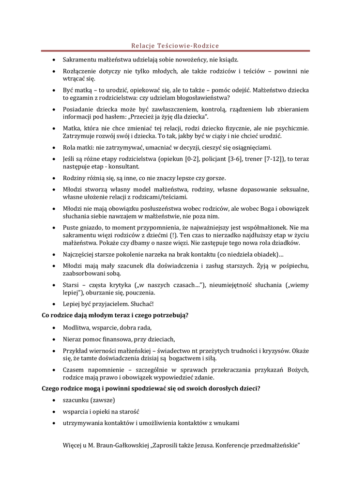 Relacje Teściowie -Rodzice Sakramentu małżeństwa udzielają sobie nowożeńcy, nie ksiądz. Rozłączenie dotyczy nie tylko młodych, ale także rodziców i teściów – powinni nie wtrącać się. Być matką – to urodzić, opiekować się, ale to także – pomóc odejść. Małżeństwo dziecka to egzamin z rodzicielstwa: czy udzielam błogosławieństwa? Posiadanie dziecka może być zawłaszczeniem, kontrolą, rządzeniem lub zbieraniem informacji pod hasłem: „Przecież ja żyję dla dziecka”. Matka, która nie chce zmieniać tej relacji, rodzi dziecko fizycznie, ale nie psychicznie. Zatrzymuje rozwój swój i dziecka. To tak, jakby być w ciąży i nie chcieć urodzić. Rola matki: nie zatrzymywać, umacniać w decyzji, cieszyć się osiągnięciami. Jeśli są różne etapy rodzicielstwa (opiekun [0-2], policjant [3-6], trener [7-12]), to teraz następuje etap - konsultant. Rodziny różnią się, są inne, co nie znaczy lepsze czy gorsze. Młodzi stworzą własny model małżeństwa, rodziny, własne dopasowanie seksualne, własne ułożenie relacji z rodzicami/teściami. Młodzi nie mają obowiązku posłuszeństwa wobec rodziców, ale wobec Boga i obowiązek słuchania siebie nawzajem w małżeństwie, nie poza nim. Puste gniazdo, to moment przypomnienia, że najważniejszy jest współmałżonek. Nie ma sakramentu więzi rodziców z dziećmi (!). Ten czas to nierzadko najdłuższy etap w życiu małżeństwa. Pokaże czy dbamy o nasze więzi. Nie zastępuje tego nowa rola dziadków. Najczęściej starsze pokolenie narzeka na brak kontaktu (co niedziela obiadek)… Młodzi mają mały szacunek dla doświadczenia i zasług starszych. Żyją w pośpiechu, zaabsorbowani sobą. Starsi – częsta krytyka („w naszych czasach…”), nieumiejętność słuchania („wiemy lepiej”), oburzanie się, pouczenia. Lepiej być przyjacielem. Słuchać! Co rodzice dają młodym teraz i czego potrzebują? Modlitwa, wsparcie, dobra rada, Nieraz pomoc finansowa, przy dzieciach, Przykład wierności małżeńskiej – świadectwo nt przeżytych trudności i kryzysów. Okaże się, że tamte doświadczenia dzisiaj są bogactwem i siłą. Czasem napomnienie – szczególnie w sprawach przekraczania przykazań Bożych, rodzice mają prawo i obowiązek wypowiedzieć zdanie. Czego rodzice mogą i powinni spodziewać się od swoich dorosłych dzieci? szacunku (zawsze) wsparcia i opieki na starość utrzymywania kontaktów i umożliwienia kontaktów z wnukami Więcej u M. Braun-Gałkowskiej „Zaprosili także Jezusa. Konferencje przedmałżeńskie”