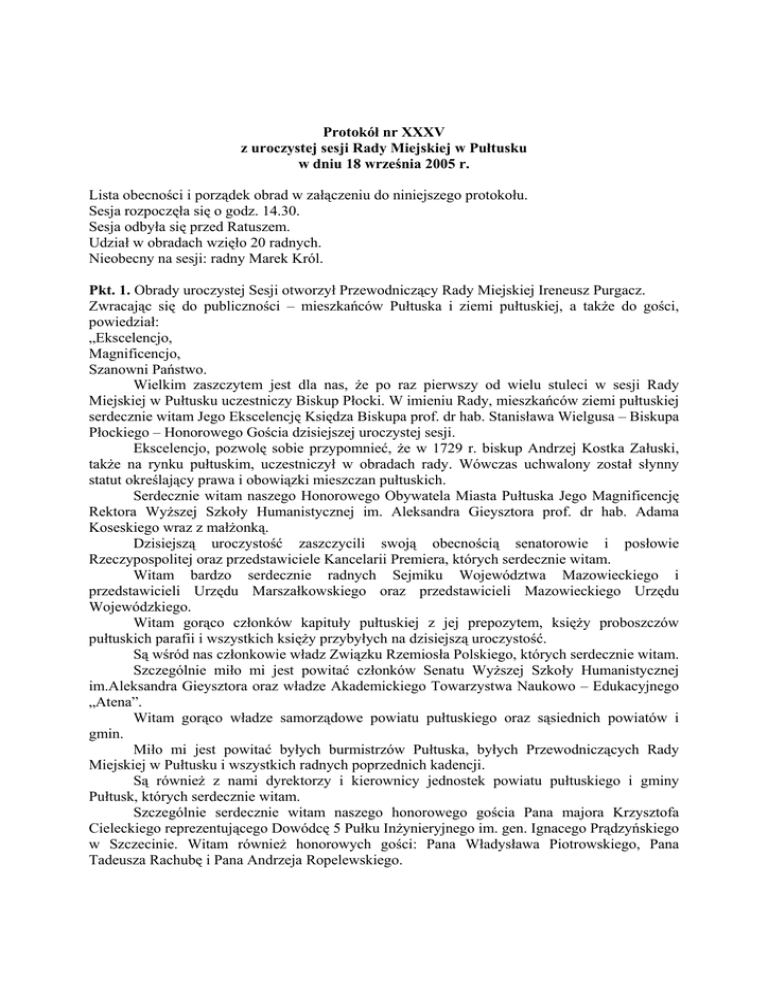 Protokół nr XXXV z uroczystej sesji Rady Miejskiej w Pułtusku w dniu 18 września 2005 r. Lista obecności i porządek obrad w załączeniu do niniejszego protokołu. Sesja rozpoczęła się o godz. 14.30. Sesja odbyła się przed Ratuszem. Udział w obradach wzięło 20 radnych. Nieobecny na sesji: radny Marek Król. Pkt. 1. Obrady uroczystej Sesji otworzył Przewodniczący Rady Miejskiej Ireneusz Purgacz. Zwracając się do publiczności – mieszkańców Pułtuska i ziemi pułtuskiej, a także do gości, powiedział: „Ekscelencjo, Magnificencjo, Szanowni Państwo. Wielkim zaszczytem jest dla nas, że po raz pierwszy od wielu stuleci w sesji Rady Miejskiej w Pułtusku uczestniczy Biskup Płocki. W imieniu Rady, mieszkańców ziemi pułtuskiej serdecznie witam Jego Ekscelencję Księdza Biskupa prof. dr hab. Stanisława Wielgusa – Biskupa Płockiego – Honorowego Gościa dzisiejszej uroczystej sesji. Ekscelencjo, pozwolę sobie przypomnieć, że w 1729 r. biskup Andrzej Kostka Załuski, także na rynku pułtuskim, uczestniczył w obradach rady. Wówczas uchwalony został słynny statut określający prawa i obowiązki mieszczan pułtuskich. Serdecznie witam naszego Honorowego Obywatela Miasta Pułtuska Jego Magnificencję Rektora Wyższej Szkoły Humanistycznej im. Aleksandra Gieysztora prof. dr hab. Adama Koseskiego wraz z małżonką. Dzisiejszą uroczystość zaszczycili swoją obecnością senatorowie i posłowie Rzeczypospolitej oraz przedstawiciele Kancelarii Premiera, których serdecznie witam. Witam bardzo serdecznie radnych Sejmiku Województwa Mazowieckiego i przedstawicieli Urzędu Marszałkowskiego oraz przedstawicieli Mazowieckiego Urzędu Wojewódzkiego. Witam gorąco członków kapituły pułtuskiej z jej prepozytem, księży proboszczów pułtuskich parafii i wszystkich księży przybyłych na dzisiejszą uroczystość. Są wśród nas członkowie władz Związku Rzemiosła Polskiego, których serdecznie witam. Szczególnie miło mi jest powitać członków Senatu Wyższej Szkoły Humanistycznej im.Aleksandra Gieysztora oraz władze Akademickiego Towarzystwa Naukowo – Edukacyjnego „Atena”. Witam gorąco władze samorządowe powiatu pułtuskiego oraz sąsiednich powiatów i gmin. Miło mi jest powitać byłych burmistrzów Pułtuska, byłych Przewodniczących Rady Miejskiej w Pułtusku i wszystkich radnych poprzednich kadencji. Są również z nami dyrektorzy i kierownicy jednostek powiatu pułtuskiego i gminy Pułtusk, których serdecznie witam. Szczególnie serdecznie witam naszego honorowego gościa Pana majora Krzysztofa Cieleckiego reprezentującego Dowódcę 5 Pułku Inżynieryjnego im. gen. Ignacego Prądzyńskiego w Szczecinie. Witam również honorowych gości: Pana Władysława Piotrowskiego, Pana Tadeusza Rachubę i Pana Andrzeja Ropelewskiego. Gorąco witam mieszkańców naszego miasta i ziemi pułtuskiej oraz wszystkich gości, którzy uczestniczą w dzisiejszej uroczystości”. Na podstawie listy obecności Przewodniczący Rady stwierdził prawomocność obrad. Pkt. 2. Przedstawienie porządku obrad. Przewodniczący Rady Ireneusz Purgacz odczytał porządek obrad uroczystej sesji. Uwag do porządku obrad nie zgłoszono. Pkt. 3. Podjęcie uchwały w sprawie nadania tytułu „Honorowego Obywatela Miasta Pułtuska” Jego Ekscelencji Księdzu Biskupowi prof. dr hab. Stanisławowi Wojciechowi Wielgusowi. Projekt uchwały dotyczy nadania Jego Ekscelencji Księdzu Biskupowi prof. dr hab. Stanisławowi Wojciechowi Wielgusowi tytułu Honorowego Obywatela Miasta Pułtuska za godne najwyższego uznania przekazywanie uniwersalnych wartości chrześcijańskich, kształtowanie postaw etycznych i moralnych, kontynuowanie wielowiekowych dokonań biskupów płockich dla Pułtuska i ziemi pułtuskiej. Przewodniczący Rady Ireneusz Purgacz podkreślił, że „w historii samorządu pułtuskiego w III Rzeczypospolitej Polskiej tytuł Honorowego Obywatela Miasta Pułtuska Rada Miejska nadaje po raz szósty. Zaszczytem jest dla nas, że godnością tą uhonorujemy Jego Ekscelencję Księdza Biskupa”. Następnie Przewodniczący Rady poprosił Burmistrza Miasta o przedstawienie uzasadnienia wniosku Komitetu ds. honorowego wyróżnienia i odznaczenia Miasta Pułtusk o nadanie tytułu „Honorowego Obywatela” Jego Ekscelencji Księdzu Biskupowi prof. dr hab. Stanisławowi Wojciechowi Wielgusowi. Burmistrz Miasta Wojciech Dębski odczytał uzasadnienie w powyższej sprawie: „Komitet ds. honorowego wyróżnienia i odznaczenia Miasta Pułtusk podjął decyzję o wystąpieniu do Rady Miejskiej w Pułtusku o nadanie tytułu „Honorowego Obywatela Miasta Pułtuska” Jego Ekscelencji prof. dr hab. Stanisławowi Wielgusowi – Biskupowi Płockiemu. Jego Ekscelencja Ksiądz Biskup prof. dr hab. Stanisław Wielgus urodził się 23 kwietnia 1939 r. w Wierzchowiskach k. Janowa Lubelskiego. Święcenia kapłańskie przyjął w 1962 r. Ukończył teologię i filozofię na Katolickim Uniwersytecie Lubelskim. W 1972 r. uzyskał doktorat na Wydziale Filozofii KUL. Rozprawę habilitacyjną obronił w 1980 r. Dziewięć lat później uzyskał tytuł profesora, a w 1992 r. został mianowany profesorem zwyczajnym. W latach 1989 – 1998 był Rektorem Katolickiego Uniwersytetu Lubelskiego. Dwukrotnie pełnił funkcję Prezydenta Kolegium Rektorskiego Uczelni Wyższych Regionu Lubelskiego oraz w latach 1990 – 1993 Wiceprezydenta Konferencji Rektorów Uniwersytetów Polskich. W 1999 r. został mianowany Biskupem Płockim. Jest kierownikiem Katedry Historii Filozofii w Polsce oraz Międzywydziałowego Zakładu Historii Kultury w Średniowieczu Katolickiego Uniwersytetu Lubelskiego, Przewodniczącym Rady Naukowej Episkopatu Polski oraz członkiem polskich i zagranicznych towarzystw naukowych. 13 grudnia 2004 r. Ojciec Święty Jan Paweł II mianował Księdza Biskupa konsultorem Watykańskiej Kongregacji ds. Wychowania Katolickiego. Jest autorem wielu książek i artykułów. Jego s