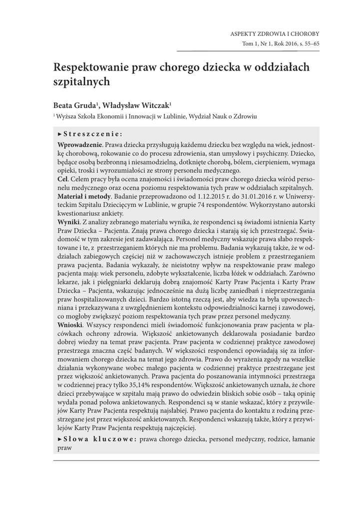 Aspekty zdrowia i choroby Tom 1, Nr 1, Rok 2016, s. 55–65 Respektowanie praw chorego dziecka w oddziałach szpitalnych Beata Gruda1, Władysław Witczak1 1 Wyższa Szkoła Ekonomii i Innowacji w Lublinie, Wydział Nauk o Zdrowiu ▶Streszczenie: Wprowadzenie. Prawa dziecka przysługują każdemu dziecku bez względu na wiek, jednostkę chorobową, rokowanie co do procesu zdrowienia, stan umysłowy i psychiczny. Dziecko, będące osobą bezbronną i niesamodzielną, dotknięte chorobą, bólem, cierpieniem, wymaga opieki, troski i wyrozumiałości ze strony personelu medycznego. Cel. Celem pracy była ocena znajomości i świadomości praw chorego dziecka wśród personelu medycznego oraz ocena poziomu respektowania tych praw w oddziałach szpitalnych. Materiał i metody. Badanie przeprowadzono od 1.12.2015 r. do 31.01.2016 r. w Uniwersyteckim Szpitalu Dziecięcym w Lublinie, w grupie 74 respondentów. Wykorzystano autorski kwestionariusz ankiety. Wyniki. Z analizy zebranego materiału wynika, że respondenci są świadomi istnienia Karty Praw Dziecka – Pacjenta. Znają prawa chorego dziecka i starają się ich przestrzegać. Świadomość w tym zakresie jest zadawalająca. Personel medyczny wskazuje prawa słabo respektowane i te, z przestrzeganiem których nie ma problemu. Badania wykazują także, że w oddziałach zabiegowych częściej niż w zachowawczych istnieje problem z przestrzeganiem prawa pacjenta. Badania wykazały, że nieistotny wpływ na respektowanie praw małego pacjenta mają: wiek personelu, zdobyte wykształcenie, liczba łóżek w oddziałach. Zarówno lekarze, jak i pielęgniarki deklarują dobrą znajomość Karty Praw Pacjenta i Karty Praw Dziecka – Pacjenta, wskazując jednocześnie na dużą liczbę zaniedbań i nieprzestrzegania praw hospitalizowanych dzieci. Bardzo istotną rzeczą jest, aby wiedza ta była upowszechniana i przekazywana z uwzględnieniem kontekstu odpowiedzialności karnej i zawodowej, co mogłoby zwiększyć poziom respektowania tych praw przez personel medyczny. Wnioski. Wszyscy respondenci mieli świadomość funkcjonowania praw pacjenta w placówkach ochrony zdrowia. Większość ankietowanych deklarowała posiadanie bardzo dobrej wiedzy na temat praw pacjenta. Praw pacjenta w codziennej praktyce zawodowej przestrzega znaczna część badanych. W większości respondenci opowiadają się za informowaniem chorego dziecka na temat jego zdrowia. Prawo do wyrażenia zgody na wszelkie działania wykonywane wobec małego pacjenta w codziennej praktyce przestrzegane jest przez większość ankietowanych. Prawa pacjenta do poszanowania intymności przestrzega w codziennej pracy tylko 35,14% respondentów. Większość ankietowanych uznała, że chore dzieci przebywające w szpitalu mają prawo do odwiedzin bliskich sobie osób – taką opinię wydała ponad połowa ankietowanych. Respondenci są w stanie wskazać, który z przywilejów Karty Praw Pacjenta respektują najsłabiej. Prawo pacjenta do kontaktu z rodziną przestrzegane jest przez większość ankietowanych. Respondenci wskazują także, który z przywilejów Karty Praw Pacjenta respektują najczęściej. ▶ S ł o w a k l u c z o w e : prawa chorego dziecka, personel medyczny, rodzice, łamanie praw 56 B. Gruda, W. Witczak, Respektowanie praw chorego dziecka w oddziałach szpitalnych Aspekty zdrowia i choroby, Tom 1, Nr 1, Rok 2016 Egzekutorem praw człowieka są wszyscy ludzie, bez względu na stan zdrowia, umysłu i duszy, są wśród nich także dzieci. Wiek nie może być wyznacznikiem pozwalającym na dyskryminację w korzystaniu z wolności i samostanowieniu. Prawa przysługują dzieciom z racji ich człowieczeństwa, a nie dlatego, że tak chcą dorośli [1]. Prawa dziecka to po prostu prawa człowieka, są nabywane z chwilą poczęcia, powszechne i niezbywalne. Rozpatrując prawa dziecka, należy mieć na uwadze, że nie należy utożsamiać praw przysługujących dziecku z jego podstawowymi potrzebami. W żadnym akcie prawnym nie odnajdziemy zapisu stanowiącego o obowiązku miłości, troszczenia się i pełnej odpowiedzialności rodziców za dziecko od poczęcia do pełnoletniości. Prawidłowy rozwój emocjonalny dziecka ma duże znaczenie, ale nie jesteśmy w stanie zapewnić go na gruncie prawa [2]. Prawa chorego dziecka przysługują każdemu dziecku, bez względu na wiek, jednostkę chorobową, rokowanie co do procesu zdrowienia, stan umysłowy i psychiczny. Zostały one zapisane w Konstytucji Rzeczpospolitej Polskiej [3], konwencji Organizacji Narodów Zjednoczonych (Convention on the Rights of the Child) [27] i Europejskiej Karcie Praw Dziecka w Szpitalu [4]. Na straży praw dziecka określonych w Konstytucji Rzeczypospolitej Polskiej, Konwencji o prawach dziecka i innych przepisach prawa stoi Rzecznik Praw Dziecka [5]. Dziecko chore znajduje się w szczególnej sytuacji ze względu nie tylko na zagrożenie jego prawidłowego rozwoju, ale także z powodu ryzyka krzywdzenia instytucjonalnego w placówkach ochrony zdrowia. Przestrzeganie praw hospitalizowanego dziecka gwarantować powinny regulaminy szpitalne i wewnątrzoddziałowe, które muszą być znane i przestrzegane przez wszystkich pracowników służby zdrowia. Nieświadomość czy brak wiedzy nie jest żadnym usprawiedliwieniem dla wykształconego personelu medycznego. Zespół dziecka krzywdzonego jest przeważnie efektem stosowania przemocy psychicznej i fizycznej. „Każde zamierzone i niezamierzone działanie osoby dorosłej, społeczności, państwa, które niekorzystnie wpływa na rozwój fizyczny, psychiczny i społeczny dziecka” może być przyczyną rozwoju tej społecznej choroby [6]. Deficyt podmiotowego traktowania chorego dziecka, niewłaściwe informowanie o chorobie, niedostrzeganie jego potrzeb i problemów psychicznych, koncentrowanie się wyłącznie na jednostce chorobowej, przesadny reżim sanitarny – to tylko niektóre czynniki wpływające negatywnie na samopoczucie i stan z