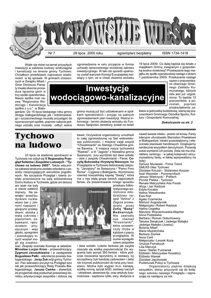 Nr 7 Nr 7 Wiele siê mówi na temat przysz³ych inwestycji w zakresie budowy wodoci¹gów i kanalizacji na terenie gminy Tychowo. Chcia³bym przedstawiæ najnowsze wiadomoci w tej sprawie. W gminach zrzeszonych w Zwi¹zku Miast i Gmin Dorzecza Parsêty trwa³a obecnie procedura ³¹czenia gmin w trzy spó³ki operatorskie. Nasza spó³ka nosi nazwê "Regionalne Wodoci¹gi i Kanalizacja spó³ka z o.o." w Bia³ogardzie. Do 15 lipca bie¿¹cego roku gminy okrêgu bia³ogardzkiego jak i ko³obrzeskiego i szczecineckiego musia³y przyst¹piæ do wyznaczonych spó³ek, poprzez nabycie jednego udzia³u oraz musia³y odbyæ walne 29 lipca 2005 roku egzemplarz bezp³atny zgromadzenia w celu przyjêcia w formie uchwa³y opracowanego wczeniej zakresu inwestycyjnego. W taki oto sposób spe³niony zosta³ warunek Komisji Europejskiej mówi¹cy o tym, ¿e w chwili z³o¿enia wniosku ISSN 1734-1418 19 lipca 2005r. Co dalej bêdzie siê dzia³o z maj¹tkiem Gminy, zwi¹zanym z gospodark¹ wodno-ciekow¹? Przekazanie tego maj¹tku do spó³ki operatorskiej nast¹pi z dniem 1 padziernika 2005r. Przekazanie nast¹pi razem z pracownikami obecnego Gminnego Zak³adu Komunalnego, których lista jest ju¿ uzgodniona. To bêdzie 12 pracowników, a pozostali, poprzez przekszta³cenie zak³adu w jednostkê bud¿etow¹, stan¹ siê pracownikami Gminnego Orodka Sportu, Kultury i Gospodarki Komunalnej. Inwestycje wodoci¹gowo-kanalizacyjne Tychowo na ludowo 23 lipca na stadionie sportowym w Tychowie nie odby³ siê V Regionalny Przegl¹d Solistów i Zespo³ów Ludowych - "Tychowo na ludowo 2005". Tak¿e wieczorna zabawa taneczna zosta³a odwo³ana z powodu niesprzyjaj¹cych warunków pogodowych. Na szczêcie Przegl¹d i loteria zosta³y przeniesione na salê widowiskow¹ Domu Kultury w Tychowie, gdzie ani deszcz ani wiatr nie by³y w stanie zak³óciæ imprezy. Na zewn¹trz - przed budynkiem rozstawiono bar z zimnymi napojami i gor¹cymi przek¹skami, stoiska z wat¹ cukrow¹ i popcornem, zabawkami, rêkodzie³em artystycznym - wiêc g³odni, spragnieni i poszukuj¹cy innych wra¿eñ mogli siê zrealizowaæ. Zespo³y ocenia³a Komisja w sk³adzie: Miros³aw Lucjan Krom - przewodnicz¹cy, Zygmunt Januszkiewicz i w zastêpstwie Bogus³awa Pa³ki - sekretarza powiatu bia³ogardzkiego - Jerzy ¯uk wójt gminy Tychowo. Pan sekretarz przyby³ na Przegl¹d lecz tak jak przewodnicz¹cy Rady Powiatu Bia³ogardzkiego Janusz Æwirko - stwierdzi³, ¿e przyjechali obaj pos³uchaæ prezentacji dorobku artystycznego zespo³ów i dobrze siê gminy musz¹ ju¿ byæ udzia³owcami w spó³kach operatorskich i przyj¹æ na walnych zgromadzeniach plan inwestycji. Wa¿na informacja - termin z³o¿enia wniosku do Funduszu Spójnoci okrelony zosta³ na dzieñ bawiæ. Oczywicie organizatorzy umo¿liwili to ca³ej zgromadzonej na Sali widowiskowej publicznoci. I miejsce zaj¹³ zespó³ "Chwalimianki" ze Starego Chwalimia gmina Barwice, II miejsca nasza tychowska "Radoæ", a III "Jagody" z Niedalina gmina wieszyno. Jury wyró¿ni³o te¿ dwie solistki - obie z zespo³u Chwalimianki - Panie: Cecyliê Bukowsk¹ i Krystynê Nieoczym. Na Przegl¹dzie w Tychowie debiutowa³y zespo³y: "Jarzêbiny" ze wieszyna i "Parno Foro Roma" - Cyganie z Bia³ogardu. Wyró¿niono równie¿ koszaliñsk¹ kapelê "Swaty", która ma u nas sta³¹ grupê swoich zagorza³ych fanów. Za prezentowanie innego sposobu przekazu folklorystycznego wyChwalimianki ró¿niono m³odzie¿owy zespó³ "Anima" z Zegrza prowadzony przez Zofiê "Bebê" Bednarczyk. Nie zawiod³y nas równie¿ "Krosinianki", które uczestniczy³y chyba w ka¿dym z piêciu przegl¹dów. W sumie wyst¹pi³o osiem zespo³ów i dwie solistki. Loteria fantowa jak zwykle cieszy³a siê wielk¹ popularnoci¹! Do wygrania by³o ponad 350 fantów - które podczas losowania ³¹czylimy w zestawy, by szczêliwcy byli bardziej zadowoleni i ¿eby nie trzymaæ publicznoci do rana przy losowaniu. Mo¿na by³o wygraæ m.in. kanapê, szafkê nocn¹, sprzêt AGD, zestawy naczyñ - obiadowe, deserowe itp. oraz artyku³y ¿ywnociowe - wêdzone rybki, sery, s³odycze a Dokoñczenie na str. 2 nawet wie¿e mleko - prosto od krowy. Fanty loteryjne ufundowa³o Starostwo Powiatowe w Bia³ogardzie, lokalni przedsiêbiorcy i w³aciciele placówek handlowych. Dziêkujemy serdecznie wszystkim darczyñcom. Pozwolê sobie wymieniæ ich poni¿ej (lista nie ma charakteru rankingu - w jakiej kolejnoci otrzymywalimy fanty, w takiej wpisywalimy na listê): Dariusz Murawski - Firma Trend GMLKS G³az Tychowo Zdzis³aw Koczan - Stolarstwo Koczan Axel Wechsler - Pommernfisch Janusz Wietrzycki - Polfisch Poczta Polska - Tychowo Renata Matczyñska Arla Foods Alicja i Jan Radziuk Edyta Kocaba Halina Weso³owska Ewa Kret Agata Czarnecka Mariusz Augustyniak Ma³gorzata i Robert Radziuk Halina Cegie³ka Marzena Wojciechowska-Majcher Anna Podstawka Barbara i Roman Go³uchowscy Tamara wi¹tczak i Jadwiga Matejko Jadwiga Matejko (Jowisz) Bo¿ena Milart Maria Mo¿d¿yñska Barbara Ziomek Anna Cerk Ma³gorzata i Leszek Koza Urszula Fornalczyk Lilla Marczyk Irena i Stefan Furmanek El¿bieta i Mieczys³aw Kowalscy El¿bieta Wasiak Zdzis³aw J¹czkowski Posterunek Policji w Tychowie Organizatorzy piêknie dziêkuj¹ wszystkim, którzy przyczynili siê do kolejnego sukcesu naszego Przegl¹du i zapraszaj¹ na nastêpny za rok. 1 Nr 7 Dokoñczenie ze str. 1 Docieraj¹ do mnie komentarze mieszkañców, ¿e Gmina pozbywa siê swojego maj¹tku w zamian za przysz³e inwestycje. Muszê temu stanowczo zaprzeczyæ. Maj¹tek ten bêdzie nadal w³asnoci¹ Gminy Tychowo, tyle ¿e zarz¹dzany w formie spó³ki a nie zak³adu bud¿etowego. To prawda, ¿e bêdzie to spó³ka omiu gmin, ale z naszym przedstawicielem w radzie nadzorczej i walnym zgromadzeniu, z odpowiedni¹ liczb¹ g³osów uzale¿nion¹ od wartoci wnoszonego aportu. Docieraj¹ do mnie równie¿ sygna³y, ¿e poprzez przyst¹pienie do spó³ki próbuje siê przerzuciæ ciê¿ar przysz³ych inwestycji na