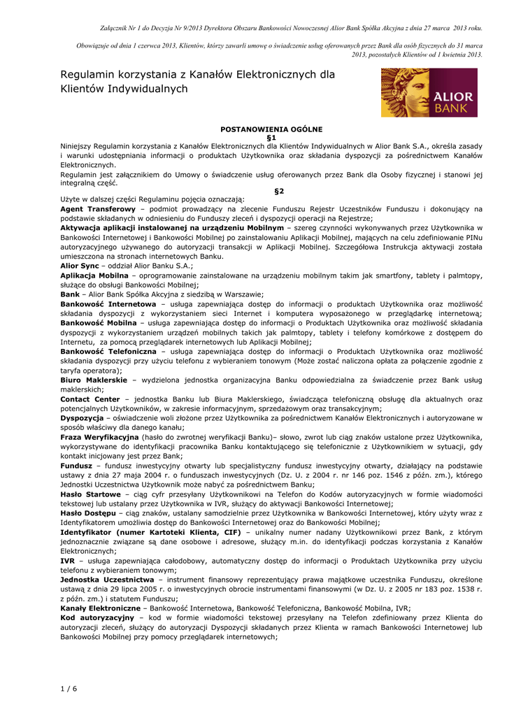 Załącznik Nr 1 do Decyzja Nr 9/2013 Dyrektora Obszaru Bankowości Nowoczesnej Alior Bank Spółka Akcyjna z dnia 27 marca 2013 roku. Obowiązuje od dnia 1 czerwca 2013, Klientów, którzy zawarli umowę o świadczenie usług oferowanych przez Bank dla osób fizycznych do 31 marca 2013, pozostałych Klientów od 1 kwietnia 2013. Regulamin korzystania z Kanałów Elektronicznych dla Klientów Indywidualnych POSTANOWIENIA OGÓLNE §1 Niniejszy Regulamin korzystania z Kanałów Elektronicznych dla Klientów Indywidualnych w Alior Bank S.A., określa zasady i warunki udostępniania informacji o produktach Użytkownika oraz składania dyspozycji za pośrednictwem Kanałów Elektronicznych. Regulamin jest załącznikiem do Umowy o świadczenie usług oferowanych przez Bank dla Osoby fizycznej i stanowi jej integralną część. §2 Użyte w dalszej części Regulaminu pojęcia oznaczają: Agent Transferowy – podmiot prowadzący na zlecenie Funduszu Rejestr Uczestników Funduszu i dokonujący na podstawie składanych w odniesieniu do Funduszy zleceń i dyspozycji operacji na Rejestrze; Aktywacja aplikacji instalowanej na urządzeniu Mobilnym – szereg czynności wykonywanych przez Użytkownika w Bankowości Internetowej i Bankowości Mobilnej po zainstalowaniu Aplikacji Mobilnej, mających na celu zdefiniowanie PINu autoryzacyjnego używanego do autoryzacji transakcji w Aplikacji Mobilnej. Szczegółowa Instrukcja aktywacji została umieszczona na stronach internetowych Banku. Alior Sync – oddział Alior Banku S.A.; Aplikacja Mobilna – oprogramowanie zainstalowane na urządzeniu mobilnym takim jak smartfony, tablety i palmtopy, służące do obsługi Bankowości Mobilnej; Bank – Alior Bank Spółka Akcyjna z siedzibą w Warszawie; Bankowość Internetowa – usługa zapewniająca dostęp do informacji o produktach Użytkownika oraz możliwość składania dyspozycji z wykorzystaniem sieci Internet i komputera wyposażonego w przeglądarkę internetową; Bankowość Mobilna – usługa zapewniająca dostęp do informacji o Produktach Użytkownika oraz możliwość składania dyspozycji z wykorzystaniem urządzeń mobilnych takich jak palmtopy, tablety i telefony komórkowe z dostępem do Internetu, za pomocą przeglądarek internetowych lub Aplikacji Mobilnej; Bankowość Telefoniczna – usługa zapewniająca dostęp do informacji o Produktach Użytkownika oraz możliwość składania dyspozycji przy użyciu telefonu z wybieraniem tonowym (Może zostać naliczona opłata za połączenie zgodnie z taryfa operatora); Biuro Maklerskie – wydzielona jednostka organizacyjna Banku odpowiedzialna za świadczenie przez Bank usług maklerskich; Contact Center – jednostka Banku lub Biura Maklerskiego, świadcząca telefoniczną obsługę dla aktualnych oraz potencjalnych Użytkowników, w zakresie informacyjnym, sprzedażowym oraz transakcyjnym; Dyspozycja – oświadczenie woli złożone przez Użytkownika za pośrednictwem Kanałów Elektronicznych i autoryzowane w sposób właściwy dla danego kanału; Fraza Weryfikacyjna (hasło do zwrotnej weryfikacji Banku)– słowo, zwrot lub ciąg znaków ustalone przez Użytkownika, wykorzystywane do identyfikacji pracownika Banku kontaktującego się telefonicznie z Użytkownikiem w sytuacji, gdy kontakt inicjowany jest przez Bank; Fundusz – fundusz inwestycyjny otwarty lub specjalistyczny fundusz inwestycyjny otwarty, działający na podstawie ustawy z dnia 27 maja 2004 r. o funduszach inwestycyjnych (Dz. U. z 2004 r. nr 146 poz. 1546 z późn. zm.), którego Jednostki Uczestnictwa Użytkownik może nabyć za pośrednictwem Banku; Hasło Startowe – ciąg cyfr przesyłany Użytkownikowi na Telefon do Kodów autoryzacyjnych w formie wiadomości tekstowej lub ustalany przez Użytkownika w IVR, służący do aktywacji Bankowości Internetowej; Hasło Dostępu – ciąg znaków, ustalany samodzielnie przez Użytkownika w Bankowości Internetowej, który użyty wraz z Identyfikatorem umożliwia dostęp do Bankowości Internetowej oraz do Bankowości Mobilnej; Identyfikator (numer Kartoteki Klienta, CIF) – unikalny numer nadany Użytkownikowi przez Bank, z którym jednoznacznie związane są dane osobowe i adresowe, służący m.in. do identyfikacji podczas korzystania z Kanałów Elektronicznych; IVR – usługa zapewniająca całodobowy, automatyczny dostęp do informacji o Produktach Użytkownika przy użyciu telefonu z wybieraniem tonowym; Jednostka Uczestnictwa – instrument finansowy reprezentujący prawa majątkowe uczestnika Funduszu, określone ustawą z dnia 29 lipca 2005 r. o inwestycyjnych obrocie instrumentami finansowymi (w Dz. U. z 2005 nr 183 poz. 1538 r. z późn. zm.) i statutem Funduszu; Kanały Elektroniczne – Bankowość Internetowa, Bankowość Telefoniczna, Bankowość Mobilna, IVR; Kod autoryzacyjny – kod w formie wiadomości tekstowej przesyłany na Telefon zdefiniowany przez Klienta do autoryzacji zleceń, służący do autoryzacji Dyspozycji składanych przez Klienta w ramach Bankowości Internetowej lub Bankowości Mobilnej przy pomocy przeglądarek internetowych; 1/6 PIN autoryzacyjny - ciąg cyfr ustalany przez Użytkownika w sposób poufny podczas aktywacji Aplikacji Mobilnej, służący do autoryzacji Dyspozycji zlecanych przy pomocy Aplikacji Mobilnej; Placówka Banku - jednostka organizacyjna Banku wykonująca czynności bankowe; Połącz punkty - ciąg gestów na ekranie dotykowym, ustalany samodzielnie przez Użytkownika w Aplikacji Mobilnej, który użyty wraz z Identyfikatorem umożliwia dostęp do Aplikacji Mobilnej; Powiadomienia finansowe – usługa umożliwiająca przesyłanie Klientowi, informacji na temat Produktów użytkownika oraz usług świadczonych przez Bank; powiadomienia są przesyłane w postaci jawnej (nieszyfrowanej); Produkt – rachunek lub usługa oferowana przez Bank lub Biuro Maklerskie świadczona na podstawie odpowiedniej umowy i regulaminu; Rejestr – Prowadzona przez Agenta Tr