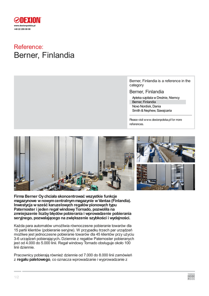 www.dexionpolska.pl +48 22 295 08 00 Reference: Berner, Finlandia Berner, Finlandia is a reference in the category Berner, Finlandia Apteka szpitala w Dreźnie, Niemcy Berner, Finlandia Novo Nordisk, Dania Smith & Nephew, Szwajcaria Please visit www.dexionpolska.pl for more references. Firma Berner Oy chciała skoncentrować wszystkie funkcje magazynowe w nowym centralnym magazynie w Vantaa (Finlandia). Inwestycja w sześć karuzelowych regałów pionowych typu Paternoster i jeden regał windowy Tornado, pozwoliła na zmniejszenie liczby błędów pobierania i wprowadzenie pobierania seryjnego, pozwalającego na zwiększenie szybkości i wydajności. Każda para automatów umożliwia równoczesne pobieranie towarów dla 15 partii klientów (pobieranie seryjne). W przypadku trzech par urządzeń możliwe jest jednoczesne pobieranie towarów dla 45 klientów przy użyciu 3-6 urządzeń pobierających. Dziennie z regałów Paternoster pobieranych jest od 4.000 do 5.000 linii. Regał windowy Tornado obsługuje około 100 linii dziennie. Pracownicy pobierają również dziennie od 7.000 do 8.000 linii zamówień z regału paletowego, co oznacza wprowadzanie i wyprowadzanie z 1/2 www.dexionpolska.pl +48 22 295 08 00 magazynu około 500 palet dziennie. Rozwiązanie: Praca centrum logistycznego wymaga obsługi około 40.000 aktywnych pozycji. Większe towary i palety przechowywane są w regałach paletowych, zaś mniejsze towary w maszynach magazynowych. Towary w maszynach magazynowych umieszczane są w pudłach o maksymalnej pojemności 100 litrów. Dane techniczne: Regał windowy Tornado: Regał o podwójnej głębokości i wysokości 10,3 m Szerokość szuflady: 4.000 mm Głębokość szuflady: 820 mm Liczba szuflad w systemie Tornado DT: 59 + 53 Nośność szuflady: 300 kg / 500 kg Regał karuzelowy pionowy Paternoster 6 regałów typu Paternoster o wysokość: 10,3 m Szerokość półki: 4.100 mm Głębokość półki: 520 mm Liczba półek w regale: 46 + 30 Nośność półki: 400 kg Regał paletowy: Wysokość 9,1 m Ilość miejsc paletowych: 27.500 Posadzka + 6 poziomów belkowych Europalety 800*1200 mm, maks. 750 kg Obciążenie sekcji maks. 12.000 kg 2/2
