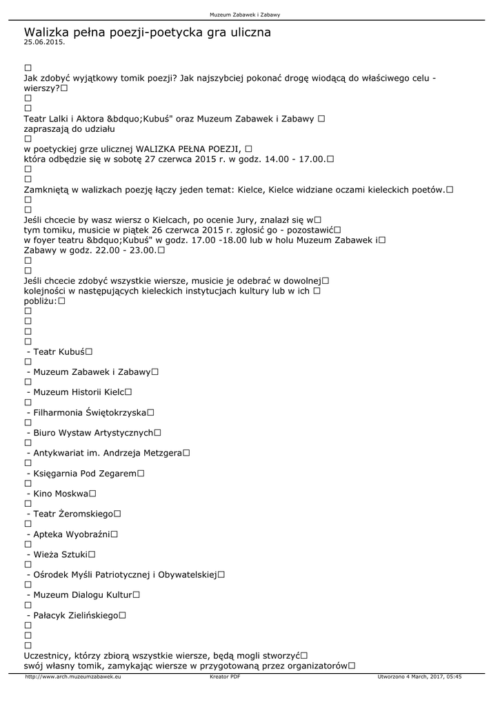 Muzeum Zabawek i Zabawy Walizka pełna poezji-poetycka gra uliczna 25.06.2015. Jak zdobyć wyjątkowy tomik poezji? Jak najszybciej pokonać drogę wiodącą do właściwego celu wierszy? Teatr Lalki i Aktora „Kubuś" oraz Muzeum Zabawek i Zabawy zapraszają do udziału w poetyckiej grze ulicznej WALIZKA PEŁNA POEZJI, która odbędzie się w sobotę 27 czerwca 2015 r. w godz. 14.00 - 17.00. Zamkniętą w walizkach poezję łączy jeden temat: Kielce, Kielce widziane oczami kieleckich poetów. Jeśli chcecie by wasz wiersz o Kielcach, po ocenie Jury, znalazł się w tym tomiku, musicie w piątek 26 czerwca 2015 r. zgłosić go - pozostawić w foyer teatru „Kubuś" w godz. 17.00 -18.00 lub w holu Muzeum Zabawek i Zabawy w godz. 22.00 - 23.00. Jeśli chcecie zdobyć wszystkie wiersze, musicie je odebrać w dowolnej kolejności w następujących kieleckich instytucjach kultury lub w ich pobliżu: - Teatr Kubuś - Muzeum Zabawek i Zabawy - Muzeum Historii Kielc - Filharmonia Świętokrzyska - Biuro Wystaw Artystycznych - Antykwariat im. Andrzeja Metzgera - Księgarnia Pod Zegarem - Kino Moskwa - Teatr Żeromskiego - Apteka Wyobraźni - Wieża Sztuki - Ośrodek Myśli Patriotycznej i Obywatelskiej - Muzeum Dialogu Kultur - Pałacyk Zielińskiego Uczestnicy, którzy zbiorą wszystkie wiersze, będą mogli stworzyć swój własny tomik, zamykając wiersze w przygotowaną przez organizatorów http://www.arch.muzeumzabawek.eu Kreator PDF Utworzono 4 March, 2017, 05:45 Muzeum Zabawek i Zabawy okładkę (projekt Sławomir Golemiec). Do tworzonego tomiku dołączone zostaną, wybrane przez Jury, wiersze kielczan zostawione w teatrze „Kubuś" i w Muzeum Zabawek i Zabawy. Tomik ma stać się drogowskazem, który pomoże nam odnaleźć drogę do poezji. Finał „Poetyckiej gry ulicznej" odbędzie się na scenie teatru „Kubuś" 27 czerwca 2015 r. o godz. 19.00. Zgromadzone w tomikach wiersze zaprezentują kieleccy aktorzy: Agata Sobota, Andrzej Matysiak i Andrzej Cempura, oprawa muzyczna - Kazimierz Kołomyja. Finał będzie również doskonałą okazją do zdobycia autografów kieleckich poetów. SERDECZNIE ZAPRASZAMY! http://www.arch.muzeumzabawek.eu Kreator PDF Utworzono 4 March, 2017, 05:45