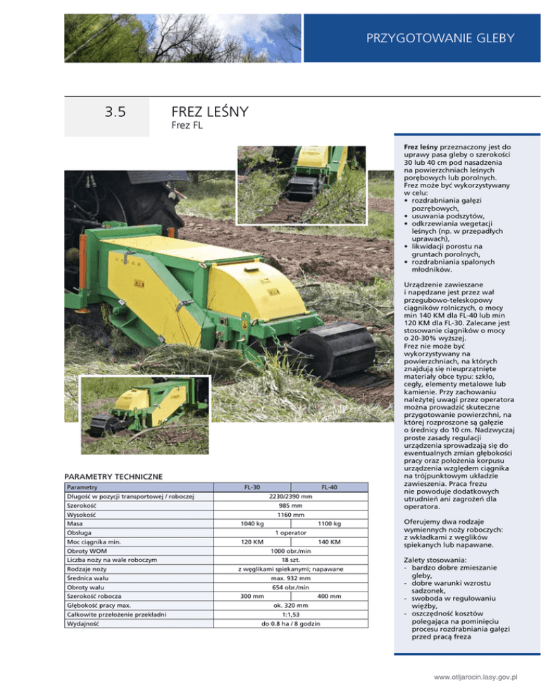 Untergrund PRZYGOTOWANIE vorbereiten GLEBY 3.5 FREZ LEŚNY Frez FL Frez leśny przeznaczony jest do uprawy pasa gleby o szerokości 30 lub 40 cm pod nasadzenia na powierzchniach leśnych porębowych lub porolnych. Frez może być wykorzystywany w celu: • rozdrabniania gałęzi pozrębowych, • usuwania podszytów, • odkrzewiania wegetacji leśnych (np. w przepadłych uprawach), • likwidacji porostu na gruntach porolnych, • rozdrabniania spalonych młodników. PARAMETRY TECHNICZNE Parametry FL-30 FL-40 Długość w pozycji transportowej / roboczej 2230/2390 mm Szerokość 985 mm Wysokość 1160 mm Masa 1040 kg Obsługa Moc ciągnika min. 1100 kg 1 operator 120 KM Obroty WOM 140 KM 1000 obr./min Liczba noży na wale roboczym 18 szt. Rodzaje noży z węglikami spiekanymi; napawane Średnica wału max. 932 mm Obroty wału Szerokość robocza Głębokość pracy max. Całkowite przełożenie przekładni Wydajność 654 obr./min 300 mm 400 mm ok. 320 mm 1:1,53 do 0.8 ha / 8 godzin Urządzenie zawieszane i napędzane jest przez wał przegubowo-teleskopowy ciągników rolniczych, o mocy min 140 KM dla FL-40 lub min 120 KM dla FL-30. Zalecane jest stosowanie ciągników o mocy o 20-30% wyższej. Frez nie może być wykorzystywany na powierzchniach, na których znajdują się nieuprzątnięte materiały obce typu: szkło, cegły, elementy metalowe lub kamienie. Przy zachowaniu należytej uwagi przez operatora można prowadzić skuteczne przygotowanie powierzchni, na której rozproszone są gałęzie o średnicy do 10 cm. Nadzwyczaj proste zasady regulacji urządzenia sprowadzają się do ewentualnych zmian głębokości pracy oraz położenia korpusu urządzenia względem ciągnika na trójpunktowym układzie zawieszenia. Praca frezu nie powoduje dodatkowych utrudnień ani zagrożeń dla operatora. Oferujemy dwa rodzaje wymiennych noży roboczych: z wkładkami z węglików spiekanych lub napawane. Zalety stosowania: - bardzo dobre zmieszanie gleby, - dobre warunki wzrostu sadzonek, - swoboda w regulowaniu więźby, - oszczędność kosztów polegająca na pominięciu procesu rozdrabniania gałęzi przed pracą freza www.otljarocin.lasy.gov.pl