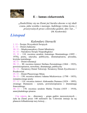E – lamus ciekawostek „Znaleźliśmy się na Ziemi już bardzo dawno w tej skali czasu, jaka wynika z naszego, ludzkiego rytmu życia, z przeżywanych przez człowieka godzin, dni i lat…” (M. Kozłowski) Listopad Kalendarz literacki 1. 11 – Święto Wszystkich Świętych 2. 11 – Dzień Zaduszny 10. 11 – Międzynarodowy Dzień Młodzieży 11. 11 – Narodowe Święto Niepodległości 15. 11 – 110. rocznica urodzin Antoniego Słonimskiego (1895 – 1976), poety, satyryka, publicysty, dramatopisarza, prozaika, krytyka teatralnego 16. 11 – Dzień tolerancji 20. 11 - 80. rocznica śmierci Stefana Żeromskiego (1864 – 1925), powieściopisarza, nowelisty, dramaturga, publicysty 21. 11 – Światowy Dzień Telewizji. Światowy Dzień Życzliwości i Pozdrowień 25. 11 – Dzień Pluszowego Misia 26. 11 – 150. rocznica śmierci Adama Mickiewicza (1798 – 1855), romantycznego poety 27. 11 – 110. rocznica śmierci Aleksandra Dumasa (1824 – 1895), zwanego Dumasem - synem, powieściopisarza i dramaturga francuskiego 30. 11 – 170. rocznica urodzin Marka Twaina (1835 – 1910), amerykańskiego pisarza Czy wiecie, że… dinozaury – grupa gadów mezozoicznych – żyła na Ziemi przez 140 milionów lat. Człowiek istnieje na tej planecie kilkadziesiąt razy krócej…