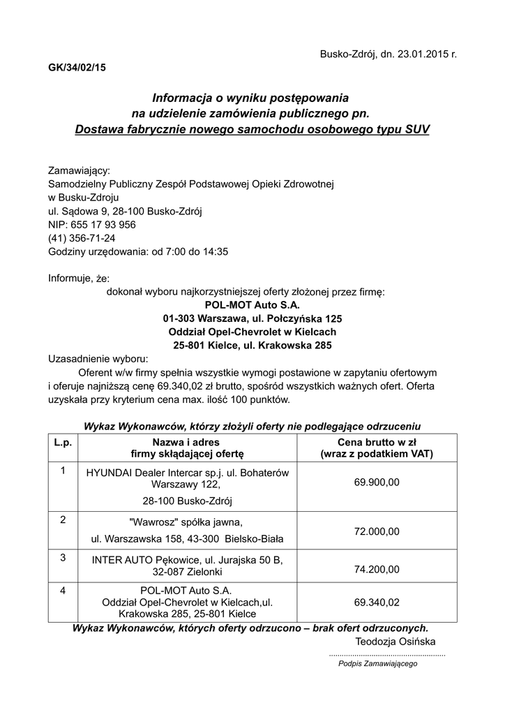 Busko-Zdrój, dn. 23.01.2015 r. GK/34/02/15 Informacja o wyniku postępowania na udzielenie zamówienia publicznego pn. Dostawa fabrycznie nowego samochodu osobowego typu SUV Zamawiający: Samodzielny Publiczny Zespół Podstawowej Opieki Zdrowotnej w Busku-Zdroju ul. Sądowa 9, 28-100 Busko-Zdrój NIP: 655 17 93 956 (41) 356-71-24 Godziny urzędowania: od 7:00 do 14:35 Informuje, że: dokonał wyboru najkorzystniejszej oferty złożonej przez firmę: POL-MOT Auto S.A. 01-303 Warszawa, ul. Połczyńska 125 Oddział Opel-Chevrolet w Kielcach 25-801 Kielce, ul. Krakowska 285 Uzasadnienie wyboru: Oferent w/w firmy spełnia wszystkie wymogi postawione w zapytaniu ofertowym i oferuje najniższą cenę 69.340,02 zł brutto, spośród wszystkich ważnych ofert. Oferta uzyskała przy kryterium cena max. ilość 100 punktów. Wykaz Wykonawców, którzy złożyli oferty nie podlegające odrzuceniu L.p. Nazwa i adres firmy skłądającej ofertę Cena brutto w zł (wraz z podatkiem VAT) 1 HYUNDAI Dealer Intercar sp.j. ul. Bohaterów Warszawy 122, 69.900,00 28-100 Busko-Zdrój 2 "Wawrosz" spółka jawna, ul. Warszawska 158, 43-300 Bielsko-Biała 3 4 INTER AUTO Pękowice, ul. Jurajska 50 B, 32-087 Zielonki 72.000,00 74.200,00 POL-MOT Auto S.A. Oddział Opel-Chevrolet w Kielcach,ul. 69.340,02 Krakowska 285, 25-801 Kielce Wykaz Wykonawców, których oferty odrzucono – brak ofert odrzuconych. Teodozja Osińska ....................................................... Podpis Zamawiającego