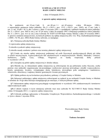 UCHWAŁA NR XV/179/15 RADY GMINY MIELNO z dnia 18 listopada 2015 r. w sprawie opłaty miejscowej Na podstawie art. 18 ust. 2 pkt 8, art. 40 ust. 1 i art. 42 ustawy z dnia 08 marca 1990 r. o samorządzie gminnym (tekst jednolity: Dz. U. z 2015 r. poz. 1515, z 2015 r. poz. 1045), art. 17 ust. 1 pkt 1, ust. 2 i art. 19 pkt 1 lit. b, pkt 2 ustawy z dnia 12 stycznia 1991 r. o podatkach i opłatach lokalnych (tekst jednolity: Dz. U. z 2014 r. poz. 849 ze zm.), art. 47 §4 stawy z dnia 29 sierpnia 1997 r.Ordynacja podatkowa (tekst jednolity: Dz. U. z 2015 r. poz. 613 ze zm.) oraz Uchwały Nr XXIV/233/08 Rady Gminy Mielno z dnia 29 września 2008 r. w sprawie ustalenia miejscowości, na których pobiera się opłatę miejscową (Dz. Urz. Woj. Zachodniopomorskiego z 2008 r. Nr 94, poz. 2002) Rada Gminy uchwala, co następuje: § 1. Niniejszą uchwałą Rada Gminy Mielno: 1) wprowadza opłatę miejscową; 2) określa wysokość opłaty miejscowej; 3) określa zasady ustalania i poboru oraz terminy płatności opłaty miejscowej; § 2. Ustala się stawkę opłaty miejscowej pobieranej od osób fizycznych przebywających dłużej niż dobę w celach turystycznych, wypoczynkowych lub szkoleniowych w miejscowościach: Mielno, Mielenko, Unieście, Sarbinowo, Gąski, Łazy, Chłopy, Niegoszcz za każdą rozpoczętą dobę pobytu w wysokości 1,80 zł. § 3. Zarządza się pobór opłaty miejscowej w drodze inkasa. § 4. Określa się, że inkasentami opłaty miejscowej są zobowiązane do jej pobierania osoby fizyczne, osoby prawne oraz jednostki organizacyjne nie posiadające osobowości prawnej prowadzące ośrodki wypoczynkowe, hotele, pensjonaty, kwatery, wynajmujące domy letniskowe, prowadzące pola campingowe i namiotowe, właściciele, dzierżawcy i najemcy domów gościnnych i kwater prywatnych. § 5. Opłatę pobiera się na kwitariusz przychodowy pobrany z Urzędu Gminy w Mielnie. § 6. Inkasenci pobierający opłatę miejscową zobowiązani są wpłacić ją na rachunek Urzędu Gminy w Mielnie w terminie do 10-go dnia miesiąca następującego po miesiącu, w którym pobrano opłatę. § 7. Inkasentom opłaty miejscowej przysługuje wynagrodzenie w wysokości 10% zainkasowanych i terminowo odprowadzonych opłat. § 8. Z dniem wejścia w życie niniejszej uchwały traci moc uchwała Nr XLV/485/13 Rady Gminy Mielno z dnia 14 listopada 2013 r. w sprawie opłaty miejscowej. § 9. Uchwała podlega ogłoszeniu w Dzienniku Urzędowym Województwa Zachodniopomorskiego i wchodzi w życie z dniem 1 stycznia 2016r. Przewodniczący Rady Gminy Mielno Tadeusz Jarząbek Id: 33BE8C10-5B6C-4F11-863B-DD7ACCEB9ED4. Uchwalony Strona 1