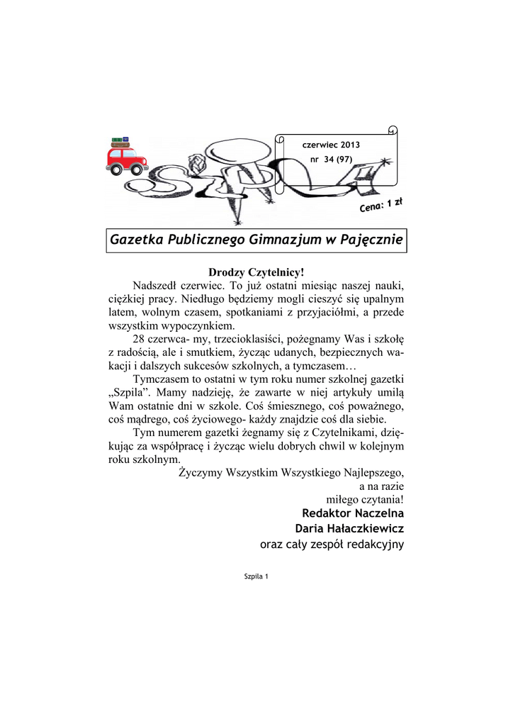 czerwiec 2013 nr 34 (97) 1 zł Cena: Gazetka Publicznego Gimnazjum w Pajęcznie Drodzy Czytelnicy! Nadszedł czerwiec. To już ostatni miesiąc naszej nauki, ciężkiej pracy. Niedługo będziemy mogli cieszyć się upalnym latem, wolnym czasem, spotkaniami z przyjaciółmi, a przede wszystkim wypoczynkiem. 28 czerwca- my, trzecioklasiści, pożegnamy Was i szkołę z radością, ale i smutkiem, życząc udanych, bezpiecznych wakacji i dalszych sukcesów szkolnych, a tymczasem… Tymczasem to ostatni w tym roku numer szkolnej gazetki „Szpila”. Mamy nadzieję, że zawarte w niej artykuły umilą Wam ostatnie dni w szkole. Coś śmiesznego, coś poważnego, coś mądrego, coś życiowego- każdy znajdzie coś dla siebie. Tym numerem gazetki żegnamy się z Czytelnikami, dziękując za współpracę i życząc wielu dobrych chwil w kolejnym roku szkolnym. Życzymy Wszystkim Wszystkiego Najlepszego, a na razie miłego czytania! Redaktor Naczelna Daria Hałaczkiewicz oraz cały zespół redakcyjny Szpila 1 My, trzecioklasiści, pracujący w redakcji gazetki „Szpila”, spędziliśmy w niej naprawdę miłe chwile. Spędziliśmy w tej szkole trzy lata, których na pewno nikt z nas nie zapomni. Przyjemnie pracowało się w „Szpili”. Świetny zespół redakcyjny, miła atmosfera oraz opiekunowie. Mamy nadzieję, że gazetka dalej będzie funkcjonować tak dobrze jak przez te wszystkie lata, a wy chętnie będziecie ją czytać. Życzymy młodszym redaktorom, aby robili jeszcze większe postępy i żeby dalej pisali tak świetne i interesujące artykuły. POŻEGNANIE Drodzy Czytelnicy, niedługo opuszczamy szkołę. Klasa trzecia, zakończenie roku i my- absolwentki. Chciałybyśmy podziękować Nauczycielom za trzy cudownie spędzone lata. Chociaż jeszcze rok temu marzyłyśmy, żeby opuścić te mury, dziś jest nam smutno i żal… Wielu z nas zdało sobie sprawę z tego, że są to ostatnie dni, które spędzimy w tym gronie. Dlatego też kierujemy jeszcze specjalne podziękowania do wszystkich tych, którzy byli nam wsparciem. Jesteśmy przekonane, że dzień rozdania świadectw będzie dla nas dniem pożegnań i początkiem tęsknoty za trzema wspólnie spędzonymi latami w gimnazjum. Dziękujemy Wam, Kochani ! Życzymy zdrowych i szalonych wakacji ! Joanna Moryń i Wiktoria Cytarzyńska Szpila 2 Tarantulla W dzisiejszym numerze zamierzam poruszyć temat niezwykle ważny w obecnym świecie zdominowanym przez mass media. Czy wygląd jest tak bardzo ważny przy doborze przyjaciół? Czy jest on wyznacznikiem cech charakteru? Po czym poznać prawdziwego przyjaciela? Na te pytania po- staram się w mojej pracy odpo- wiedzieć. Zapewne pamiętasz pierwszą osobę poznaną w czasie nauki w gimnazjum. Czy jednak się zastanawiałeś, dlaczego akurat to ta osoba sprawiła, że zechciałeś ją poznać? Zanim zdecydowałeś się na odwagę, żeby do niej podejść, dokładnie się jej przyjrzałeś. Szczególnie ważne jest w kontakcie z nieznajomym pierwsze wrażenie, bo to ono sprawia, że chcesz bliżej tę osobę poznać. Estetyka jest niezwykle ważna w zawiązywaniu więzi międzyludzkich. Nieprzyjemny zapach czy brak higieny osobistej mogą sprawić, że potencjalny rozmówca zrezygnuje ze znajo- Szpila 3 mości. zumieją. Moim zdaniem ubiór może wiele powiedzieć o człowieku. Dzięki temu łatwo jest określić zainteresowania czy rodzaj grupy społecznej, do jakiej należy dana osoba. Dzięki tym informacjom mniej więcej można stwierdzić, czy warto jest nawiązywać z nią rozmowę (osoby o sprzecznych przekonaniach i gustach mogą źle reagować na siebie wzajemnie). Na wygląd składa się również sposób poruszania się i ogólne odnajdywanie się w grupie. W tej pracy pragnę podzielić społeczność ludzką na dwa sposoby: osoby egocentryczne (zapatrzony w siebie, dostrzegający przeważne tylko własne problemy) i altruistyczne (myślące o innych, troskliwe) oraz ekstrawertyk( osoba otwarta towarzyska) i introwertyk (osoba skryta, nieśmiała). Przeważnie dwa przeciwieństwa są swoim dopełnieniem i to właśnie one najlepiej się ro- Ostatnie pytanie, z jakim będę się musiała uporać, jest jednym z tego rodzaju pytań, na które trudno znaleźć właściwą odpowiedź. Prawdziwego przyjaciela nie można poznać po wyglądzie. Prawdziwy przyjaciel znosi każde dziwactwo i z uwagą wysłucha każdej troski. Jest szczery a zarazem miły. Zawsze służy dobrą radą i nie opuszcza w potrzebie. Potrafi wybaczyć wszystko i odrzucić w niepamięć złe chwile. Rozś mi e s z y , g d y w ży c i e się ,,wywróci do góry nogami’’. Synonimem ideału, o którym często zapominamy, jest kłamstwo. Ważne jest, by dobrze umieć oddzielić rzeczywistość od wyobraźni. Dążenie do ideału jest bezsensowne. Ideały są jak gwiazdy na niebie-każdy do nich dąży, lecz nikt nie może ich posiąść. Szpila 4 Marta Bednarska To co ważne, najważniejsze! Rok Juliana Tuwima Uchwałą Sejmu z 7 grudnia 2012 rok 2013 ogłoszony został Rokiem Juliana Tuwima w 60 rocznicę śmierci poety/ zm. 27 12.1953r./. Był autorem wodewili, skeczy, librett operetkowych i tekstów piosenek. To jeden z najpopularniejszych poetów dwudziestolecia międzywojennego. Tłumacz poezji rosyjskiej, francuskiej, niemieckiej oraz łaciny. Podpisywał się ponad czterdziestoma pseudonimami m.in. Oldlen, Tuvim, Frenik, Wim. Czy wiesz, że: Julian Tuwim to kolejny po Janie Brzechwie poeta, którego wiersze stanowią klasykę polskiej literatury dziecięcej. Tuwima poezja dla dzieci jest napisana językiem dowcipnym, utwory przedstawiają jakiś fragment rzeczywistości, wiele z wierszyków ma ukryty morał lub przesłanie. Julian Tuwim to poeta wyróżniany i nagradzany. Julian Tuwim w swojej twórczości wykazywał się niezwykłym poczuciem humoru, satyrycznym i dowcipnym ujmowaniem rzeczywistości. Ale humor i satyrę można znaleźć nie tylko w jego wierszach. Obie te cechy równie mocno da