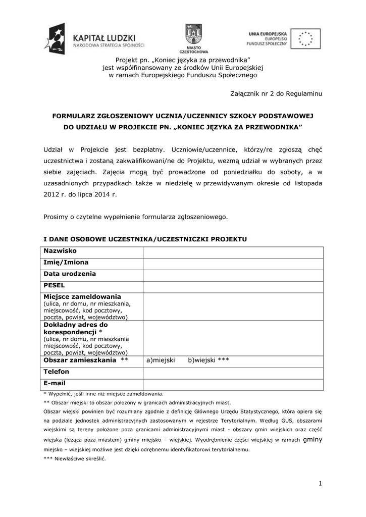 Projekt pn. „Koniec języka za przewodnika” jest współfinansowany ze środków Unii Europejskiej w ramach Europejskiego Funduszu Społecznego Załącznik nr 2 do Regulaminu FORMULARZ ZGŁOSZENIOWY UCZNIA/UCZENNICY SZKOŁY PODSTAWOWEJ DO UDZIAŁU W PROJEKCIE PN. „KONIEC JĘZYKA ZA PRZEWODNIKA” Udział w Projekcie jest bezpłatny. Uczniowie/uczennice, którzy/re zgłoszą chęć uczestnictwa i zostaną zakwalifikowani/ne do Projektu, wezmą udział w wybranych przez siebie zajęciach. Zajęcia mogą być prowadzone od poniedziałku do soboty, a w uzasadnionych przypadkach także w niedzielę w przewidywanym okresie od listopada 2012 r. do lipca 2014 r. Prosimy o czytelne wypełnienie formularza zgłoszeniowego. I DANE OSOBOWE UCZESTNIKA/UCZESTNICZKI PROJEKTU Nazwisko Imię/Imiona Data urodzenia PESEL Miejsce zameldowania (ulica, nr domu, nr mieszkania, miejscowość, kod pocztowy, poczta, powiat, województwo) Dokładny adres do korespondencji * (ulica, nr domu, nr mieszkania miejscowość, kod pocztowy, poczta, powiat, województwo) Obszar zamieszkania ** a)miejski b)wiejski *** Telefon E-mail * Wypełnić, jeśli inne niż miejsce zameldowania. ** Obszar miejski to obszar położony w granicach administracyjnych miast. Obszar wiejski powinien być rozumiany zgodnie z definicję Głównego Urzędu Statystycznego, która opiera się na podziale jednostek administracyjnych zastosowanym w rejestrze Terytorialnym. Według GUS, obszarami wiejskimi są tereny położone poza granicami administracyjnymi miast - obszary gmin wiejskich oraz część wiejska (leżąca poza miastem) gminy miejsko – wiejskiej. Wyodrębnienie części wiejskiej w ramach gminy miejsko – wiejskiej możliwe jest dzięki odrębnemu identyfikatorowi terytorialnemu. *** Niewłaściwe skreślić. 1 Projekt pn. „Koniec języka za przewodnika” jest współfinansowany ze środków Unii Europejskiej w ramach Europejskiego Funduszu Społecznego II DANE SZKOŁY Nazwa szkoły Szkoła Podstawowa nr 36 Adres szkoły 42-200 Częstochowa, ul. Kasztanowa 7/9 Klasa III. WYBÓR FORMY WSPARCIA (należy zaznaczyć krzyżykiem) 1. Doradztwo zawodowe w szkołach podstawowych - trening autoprezentacji Nazwa zajęć Wybór formy wsparcia Trening autoprezentacji Grupowe doradztwo zawodowe 2. Kurs II języka obcego w szkołach podstawowych Nazwa zajęć Wybór formy wsparcia Język niemiecki Język francuski ----------------------------- Język Rosyjski ----------------------------- Język hiszpański ----------------------------- 3. Warsztaty rozwijające kompetencje kluczowe w szkołach podstawowych Nazwa zajęć Wybór formy wsparcia Warsztaty matematyczno-przyrodnicze z elementami informatyki Warsztaty humanistyczne z akcentem na regionalizm Warsztaty artystyczno-muzyczne Warsztaty artystyczno-plastyczne Warsztaty artystyczno-teatralno-filmowe Trening pamięci Wyrażam/nie wyrażam* zgodę na wykorzystanie wizerunku mojego dziecka na potrzeby realizacji przedmiotowego Projektu. Zgoda obejmuje utrwalanie, obróbkę i powielanie zdjęć za pośrednictwem dowolnego medium. *niewłaściwe skreślić ………………………………………..... (miejscowość i data) .............................................. (podpis rodzica/opiekuna prawnego) 2