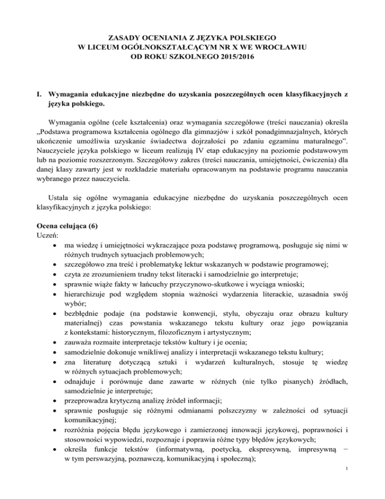ZASADY OCENIANIA Z JĘZYKA POLSKIEGO W LICEUM OGÓLNOKSZTAŁCĄCYM NR X WE WROCŁAWIU OD ROKU SZKOLNEGO 2015/2016 I. Wymagania edukacyjne niezbędne do uzyskania poszczególnych ocen klasyfikacyjnych z języka polskiego. Wymagania ogólne (cele kształcenia) oraz wymagania szczegółowe (treści nauczania) określa „Podstawa programowa kształcenia ogólnego dla gimnazjów i szkół ponadgimnazjalnych, których ukończenie umożliwia uzyskanie świadectwa dojrzałości po zdaniu egzaminu maturalnego”. Nauczyciele języka polskiego w liceum realizują IV etap edukacyjny na poziomie podstawowym lub na poziomie rozszerzonym. Szczegółowy zakres (treści nauczania, umiejętności, ćwiczenia) dla danej klasy zawarty jest w rozkładzie materiału opracowanym na podstawie programu nauczania wybranego przez nauczyciela. Ustala się ogólne wymagania edukacyjne niezbędne do uzyskania poszczególnych ocen klasyfikacyjnych z języka polskiego: Ocena celująca (6) Uczeń: ma wiedzę i umiejętności wykraczające poza podstawę programową, posługuje się nimi w różnych trudnych sytuacjach problemowych; szczegółowo zna treść i problematykę lektur wskazanych w podstawie programowej; czyta ze zrozumieniem trudny tekst literacki i samodzielnie go interpretuje; sprawnie wiąże fakty w łańcuchy przyczynowo-skutkowe i wyciąga wnioski; hierarchizuje pod względem stopnia ważności wydarzenia literackie, uzasadnia swój wybór; bezbłędnie podaje (na podstawie konwencji, stylu, obyczaju oraz obrazu kultury materialnej) czas powstania wskazanego tekstu kultury oraz jego powiązania z kontekstami: historycznym, filozoficznym i artystycznym; zauważa rozmaite interpretacje tekstów kultury i je ocenia; samodzielnie dokonuje wnikliwej analizy i interpretacji wskazanego tekstu kultury; zna literaturę dotyczącą sztuki i wydarzeń kulturalnych, stosuje tę wiedzę w różnych sytuacjach problemowych; odnajduje i porównuje dane zawarte w różnych (nie tylko pisanych) źródłach, samodzielnie je interpretuje; przeprowadza krytyczną analizę źródeł informacji; sprawnie posługuje się różnymi odmianami polszczyzny w zależności od sytuacji komunikacyjnej; rozróżnia pojęcia błędu językowego i zamierzonej innowacji językowej, poprawności i stosowności wypowiedzi, rozpoznaje i poprawia różne typy błędów językowych; określa funkcje tekstów (informatywną, poetycką, ekspresywną, impresywną − w tym perswazyjną, poznawczą, komunikacyjną i społeczną); 1 samodzielnie przedstawia wyniki swojej pracy w formie ustnej i pisemnej, stosując zróżnicowane formy wypowiedzi; sprawnie redaguje teksty własne i cudze; aktywnie słucha wykładu, potrafi go streścić, w punktach zapisać najważniejsze tezy i ich uzasadnienie; odróżnia fakty od opinii, tworzy własne opinie i konfrontuje je z innymi poglądami, wyciąga wnioski; samodzielnie rozwija swoje zainteresowania; potrafi swoją wiedzą zainteresować innych; aktywnie wykorzystuje swoją wiedzę na lekcji i na zajęciach pozaszkolnych; realizuje indywidualny program nauczania z języka polskiego; osiąga znaczące sukcesy w konkursach międzyszkolnych, uzyskuje tytuł laureata konkursu polonistycznego o zasięgu wojewódzkim lub ogólnopolskim oraz tytuł laureata lub finalisty ogólnopolskiej olimpiady polonistycznej. Ocena bardzo dobra (5) Uczeń: ma pełną wiedzę i umiejętności określone w podstawie programowej, posługuje się nimi w różnych sytuacjach problemowych; szczegółowo zna treść i problematykę lektur wskazanych w podstawie programowej; czyta ze zrozumieniem tekst literacki i samodzielnie go interpretuje; sprawnie wiąże fakty w łańcuchy przyczynowo-skutkowe i wyciąga wnioski; hierarchizuje pod względem stopnia ważności wydarzenia literackie, uzasadnia swój wybór; sprawnie podaje (na podstawie konwencji, stylu, obyczaju oraz obrazu kultury materialnej) czas powstania wskazanego tekstu kultury oraz jego powiązania z kontekstami: historycznym, filozoficznym i artystycznym; samodzielnie dokonuje analizy i interpretacji określonego tekstu kultury; odszukuje i porównuje dane zawarte w różnych (nie tylko pisanych) źródłach, samodzielnie je interpretuje; zauważa rozmaite interpretacje tekstów kultury; samodzielnie ocenia wydarzenia kulturalne; przeprowadza krytyczną analizę źródeł informacji; sprawnie posługuje się różnymi odmianami polszczyzny w zależności od sytuacji komunikacyjnej; rozróżnia pojęcia błędu językowego i zamierzonej innowacji językowej, poprawności i stosowności wypowiedzi, rozpoznaje i poprawia różne typy błędów językowych; określa funkcje tekstów (informatywną, poetycką, ekspresywną, impresywną − w tym perswazyjną, poznawczą, komunikacyjną i społeczną); samodzielnie przedstawia wyniki swojej pracy w formie ustnej i pisemnej; sprawnie redaguje teksty własne i cudze; aktywnie słucha wykładu, potrafi go streścić, w punktach zapisać najważniejsze tezy; odróżnia fakty od opinii, tworzy własne opinie i konfrontuje je z innymi poglądami; aktywnie wykorzystuje swoją wiedzę na lekcji; 2 precyzyjnie posługuje się odpowiednią terminologią dotyczącą literatury i innych tekstów kulturowych; posługuje się bogatym słownictwem. Ocena dobra (4) Uczeń: ma podstawową wiedzę i umiejętności określone w podstawie programowej, posługuje się nimi w typowych sytuacjach; dobrze zna treść i problematykę lektur wskazanych w podstawie programowej; czyta ze zrozumieniem tekst literacki i interpretuje go; sprawnie wiąże fakty w łańcuchy przyczynowo-skutkowe; hierarchizuje pod względem stopnia ważności wydarzenia literackie; rozpoznaje (na podstawie konwencji, stylu, obyczaju oraz obrazu kultury materialnej) czas powstania wskazanego tekstu kultury oraz określa jego powiązania z kontekstem historycznym; samodzielnie dokonuje analizy wskazanego tekstu kultury; znajduje i porównuje informacje zawarte w różnych (