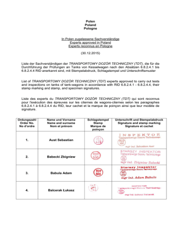 Polen Poland Pologne In Polen zugelassene Sachverständige Experts approved in Poland Experts reconnus en Pologne (30.12.2015) Liste der Sachverständigen der TRANSPORTOWY DOZÓR TECHNICZNY (TDT), die für die Durchführung der Prüfungen an Tanks von Kesselwagen nach den Absätzen 6.8.2.4.1 bis 6.8.2.4.4 RID anerkannt sind, mit Stempelabdruck, Schlagstempel und Unterschriftsmuster List of TRANSPORTOWY DOZÓR TECHNICZNY (TDT) experts approved to carry out tests and inspections on tanks of tank-wagons in accordance with RID 6.8.2.4.1 - 6.8.2.4.4, their stamp marking and stamp, and specimen signatures. Liste des experts du TRANSPORTOWY DOZÓR TECHNICZNY (TDT) qui sont reconnus pour l'exécution des épreuves sur les citernes de wagons-citernes selon les paragraphes 6.8.2.4.1 à 6.8.2.4.4 du RID, leur cachet et la marque de poinçon ainsi que leur modèle de signature. Ordungszahl Order No. No d’ordre Name und Vorname Name and surname Nom et prénom 1. Aust Sebastian 2. Babecki Zbigniew 3. Babula Adam 4. Balcerak Łukasz Schlagstempel Stamp Marque de poinçon Unterschrift und Stempelabdruck Signature and stamp marking Signature et cachet Ordungszahl Order No. No d’ordre Name und Vorname Name and surname Nom et prénom 5. Bartłomiejczyk Wojciech 6. Bernacki Jan 7. Bernatek Andrzej 8. Bołtryk Mirosław 9. Borowiec Zbigniew 10. Borkowski Zbigniew 11. Buduś Zbigniew 12. Buliński Krzysztof 13. Chmielewski Sławomir 14. Cieplińska Wioletta 15. Czech Tomasz Schlagstempel Stamp Marque de poinçon Unterschrift und Stempelabdruck Signature and stamp marking Signature et cachet Ordungszahl Order No. No d’ordre Name und Vorname Name and surname Nom et prénom 16. Drożyński Wojciech 17. Firek Jerzy 18. Gawron Sebastian 19. Gieczys Mieczysław 20. Gintowt Henryk 21. Gralicki Jacek 22. Grześkowiak Krzysztof 23. Halicki Bogumił 24. Hippner Andrzej 25. Juściński Bernard 26. Jałoszyński Bartosz Schlagstempel Stamp Marque de poinçon Unterschrift und Stempelabdruck Signature and stamp marking Signature et cachet Ordungszahl Order No. No d’ordre Name und Vorname Name and surname Nom et prénom 27. Kelm Małgorzata 28. Kiers Grzegorz 29. Klonowski Władysław 30. Koniuszewski Andrzej 31. Kostrobało Marian 32. Krawczykowski Paweł 33. Kruczkowski Grzegorz 34. Krzelowski Karol 35. Lenkiewicz Józef 36. Lis Jacek 37. Łagodzki Janusz Schlagstempel Stamp Marque de poinçon Unterschrift und Stempelabdruck Signature and stamp marking Signature et cachet Ordungszahl Order No. No d’ordre Name und Vorname Name and surname Nom et prénom 38. Mackiewicz Józef 39. Majewski Jan 40. Mateja Krzysztof 41. Mazur Tomasz 42. Musialik Marcin 43. Myśliwiec Adam 44. Oss Mateusz 45. Pieczara Krzysztof 46. Pieczykolan Mirosław 47. Pizoń Dariusz 48. Prucnal Jarosław Schlagstempel Stamp Marque de poinçon Unterschrift und Stempelabdruck Signature and stamp marking Signature et cachet Ordungszahl Order No. No d’ordre Name und Vorname Name and surname Nom et prénom 49. Prygiel Ryszard 50. Prysiażny Krzysztof 51. Reymann Damian 52. Rodo Aleksander 53. Rosolski Wojciech 54. Rychły Krzysztof 55. Sadoch Tomasz 56. Sawiński Adam 57. Sielski Damian 58. Skłodowski Wacław 59. Sowiński Jarosław Schlagstempel Stamp Marque de poinçon Unterschrift und Stempelabdruck Signature and stamp marking Signature et cachet Ordungszahl Order No. No d’ordre Name und Vorname Name and surname Nom et prénom 60. Stachura Grzegorz 61. Stróżyński Andrzej 62. Szandrach Piotr 63. Szepit Marcin 64. Szwarczyński Dariusz 65. Szymczak Arkadiusz 66. Ślusarczyk Mariusz 67. Świechowicz Leszek 68. Trachta Mariusz 69. Urbaniak Marcin 70. Wajsowicz Wojciech Schlagstempel Stamp Marque de poinçon Unterschrift und Stempelabdruck Signature and stamp marking Signature et cachet Ordungszahl Order No. No d’ordre Name und Vorname Name and surname Nom et prénom 71. Wasilewski Arkadiusz 72. Włodarczyk Aleksander 73. Włodarczyk Marceli 74. Zapiór Zdzisław 75. Zbierski Andrzej Schlagstempel Stamp Marque de poinçon __________ Unterschrift und Stempelabdruck Signature and stamp marking Signature et cachet