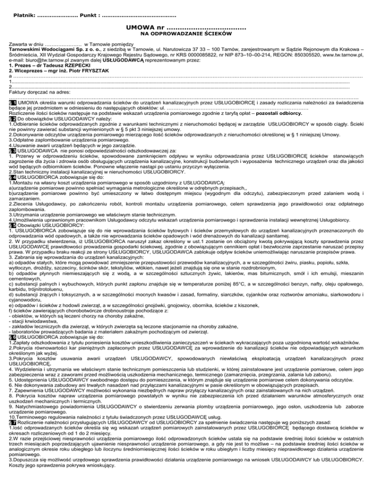 Płatnik: ………………….. Punkt : …………………………………… UMOWA nr ……………………………… NA ODPROWADZANIE ŚCIEKÓW Zawarta w dniu …………………. w Tarnowie pomiędzy Tarnowskimi Wodociągami Sp. z o. o., z siedzibą w Tarnowie, ul. Narutowicza 37 33 – 100 Tarnów, zarejestrowanym w Sądzie Rejonowym dla Krakowa – Śródmieścia, XII Wydział Gospodarczy Krajowego Rejestru Sądowego, nr KRS 0000085822, nr NIP 873–10–00-214, REGON: 850305520, www.tw.tarnow.pl, e-mail: [email protected] zwanym dalej USŁUGODAWCĄ reprezentowanym przez: 1. Prezes – dr Tadeusz RZEPECKI 2. Wiceprezes – mgr inż. Piotr FRYSZTAK a ……………………………………………………………………………………………………………………………………………………………………………………… 1................................................................................................................................................................................................................................................ 2................................................................................................................................................................................................................................................ Faktury doręczać na adres: ……………………………………………………………………………………………………………………………………………………………………………………… § 1 UMOWA określa warunki odprowadzania ścieków do urządzeń kanalizacyjnych przez USŁUGOBIORCĘ i zasady rozliczania należności za świadczenia będące jej przedmiotem w odniesieniu do następujących obiektów: ul. ………………………………………………………………………… Rozliczenie ilości ścieków następuje na podstawie wskazań urządzenia pomiarowego zgodnie z taryfą opłat – pozostali odbiorcy. § 2 Do obowiązków USŁUGODAWCY należy: 1.Odbieranie ścieków odprowadzanych zgodnie z warunkami technicznymi z nieruchomości będącej w zarządzie USŁUGOBIORCY w sposób ciągły. Ścieki nie powinny zawierać substancji wymienionych w § 5 pkt 3 niniejszej umowy. 2.Dokonywanie odczytów urządzenia pomiarowego mierzącego ilość ścieków odprowadzanych z nieruchomości określonej w § 1 niniejszej Umowy. 3.Odpłatne zaplombowanie urządzenia pomiarowego. 4.Usuwanie awarii urządzeń będących w jego zarządzie. § 3 USŁUGODAWCA nie ponosi odpowiedzialności odszkodowawczej za: 1. Przerwy w odprowadzeniu ścieków, spowodowane zamknięciem odpływu w wyniku odprowadzania przez USŁUGOBIORCĘ ścieków stanowiących zagrożenie dla życia i zdrowia osób obsługujących urządzenia kanalizacyjne, konstrukcji budowlanych i wyposażenia technicznego urządzeń oraz dla jakości wód będących odbiornikiem ścieków. Ponowne włączenie nastąpi po ustaniu przyczyn wyłączenia. 2.Stan techniczny instalacji kanalizacyjnej w nieruchomości USŁUGOBIORCY. § 4 USŁUGOBIORCA zobowiązuje się do: 1.Montażu na własny koszt urządzenia pomiarowego w sposób uzgodniony z USŁUGODAWCĄ: a)urządzenie pomiarowe powinno spełniać wymagania metrologiczne określone w odrębnych przepisach,, b)urządzenie pomiarowe powinno być umieszczony w łatwo dostępnym miejscu (wygodnym dla odczytu), zabezpieczonym przed zalaniem wodą i zamarzaniem. 2.Zlecenia Usługodawcy, po zakończeniu robót, kontroli montażu urządzenia pomiarowego, celem sprawdzenia jego prawidłowości oraz odpłatnego zaplombowania. 3.Utrzymania urządzenie pomiarowego we właściwym stanie technicznym. 4.Umożliwienia uprawnionym pracownikom Usługodawcy odczytu wskazań urządzenia pomiarowego i sprawdzenia instalacji wewnętrznej Usługobiorcy. § 5 Obowiązki USŁUGOBIORCY: 1. USŁUGOBIORCA zobowiązuje się do nie wprowadzania ścieków bytowych i ścieków przemysłowych do urządzeń kanalizacyjnych przeznaczonych do odprowadzania wód opadowych, a także nie wprowadzania ścieków opadowych i wód drenażowych do kanalizacji sanitarnej. 2. W przypadku stwierdzenia, iż USŁUGOBIORCA naruszył zakaz określony w ust.1 zostanie on obciążony kwotą pokrywającą koszty sprawdzenia przez USŁUGODAWCĘ prawidłowości prowadzenia gospodarki ściekowej, zgodnie z obowiązującym cennikiem opłat i bezwłocznie zaprzestanie naruszać przepisy prawa. W przypadku braku reakcji ze strony USŁUGOBIORCY, USŁUGODAWCA zablokuje odpływ ścieków uniemożliwiając naruszanie przepisów prawa. 3. Zabrania się wprowadzania do urządzeń kanalizacyjnych: a) odpadów stałych, które mogą powodować zmniejszenie przepustowości przewodów kanalizacyjnych, a w szczególności żwiru, piasku, popiołu, szkła, wytłoczyn, drożdży, szczeciny, ścinków skór, tekstyliów, włókien, nawet jeżeli znajdują się one w stanie rozdrobnionym, b) odpadów płynnych niemieszających się z wodą, a w szczególności sztucznych żywic, lakierów, mas bitumicznych, smół i ich emulsji, mieszanin cementowych, c) substancji palnych i wybuchowych, których punkt zapłonu znajduje się w temperaturze poniżej 85°C, a w szczególności benzyn, nafty, oleju opałowego, karbidu, trójnitrotoluenu, d) substancji żrących i toksycznych, a w szczególności mocnych kwasów i zasad, formaliny, siarczków, cyjanków oraz roztworów amoniaku, siarkowodoru i cyjanowodoru, e) odpadów i ścieków z hodowli zwierząt, a w szczególności gnojówki, gnojowicy, obornika, ścieków z kiszonek, f) ścieków zawierających chorobotwórcze drobnoustroje pochodzące z: - obiektów, w których są leczeni chorzy na choroby zakaźne, - stacji krwiodawstwa, - zakładów leczniczych dla zwierząt, w których zwierzęta są leczone stacjonarnie na choroby zakaźne, - laboratoriów prowadzących badania z materiałem zakaźnym pochodzącym od zw