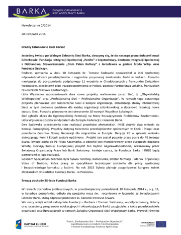 Newsletter nr 2/2014 28 listopada 2014 Drodzy Członkowie Sieci Barka! Jesteśmy świeżo po Walnym Zebraniu Sieci Barka, cieszymy się, że do naszego grona dołączyli nowi Członkowie: Fundacja Integracji Społecznej „Feniks” z Częstochowy, Centrum Integracji Społecznej z Odolanowa, Stowarzyszenie „Dom Pełen Kultury” z Jarosławca w gminie Środa Wlkp. oraz Fundacja Gębiczyn. Podczas spotkania w dniu 10 listopada br. Tomasz Sadowski opowiedział o idei społecznej odpowiedzialności przedsiębiorstw i nagrodzie przyznanej środowisku Barki w Indiach. Ponadto nawiązując do porozumienia podpisanego 11 września w Chudobczycach z francuskim Związkiem Hodowców, przedstawił plan rozpowszechnienia w Polsce, poprzez Partnerstwa Lokalne, francuskich ras owczych Masywu Centralnego. Lidia Węsierska zaprezentowała dwa nowe projekty realizowane przez Sieć, tj. „Obywatelską Wielkopolskę” oraz „Profesjonalną Sieć – Profesjonalne Organizacje”. W ramach tego ostatniego projektu planowane jest rozszerzenie Sieci o kolejne organizacje, aktualizacja strony internetowej Sieci, w tym zrobienie podstron dla każdej organizacji członkowskiej, a docelowo redakcję nowe statutu Sieci. Ponadto planowane jest utworzenie 10 nowych Wspólnot Lokalnych. Sieć zgłosiła akces do Ogólnopolskiej Federacji na Rzecz Rozwiązywania Problemów Bezdomności. Lidia Węsierska została kandydatem do Zarządu Federacji z ramienia Barki. Ewa Sadowska przedstawiła stan realizacji projektów afrykańskich. INISE złożyło dwa wnioski do Komisji Europejskiej. Projekty dotyczą tworzenia przedsiębiorstw społecznych w Kenii i Etiopii oraz powołania Centrów Nowej Generacji dla migrantów w Europie. Decyzja KE w sprawie wniosku dotyczącego Kenii i Etiopii została opóźniona . Projekt ten został poparty przez posła do PE Jerzego Buzka, byłego posła do PE Filipa Kaczmarka, a obecnie jest monitorowany przez europosła Bogdana Wentę. Decyzją Komisji Europejskiej projekt ten będzie najprawdopodobniej realizowany przez Światową Organizację Pracy lub Bank Światowy. Istnieje szansa, że Fundacja Barka i INISE będą partnerami w jego realizacji. Gościem Specjalnym Zebrania była Sylwia Forchap, Kamerunka, doktor farmacji , liderka organizacji Voice of Nations, która pracę ze specyfikami leczniczymi zostawiła dla pracy społecznej i bezpośredniego kontaktu z ludźmi. Na rok 2015 Sylwia planuje zorganizować kongres kobiet afrykańskich w siedzibie Fundacji Barka - w Poznaniu. Trwają obchody 25-lecia Fundacji Barka W ramach obchodów jubileuszowych, w przedświąteczny poniedziałek 10 listopada 2014 r., o g. 11, w katedrze poznańskiej, odbyła się specjalna msza św. rocznicowa w łączności ze świadectwami Liderów Barki, którą odprawił proboszcz ks. kanonik Ireneusz Szwarc. We mszy wzięli udział założyciele Fundacji – Barbara i Tomasz Sadowscy, współpracownicy, liderzy oraz uczestnicy programów edukacyjnych i aktywizujących Barki, przyjaciele, a także przedstawiciele organizacji współpracujących w ramach Związku Organizacji Sieć Współpracy Barka. Przybyli również Projekt „Profesjonalna Sieć – Profesjonalne Organizacje” współfinansowany ze środków Unii Europejskiej w ramach Europejskiego Funduszu Społecznego reprezentanci Barek zagranicznych, w tym m.in. z Wielkiej Brytanii, Holandii, Irlandii i Kanady. Uroczystego charakteru spotkaniu dodała bardzo osobista homilia księdza Ireneusza, śpiew Magdaleny Nowackiej – solistki Teatru Wielkiego w Poznaniu, niezwykła wspólna modlitwa w wykonaniu grupy aktorów przedstawienia „Mewa”, a także świadectwa Liderów Barki – Ryszarda Nowickiego, Andrzeja Dawidowskiego i Grzegorza Rogowicza. Następnie ksiądz proboszcz zaprosił wszystkich uczestników mszy do zwiedzania katedry i do wizyty w podziemiach, gdzie spoczywają pierwsi władcy Polski oraz biskupi poznańscy. Na zakończenie wszyscy obejrzeli film o historii kościoła katedralnego. A następnego dnia odbył się kolejny pokaz spektaklu „Mewa” w reżyserii Sylwestra Woronieckiego. Przypomnijmy, że aktorami w tym spektaklu byli uczestnicy licznych programów edukacyjnych i aktywizujących prowadzonych przez Fundację Barka i współpracujące z nią organizacje oraz Ośrodek dla Bezdomnych nr 1 w Poznaniu, a także liderzy, pracownicy i współpracownicy Fundacji Barka. Spektakl odbył się, podobnie jak za pierwszym razem, w sali koncertowej Poznańskiej Ogólnokształcącej Szkoły Muzycznej przy ul. Solnej 12. „Drabiny Jakubowe 2014” rozdane Tradycyjnie od kilku lat, 11 listopada w Święto Niepodległości, Fundacja Pomocy Wzajemnej „Barka”, w ramach obchodów Imienin Świętego Marcina, wręcza kolejne Nagrody „Drabiny Jakubowej”. W tym roku uroczyste wręczenie nagród poprzedził wjazd postaci Świętego Marcina na scenę przed Centrum Kultury Zamek, gdzie Ryszard Grobelny Prezydent Poznania, oddał Marcinowi klucze do miasta. Następnie, w towarzystwie Barbary Sadowskiej, uhonorował nagrodą najpierw Andrzeja Dawidowskiego, który przybył na uroczystość wraz z żoną i dwoma synami. Jest to Lider Barki, który pracuje z migrantami, mieszka na osiedlu socjalnym zbudowanym przez Fundację Barka i Miasto Poznań, wspiera osoby uzależnione oraz skazanych. Następnie nagrodę otrzymała Kornelia Piotrowska, Lider Barki, pracownik Pogotowia Społecznego w Poznaniu, od lat pracująca jako „streetworker" z osobami bezdomnymi na ulicach Poznania. Ponadto, m.in. pracowała przez pół roku jako Lider w Barce w Holandii. Nagrodę otrzymał także Grzegorz Rogowicz – Lider Barki, który po trudnym okresie życia, jako osoba bez dachu nad głową, zamieszkał we Wspólnocie Barka w Poznaniu, gdzie poprzez swoje zaangażowanie odbudował zaufanie do samego siebie. Został instruktorem zawodu w Centrum Integracji Społecznej i daje przykład innym odpowiedzialnego życia. Natomiast Czesław Wodzyński – Lider 