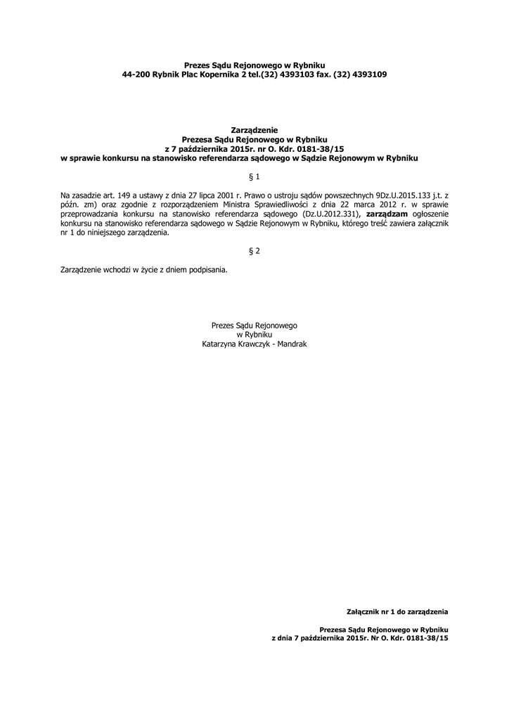 Prezes Sądu Rejonowego w Rybniku 44-200 Rybnik Plac Kopernika 2 tel.(32) 4393103 fax. (32) 4393109 Zarządzenie Prezesa Sądu Rejonowego w Rybniku z 7 października 2015r. nr O. Kdr. 0181-38/15 w sprawie konkursu na stanowisko referendarza sądowego w Sądzie Rejonowym w Rybniku §1 Na zasadzie art. 149 a ustawy z dnia 27 lipca 2001 r. Prawo o ustroju sądów powszechnych 9Dz.U.2015.133 j.t. z późn. zm) oraz zgodnie z rozporządzeniem Ministra Sprawiedliwości z dnia 22 marca 2012 r. w sprawie przeprowadzania konkursu na stanowisko referendarza sądowego (Dz.U.2012.331), zarządzam ogłoszenie konkursu na stanowisko referendarza sądowego w Sądzie Rejonowym w Rybniku, którego treść zawiera załącznik nr 1 do niniejszego zarządzenia. §2 Zarządzenie wchodzi w życie z dniem podpisania. Prezes Sądu Rejonowego w Rybniku Katarzyna Krawczyk - Mandrak Załącznik nr 1 do zarządzenia Prezesa Sądu Rejonowego w Rybniku z dnia 7 października 2015r. Nr O. Kdr. 0181-38/15 Sąd Rejonowy w Rybniku ogłasza konkurs nr O. Kdr. 0181-38/15 na stanowisko: REFRENDARZA SĄDOWEGO Podstawowe informacje: Nazwa i adres Sądu: Sąd Rejonowy w Rybniku, Pl. Kopernika 2 Oznaczenie konkursu: „Konkurs na stanowisko Referendarza sądowego” – O.Kdr. 0181-38/15 Termin i miejsce przeprowadzenia konkursu: - 7 grudzień 2015r. Sąd Rejonowy w Rybniku, Pl. Kopernika 2 - liczba wolnych etatów: 1 Na stanowisku referendarza sądowego może być zatrudniony ten kto: 1) posiada obywatelstwo polskie i korzysta z pełni praw cywilnych i obywatelskich; 2) jest nieskazitelnego charakteru; 3) ukończył wyższe studia prawnicze w Polsce i uzyskał tytuł magistra prawa lub zagraniczne uznane w Polsce; 4) ukończył 24 lata; 5) ukończył aplikację ogólną prowadzoną przez Krajową Szkołę Sądownictwa i Prokuratury lub zdał egzamin sędziowski, prokuratorski, notarialny, adwokacki lub radcowski1. 1 Zgodnie z art. 66 ust. 1 ustawy z dnia z dnia 23 stycznia 2009 r. o Krajowej Szkole Sądownictwa i Prokuratury (Dz.U.2012.1230 j.t. z późn. zm.) warunek określony w art. 149 § 1 pkt 5 ustawy z dnia 27 lipca 2001 r. - Prawo o ustroju sądów powszechnych, w brzmieniu nadanym niniejszą ustawą, spełnia osoba, która na podstawie przepisów obowiązujących przed dniem wejścia w życie ustawy z dnia 23 stycznia 2009r. o Krajowej Szkole Sądownictwa i Prokuratury, odbyła aplikację referendarską i złożyła egzamin referendarski lub odbyła aplikację sądową lub prokuratorską, bądź złożyła egzamin referendarski. Wymagane dokumenty i oświadczenia: 1. 2. 3. 4. 5. 6. 7. 8. wniosek o zatrudnienie na stanowisku referendarza sądowego zawierający nr konkursu, własnoręcznie napisany życiorys oraz informację o przebiegu kariery zawodowej; oryginał lub urzędowo poświadczony odpis dyplomu ukończenia aplikacji ogólnej albo zaświadczenie o zdanym egzaminie sędziowskim, prokuratorskim, notarialnym, adwokackim lub radcowskim lub referendarskim, 3 aktualne fotografie zgodne z wymaganiami stosowanymi przy wydawaniu dowodów osobistych; oryginał lub urzędowo poświadczony odpis dokumentu potwierdzającego ukończenie studiów wyższych na kierunku prawo w Rzeczypospolitej Polskiej i uzyskanie tytułu magistra prawa albo oryginał lub urzędowo poświadczony odpis dokumentu potwierdzającego ukończenie zagranicznych studiów wyższych na kierunku prawo uznawanych w Rzeczypospolitej Polskiej na podstawie odrębnych przepisów; oświadczenie, o którym mowa w art. 155 a § 6 ustawy z dnia 27 lipca 2001r. Prawo o ustroju sądów powszechnych, tj. oświadczenie, że nie jest prowadzone przeciwko kandydatowi postępowanie o przestępstwo ścigane z oskarżenia publicznego lub przestępstwo skarbowe; oświadczenie o wyrażeniu zgody na przetwarzanie danych osobowych na potrzeby konkursu; oświadczenie o obywatelstwie polskim i korzystaniu z praw cywilnych i obywatelskich. Do zgłoszenia kandydat może dołączyć dokumenty potwierdzające dodatkowe kwalifikacje i osiągnięcia. Oświadczenia winny być podpisane własnoręcznie przez kandydata. Wzory oświadczeń dostępne są w Oddziale Kadr oraz na stronie www.rybnik.sr.gov.pl (zakładka: oferty pracy) Wymagane dokumenty i oświadczenia należy składać osobiście lub przesłać drogą pocztować (decyduje data stempla pocztowego) w zamkniętych kopertach wraz z oznaczeniem konkursu do 22 października 2015 r. do Oddziału Kadr Sądu Rejonowego w Rybniku, Plac Kopernika 2, 44-200 Rybnik, I Pietro pok. 113 Ponadto informuję, iż pracownicy Oddziału Kadr przyjmujący dokumenty aplikacyjne kandydatów nie weryfikują ich kompletności i poprawności. Zgłoszenia przesłane drogą teleinformatyczna nie będą honorowane. Lista kandydatów dopuszczonych do konkursu zostanie umieszczona najpóźniej 5 listopada 2015 r. na stronie internetowej Sądu oraz na tablicy informacyjnej Sądu Rejonowego w Rybniku. Kandydaci biorący udział w konkursie proszeni są o zaopatrzenie się w e własnym zakresie w teksty aktów prawnych, z których możliwe będzie korzystanie w części konkursowej polegającej na rozwiązywaniu kazusów. 1. 2. 3. 4. 5. 6. Kodeks cywilny, Kodeks postępowania cywilnego, Kodeks spółek handlowych, Ustawa o księgach wieczystych i hipotece, Kodeks karny, Kodeks postępowania karnego. Dopuszczalną formą korzystania z ww. aktów prawnych jest tylko i wyłącznie forma papierowa. Dodatkowe informacje można uzyskać w Oddziale Kadr tut. Sądu pod nr tel. (32) 43 93 104. Organizator konkursu zastrzega sobie prawo do odwołania konkursu bez podania przyczyny. Prezes Sądu Rejonowego w Rybniku Katarzyna Krawczyk - Mandrak