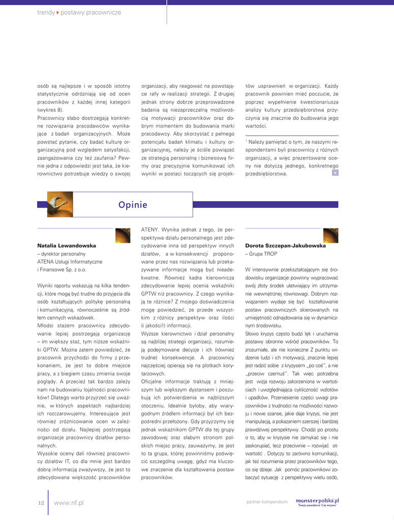 trendy postawy pracownicze osób są najlepsze i w sposób istotny organizacji, aby reagować na powstają- tów usprawnień w organizacji. Każdy statystycznie odróżniają się od ocen ce rafy w realizacji strategii. Z drugiej pracownik powinien mieć poczucie, że pracowników z każdej innej kategorii jednak strony dobrze przeprowadzone poprzez wypełnienie kwestionariusza (wykres 8). badania są niezaprzeczalną możliwoś- analizy kultury przedsiębiorstwa przy- Pracownicy słabo dostrzegają konkret- cią motywacji pracowników oraz do- czynia się znacznie do budowania jego ne rozwiązania pracodawców wynika- brym momentem do budowania marki wartości. jące z badań organizacyjnych. Może pracodawcy. Aby skorzystać z pełnego powstać pytanie, czy badać kulturę or- potencjału badań klimatu i kultury or- 1 ganizacyjną pod względem satysfakcji, ganizacyjnej, należy je ściśle powiązać spondentami byli pracownicy z różnych Należy pamiętać o tym, że naszymi re- zaangażowania czy też zaufania? Pew- ze strategią personalną i biznesową fir- organizacji, a więc prezentowane oce- nie jedna z odpowiedzi jest taka, że kie- my oraz precyzyjnie komunikować ich ny nie dotyczą jednego, konkretnego rownictwo potrzebuje wiedzy o swojej wyniki w postaci toczących się projek- przedsiębiorstwa. Opinie ATENY. Wynika jednak z tego, że perspektywa działu personalnego jest zdeNatalia Lewandowska cydowanie inna od perspektyw innych Dorota Szczepan-Jakubowska – dyrektor personalny działów, a w konsekwencji propono- – Grupa TROP ATENA Usługi Informatyczne wane przez nas rozwiązania lub przeka- i Finansowe Sp. z o.o. zywane informacje mogą być nieade- W intensywnie przekształcającym się śro- kwatne. Również kadra kierownicza dowisku organizacje powinny wypracować Wyniki raportu wskazują na kilka tenden- zdecydowanie lepiej ocenia wskaźniki swój złoty środek ułatwiający im utrzyma- cji, które mogą być trudne do przyjęcia dla GPTW niż pracownicy. Z czego wynika- nie wewnętrznej równowagi. Dobrym roz- osób kształtujących politykę personalną ją te różnice? Z mojego doświadczenia wiązaniem wydaje się być kształtowanie i komunikacyjną, równocześnie są źród- mogę powiedzieć, że przede wszyst- postaw pracowniczych skierowanych na łem cennych wskazówek. kim z różnicy perspektyw oraz ilości umiejętność odnajdowania się w dynamicz- Młodsi stażem pracownicy zdecydo- (i jakości!) informacji. nym środowisku. wanie lepiej postrzegają organizację Wyższe kierownictwo i dział personalny Słowo kryzys często budzi lęk i uruchamia – im większy staż, tym niższe wskaźni- są najbliżej strategii organizacji, rozumie- postawy obronne wśród pracowników. To ki GPTW. Można zatem powiedzieć, że ją podejmowane decyzje i ich (również zrozumiałe, ale nie konieczne Z punktu wi- pracownik przychodzi do firmy z prze- trudne) konsekwencje. A pracownicy dzenie ludzi i ich motywacji, znacznie lepiej konaniem, że jest to dobre miejsce najczęściej opierają się na plotkach kory- jest radzić sobie z kryzysem „po coś”, a nie pracy, a z biegiem czasu zmienia swoje tarzowych. „przeciw czemuś”. Tak więc potrzebna poglądy. A przecież tak bardzo zależy Oficjalne informacje traktują z mniej- jest wizja rozwoju zakorzeniona w wartoś- nam na budowaniu lojalności pracowni- szym lub większym dystansem i poszu- ciach i uwzględniająca cykliczność wzlotów ków! Dlatego warto przyjrzeć się uważ- kują ich potwierdzenia w najbliższym i upadków. Przeniesienie części uwagi pra- nie, w których aspektach najbardziej otoczeniu. Idealnie byłoby, aby wiary- cowników z trudności na możliwości rozwo- ich rozczarowujemy. Interesujące jest godnym źródłem informacji był ich bez- ju i nowe szanse, jakie daje kryzys, nie jest również zróżnicowanie ocen w zależ- pośredni przełożony. Gdy przyjrzymy się manipulacją, a pokazaniem szerszej i bardziej ności od działu. Najlepiej postrzegają jednak wskaźnikom GPTW dla tej grupy prawdziwej perspektywy. Chodzi po prostu organizacje pracownicy działów perso- zawodowej oraz słabym stronom pol- o to, aby w kryzysie nie zamykać się i nie nalnych. skich miejsc pracy, zauważymy, że jest zaskorupiać, lecz przeciwnie – rozwijać ot- Wysokie oceny dali również pracowni- to ta grupa, której powinniśmy poświę- wartość . Dotyczy to zarówno komunikacji, cy działów IT, co dla mnie jest bardzo cić szczególną uwagę, gdyż ma kluczo- jak też rozumienia przez pracowników tego, dobrą informacją zważywszy, że jest to we znaczenie dla kształtowania postaw co się dzieje. Jak pomóc pracownikowi zo- zdecydowana większość pracowników pracowników. baczyć sytuację z perspektywy wielu osób, 12 www.nf.pl partner kompendium
