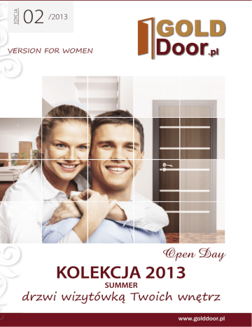 EDYCJA 02 /2013 VERSION FOR WOMEN VERS VE Open Day KOLEKCJA 2013 SUMMER drzwi wizytówką Twoich wnętrz d www.golddoor.pl Grupa GOLDDoor.pl » Drzwi Wewnętrzne Ramiakowe Kolekcja Passione Nasza firma jest naczelnym podmiotem wchodzącym w skład grupy GGD GRUPA GOLD DOOR Cechuje nas wysoko wykwalifikowana kadra, nowoczesne rozwiązania marketingowe, świeże pomysły oraz dbałość o szczegóły. Ciężką pracą i solidnością sprawiliśmy, że w bardzo krótkim czasie nasza firma zyskała ogromne uznanie na rynku stolarki otworowej i dekoratorskiej. Dziś jesteśmy jedną z najszybciej rozwijających się grup w Polsce. Modern...................................................... 4 Mistral ........................................................ 5 Cortica ....................................................... 6 Nivra ........................................................... 8 Life .............................................................. 9 Laguna.....................................................10 Forte ......................................................... 34 Slim ........................................................... 35 Gama ........................................................ 36 Classica .................................................... 37 » System Przesuwny ....................38 » Drzwi Dwuskrzydłowe ...........39 » Drzwi Modułowe » Drzwi Wejściowe Wewnątrzlokalowe Clarity.......................................................11 » Drzwi Tłoczone Frezowane Pionier .....................................................40 Alva ...........................................................41 Livra ..........................................................43 Viga ...........................................................44 Grupa stale poszerza swoją wiedzę i kompetencje, aby w profesjonalny sposób sprostać rosnącym potrzebom klientów. Vienna......................................................12 Ościeżnica Retro ..................................13 » Przeciwpożarowe ......................45 Zainteresowanie produktami znajdującymi się w ofercie GGD utwierdza nas w przekonaniu, że kierunek, który obraliśmy jest właściwy. » Drzwi Wewnętrzne Okleinowane Zapraszamy do współpracy Zespół GGD Kolekcja Prestiż Riva ...........................................................14 Baja ...........................................................15 Verso ........................................................16 Aquador ..................................................17 Regal ........................................................18 Play ...........................................................19 Vista ..........................................................20 Doral.........................................................22 » Drzwi Wewnętrzne Okleinowane » Drzwi Techniczne.......................46 Bramy Garażowe i Techniczne ........47 » Drzwi Zewnętrzne Stalowe Jowisz ......................................................48 Jowisz Łuk ..............................................48 Jowisz Roco 1 ........................................49 Jowisz Roco 2 ........................................49 Mars ..........................................................50 Esta ...........................................................50 Solar .........................................................51 Kolekcja Optima 2 e-mail: [email protected] www.golddoor.pl tel. 87/423 22 01 fax. 87/425 19 58 » Klamki, Wkładki ...........................52 Grupa Sabro ........................................................23 Manhattan .............................................25 Bravo ........................................................ 26 Galant ...................................................... 27 Lupo ......................................................... 28 Tigra.......................................................... 29 Milo........................................................... 30 Vermila .................................................... 31 Gala........................................................... 32 Lider ......................................................... 33 » Akcesoria .........................................53 » Ościeżnice Do Drzwi Wewnętrznych .............................. 54 » Progi Aluminiowe.......................55 tel. kom. 500 222 279 3 GOLDDoor.pl Pokojowe • Konstrukcja ramowa wykonana z drewna iglastego i płyty MDF • Wypełnienie - płyciny MDF okleinowane • Przeszklenie szybą białą matową hartowaną Pełne KONSTRUKCJA SKRZYDŁA MISTRAL Łazienkowe Pokojowe DRZWI WEWNĘTRZNE RAMIAKOWE MODERN WYKOŃCZENIE • Skrzydło pokryte okleiną PVC w kolorze drewnopodobnym • W celu zapewnienia wyższych walorów estetycznych i użytkowych krawędzie skrzydeł są zaokrąglone w technologii SOFTLINE DRZWI WEWNĘTRZNE RAMIAKOWE Grupa WYPOSAŻENIE STANDARDOWE • Zamek o rozstawie 72 mm na klucz, patent lub wc • 3 zawiasy czopowe brutto: brutto: 597,78 zł netto: 486,00 zł 486,00 zł KONSTRUKCJA SKRZYDŁA • Konstrukcja ramowa wykonana z drewna iglastego i płyty MDF • Wypełnienie - płyciny MDF okleinowane • Przeszklenie szybą białą matową hartowaną Pełne Łazienkowe DOSTĘPNE WYMIARY 60*, 70, 80, 90 cm Dopuszczalne skrócenie skrzydła: 30 mm 597,78 zł netto: WYKOŃCZENIE • Skrzydło pokryte okleiną PVC w kolorze drewnopodobnym • W celu zapewnienia wyższych walorów estetycznych i użytkowych krawędzie skrzydeł są zaokrąglone w technologii SOFTLINE brutto: 597,78 zł netto: 486,00 zł brutto: brutto: • Zamek o rozstawie 72 mm na klucz, patent lub wc • 3 zawiasy czopowe netto: 597,78 zł 486,00 zł brutto: 597,78 zł 597,78 zł netto: Cena ościeżnicy stałej 169,00 zł netto WYPOSAŻENIE STANDARDOWE netto: 486,00 zł 486,00 zł KOLORY DOSTĘPNE WYMIARY 60*, 70, 80, 90 cm Dopuszczalne skrócenie skrzydła: 30 mm Cena ościeżnicy stałej 169,00 zł netto K