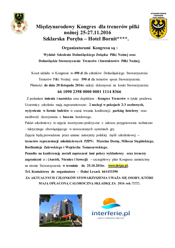 Międzynarodowy Kongres dla trenerów piłki nożnej 25-27.11.2016 Szklarska Poręba – Hotel Bornit****. Organizatorami Kongresu są : Wydział Szkolenia Dolnośląskiego Związku Piłki Nożnej oraz Dolnośląskie Stowarzyszenie Trenerów i Instruktorów Piłki Nożnej. Koszt udziału w Kongresie to 490 zł dla członków Dolnośląskiego Stowarzyszenia Trenerów Piłki Nożnej oraz 590 zł dla trenerów spoza Stowarzyszenia. Płatności do dnia 20 listopada 2016r. należy dokonywać na konto Stowarzyszenia: 66 1090 2398 0000 0001 1114 8366 Z podaniem imienia i nazwiska oraz dopiskiem : Kongres Trenerów w tytule przelewu. Uczestnicy szkolenia mają zagwarantowane: 2 noclegi w pokojach 2-3 osobowych, wyżywienie w formie bufetów w czasie trwania konferencji, parking hotelowy oraz możliwość skorzystania z basenu hotelowego. Pakiet szkoleniowy to zajęcia teoretyczno-praktyczne z zakresu przygotowania techniczno – taktycznego obowiązującego w nowoczesnych systemach gry. Zajęcia będą prowadzone przez uznane autorytety polskiej myśli szkoleniowej – trenerów reprezentacji młodzieżowych PZPN: Marcina Dornę, Miłosza Stępińskiego, Bartłomieja Zalewskiego i Wojciecha Tomaszewskiego. Ponadto na konferencję zostali zaproszeni inni polscy wykładowcy oraz trenerzy zagraniczni z : (Austrii, Niemiec i Szwecji) – szczegółowy plan Kongresu zamieścimy na stronie Stowarzyszenia w terminie do 25.10.2016r. www.dstpn.pl. Tel. Kontaktowy do organizatora – Dulat Leszek 661433390 ZA AKTUALNYCH CZŁONKÓW STOWARZYSZENIA UWAŻA SIĘ OSOBY, KTÓRE MAJĄ OPŁACONĄ CAŁOROCZNĄ SKŁADKĘ ZA 2016 rok !!!!!!!.
