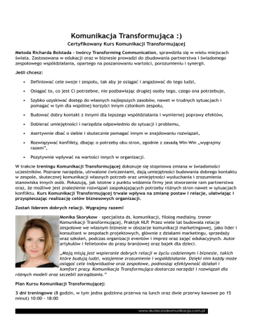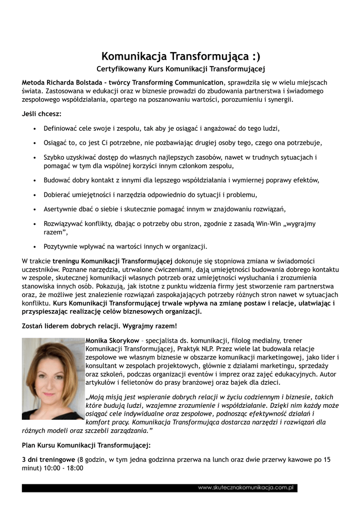Komunikacja Transformująca :) Certyfikowany Kurs Komunikacji Transformującej Metoda Richarda Bolstada - twórcy Transforming Communication, sprawdziła się w wielu miejscach świata. Zastosowana w edukacji oraz w biznesie prowadzi do zbudowania partnerstwa i świadomego zespołowego współdziałania, opartego na poszanowaniu wartości, porozumieniu i synergii. Jeśli chcesz: • Definiować cele swoje i zespołu, tak aby je osiągać i angażować do tego ludzi, • Osiągać to, co jest Ci potrzebne, nie pozbawiając drugiej osoby tego, czego ona potrzebuje, • Szybko uzyskiwać dostęp do własnych najlepszych zasobów, nawet w trudnych sytuacjach i pomagać w tym dla wspólnej korzyści innym członkom zespołu, • Budować dobry kontakt z innymi dla lepszego współdziałania i wymiernej poprawy efektów, • Dobierać umiejętności i narzędzia odpowiednio do sytuacji i problemu, • Asertywnie dbać o siebie i skutecznie pomagać innym w znajdowaniu rozwiązań, • Rozwiązywać konflikty, dbając o potrzeby obu stron, zgodnie z zasadą Win-Win „wygrajmy razem”, • Pozytywnie wpływać na wartości innych w organizacji. W trakcie treningu Komunikacji Transformującej dokonuje się stopniowa zmiana w świadomości uczestników. Poznane narzędzia, utrwalone ćwiczeniami, dają umiejętności budowania dobrego kontaktu w zespole, skutecznej komunikacji własnych potrzeb oraz umiejętności wysłuchania i zrozumienia stanowiska innych osób. Pokazują, jak istotne z punktu widzenia firmy jest stworzenie ram partnerstwa oraz, że możliwe jest znalezienie rozwiązań zaspokajających potrzeby różnych stron nawet w sytuacjach konfliktu. Kurs Komunikacji Transformującej trwale wpływa na zmianę postaw i relacje, ułatwiając i przyspieszając realizację celów biznesowych organizacji. Zostań liderem dobrych relacji. Wygrajmy razem! Monika Skorykow – specjalista ds. komunikacji, filolog medialny, trener Komunikacji Transformującej, Praktyk NLP. Przez wiele lat budowała relacje zespołowe we własnym biznesie w obszarze komunikacji marketingowej, jako lider i konsultant w zespołach projektowych, głównie z działami marketingu, sprzedaży oraz szkoleń, podczas organizacji eventów i imprez oraz zajęć edukacyjnych. Autor artykułów i felietonów do prasy branżowej oraz bajek dla dzieci. „Moją misją jest wspieranie dobrych relacji w życiu codziennym i biznesie, takich które budują ludzi, wzajemne zrozumienie i współdziałanie. Dzięki nim każdy może osiągać cele indywidualne oraz zespołowe, podnosząc efektywność działań i komfort pracy. Komunikacja Transformująca dostarcza narzędzi i rozwiązań dla różnych modeli oraz szczebli zarządzania.” Plan Kursu Komunikacji Transformującej: 3 dni treningowe (8 godzin, w tym jedna godzinna przerwa na lunch oraz dwie przerwy kawowe po 15 minut) 10:00 - 18:00 Dzień pierwszy: Poznajmy się. Kiedy sięgamy pamięcią do najważniejszych wydarzeń w naszym życiu, pojawiają się tam osoby dla nas ważne. Każdy z nas ma do przekazania innym coś niepowtarzalnego. W spotkaniu człowieka z człowiekiem dzieją się kluczowe dla nas wydarzenia, przeobrażenia. To istotna część komunikacji, która niesie ze sobą nowe wartości. Uczymy się poprzez doświadczenie i komunikację z innymi. Dobra komunikacja oparta na otwartości na drugiego człowieka i poszanowanie wartości, zmienia relacje z ludźmi na lepsze. To proces transformacji relacji osobistych i biznesowych, sprawdzony przez wiele lat praktyki jego twórcy - Richarda Bolstada i trenerów przez niego certyfikowanych. 1. Stawianie celów szkolenia. „Żeglarzowi, który nie wie do jakiego portu zmierza, nie sprzyja żaden wiatr” Żeby zaangażować do naszego rejsu odpowiednie wiatry, każdy uczestnik szkolenia wyznacza cel - port, do którego płynie, a my jako trener, dostarczamy jemu i jego załodze, odpowiedniej wiedzy, kompetencji i umiejętności, którą wykorzysta z pomocą naszą i „załogi”, aby jak najefektywniej przepłynąć przez ocean komunikacji i osiągnąć założony cel. Na tym etapie zawieramy również w naszej grupie wspólny kontrakt dobrej współpracy, oparty na zasadach zaakceptowanych przez uczestników szkolenia. 2. Budowanie dobrego kontaktu z drugą osobą (rapport). Poczucie wzajemnego zrozumienia jest kluczem komunikacji. To niezbędny etap do zbudowania relacji w każdej sferze życia - prywatnej i zawodowej. Omawiamy, pokazujemy i ćwiczymy, jak to zrobić - skutecznie i w przyjemny sposób. Z doświadczeń - to etap, kiedy uczestnicy z zaskoczeniem stwierdzają, jak miło i prosto można nawiązać dobrą relację z drugim człowiekiem. 3. Model - Do kogo należy problem. Problemy w komunikacji. Omówienie czterech obszarów. Koncepcja Thomasa Gordona, który przez wiele lat praktyki konsultanta i terapeuty opracował prosty sposób określenia „problemu” w relacji, jako obszaru, w którym osoba czuje się z jakimś zachowaniem „źle”. Obszar bez problemu wyznacza stan, w którym czujemy się dobrze i komunikacja buduje bez przeszkód dla obopólnej korzyści naszą relację. Omawiamy i ćwiczymy, jak stawiać diagnozę, by dobrać narzędzia do rozwiązania problemu w obszarze „Ja mam problem”, „Druga osoba ma problem”, „Oboje mamy problem”. „Kiedy ludzie mają problem, mają też prawo do rozwiązania tego problemu. To fundamentalna wartość, która leży u podstaw metody (…) istnieją pewne sposoby, które, jak pokazują badania, działają lepiej niż inne”. Richard Bolstad: Komunikacja Transformująca. Podręcznik metody Transforming Communication z ćwiczeniami. Wrocław 2013 4. Jak nauczyć się słuchać i dlaczego warto. Blokady. Dawanie uwagi. Na co dzień spotykamy osoby, które mają problem. Są one w innych stanie, innych emocjach niż my, co stwarza trudności w zrozumieniu się. Często”pomagamy” im nazywając problem przez filtr własnych doświadczeń.