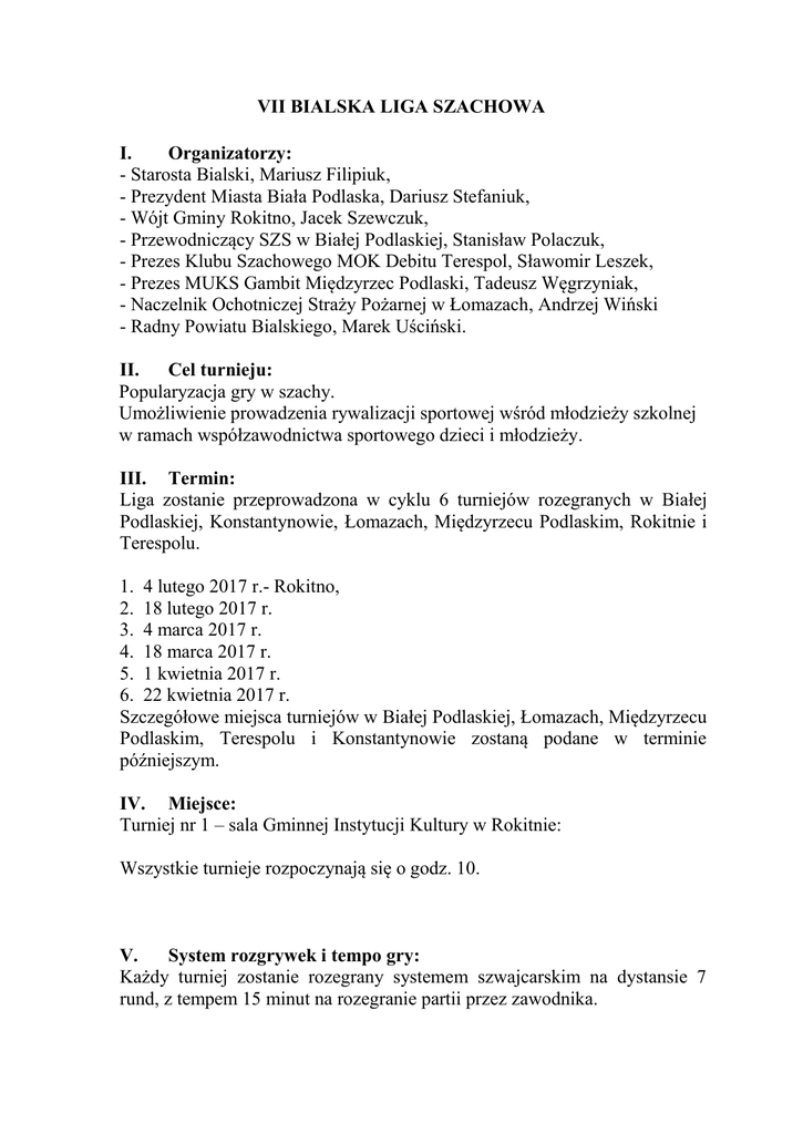 VII BIALSKA LIGA SZACHOWA I. Organizatorzy: - Starosta Bialski, Mariusz Filipiuk, - Prezydent Miasta Biała Podlaska, Dariusz Stefaniuk, - Wójt Gminy Rokitno, Jacek Szewczuk, - Przewodniczący SZS w Białej Podlaskiej, Stanisław Polaczuk, - Prezes Klubu Szachowego MOK Debitu Terespol, Sławomir Leszek, - Prezes MUKS Gambit Międzyrzec Podlaski, Tadeusz Węgrzyniak, - Naczelnik Ochotniczej Straży Pożarnej w Łomazach, Andrzej Wiński - Radny Powiatu Bialskiego, Marek Uściński. II. Cel turnieju: Popularyzacja gry w szachy. Umożliwienie prowadzenia rywalizacji sportowej wśród młodzieży szkolnej w ramach współzawodnictwa sportowego dzieci i młodzieży. III. Termin: Liga zostanie przeprowadzona w cyklu 6 turniejów rozegranych w Białej Podlaskiej, Konstantynowie, Łomazach, Międzyrzecu Podlaskim, Rokitnie i Terespolu. 1. 4 lutego 2017 r.- Rokitno, 2. 18 lutego 2017 r. 3. 4 marca 2017 r. 4. 18 marca 2017 r. 5. 1 kwietnia 2017 r. 6. 22 kwietnia 2017 r. Szczegółowe miejsca turniejów w Białej Podlaskiej, Łomazach, Międzyrzecu Podlaskim, Terespolu i Konstantynowie zostaną podane w terminie późniejszym. IV. Miejsce: Turniej nr 1 – sala Gminnej Instytucji Kultury w Rokitnie: Wszystkie turnieje rozpoczynają się o godz. 10. V. System rozgrywek i tempo gry: Każdy turniej zostanie rozegrany systemem szwajcarskim na dystansie 7 rund, z tempem 15 minut na rozegranie partii przez zawodnika. VI. Warunki uczestnictwa: W turnieju mają prawo uczestniczyć wszyscy uczniowie szkół podstawowych, gimnazjów i szkół ponadgimnazjanych z Powiatu Bialskiego i powiatów sąsiednich. Zgłoszenia należy dokonywać na adres Szkolnego Związku Sportowego w Białej Podlaskiej lub sędziego zawodów Marka Uścińskiego – tel. 509 926 526 albo w dniu zawodów, 30 minut przez ich rozpoczęciem u sędziego prowadzącego rozgrywki oraz na stronie internetowej www.chessarbiter.com. VII. Grupy rozgrywkowe: Grupa młodsza – dzieci i młodzież ze szkół podstawowych powiatu bialskiego i powiatów sąsiednich, z podziałem na dziewczęta i chłopców; Grupa średnia – młodzież ze szkół gimnazjalnych powiatu bialskiego i powiatów sąsiednich, z podziałem na dziewczęta i chłopców. Grupa najstarsza – młodzież ze szkół ponadgimnazjalnych powiatu bialskiego i powiatów sąsiednich, z podziałem na dziewczęta i chłopców. VIII. Uwagi: Sprzęt sportowy podczas zawodów zabezpiecza organizator. Uczestnicy przyjeżdżają na własny koszt lub delegujących szkół. Interpretacja regulaminu pozostaje w gestii organizatorów, zaś decyzje sędziego są ostateczne. Obowiązują przepisy kodeksu szachowego. Uczestniczący w każdym turnieju zostaną sklasyfikowani według tabeli punktowej będącej załącznikiem do niniejszego regulaminu. IX. Nagrody: 1. Trzej najlepsi zawodnicy w kategorii dziewcząt i chłopców w każdym z turniejów otrzymują pamiątkowe dyplomy i medale oraz nagrody rzeczowe. 2. Trzej zwycięzcy klasyfikacji końcowej, ustalonej na podstawie wyników z wszystkich turniejów, otrzymają puchary, dyplomy i nagrody rzeczowe. Sędzia zawodów Marek Uściński TABELA PUNKTOWA LOKATA 1 2 3 4 5 6 7 8 9 10 11 12 13 14 15 16 17 18 19 20 21 22 23 24 25 26 27 28 29 30 i dalsze LICZBA PUNKTÓW 100 80 60 50 45 40 36 32 29 26 24 22 20 18 16 15 14 13 12 11 10 9 8 7 6 5 4 3 2 1