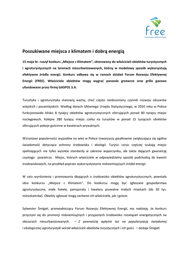 Poszukiwane miejsca z klimatem i dobrą energią 15 maja br. ruszył konkurs „Miejsce z Klimatem”, skierowany do właścicieli obiektów turystycznych i agroturystycznych na terenach niezurbanizowanych, którzy w modelowy sposób wykorzystują efektywne źródła energii. Konkurs odbywa się w ramach działań Forum Rozwoju Efektywnej Energii (FREE). Właściciele obiektów mogą wygrać parasole grzewcze oraz grille gazowe ufundowane przez firmę GASPOL S.A. Turystyka i agroturystyka stanowią ważny, choć często niedoceniany czynnik rozwoju obszarów wiejskich i pozamiejskich. Według danych Głównego Urzędu Statystycznego, w 2010 roku w Polsce funkcjonowało blisko 8 tysięcy obiektów agroturystycznych oferujących ponad 80 tysięcy miejsc noclegowych. Kolejne 280 tysięcy miejsc czeka na turystów w ponad 15 tysiącach obiektów oferujących pokoje gościnne w kwaterach prywatnych. Wzrostowi popularności wyjazdów na wieś w Polsce towarzyszy gwałtownie zwiększająca się ogólna świadomość dotycząca ochrony środowiska i ekologii. Turyści coraz częściej szukają miejsc spełniających nie tylko wysokie standardy w zakresie wypoczynku, ale także dających gwarancję czystego powietrza. Miejsc, których właściciele w odpowiedzialny sposób podchodzą do kwestii środowiskowych, na przykład poprzez wykorzystywanie niskoemisyjnych źródeł energii. W celu wyróżnienia i promowania dbających o środowisko obiektów agroturystycznych, powstała idea konkursu „Miejsce z Klimatem”. Do konkursu mogą być zgłaszane gospodarstwa agroturystyczne, małe hotele, pensjonaty i kwatery prywatne małych miastach (do 30 tys. mieszkańców). Obiekty zgłaszać mogą zarówno ich właściciele, jak i goście. Sylwester Śmigiel, przewodniczący Forum Rozwoju Efektywnej Energii, ma nadzieję, że konkurs przyczyni się do promocji niskoemisyjnych i przyjaznych środowisku rozwiązań energetycznych na obszarach niezurbanizowanych. ̶ Z pewnością wpłynie też na popularyzację świadomej i ekologicznej agroturystyki wśród właścicieli obiektów turystycznych i ich gości ̶ dodaje Śmigiel. Konkurs startuje 15 maja 2012 roku, a zgłoszenia można przesyłać do 15 lipca br. Na początku sierpnia zostanie ogłoszona lista wyróżnionych obiektów, które otrzymają certyfikat „Miejsca z Klimatem”. Zwycięzców konkursu poznamy na początku września 2012. Więcej informacji, w tym formularz zgłoszeniowy i regulamin konkursu, dostępnych jest na stronie www.forumfree.pl Konkurs „Miejsce z Klimatem” odbywa się w ramach działań Forum Rozwoju Efektywnej Energii (FREE), którego celem jest informowanie o efektywnych źródłach energii dostępnych dla gospodarstw i przedsiębiorstw na obszarach wiejskich. Istotą konkursu jest wyróżnienie obiektów turystycznych zlokalizowanych na terenach pozamiejskich w całej Polsce, które w modelowy sposób wykorzystują niskoemisyjne źródła energii, podnosząc tym samym swój ekologiczny standard. Kontakt dla mediów: Wojciech Waglowski Rzecznik Forum Rozwoju Efektywnej Energii Tel. +48 603 161 959 e-mail: [email protected] O Forum Rozwoju Efektywnej Energii (FREE) Forum Rozwoju Efektywnej Energii to część ogólnoeuropejskiej inicjatywy mającej na celu zwrócenie uwagi na potrzeby energetyczne obszarów wiejskich i podmiejskich. Od początku swej działalności w Polsce w 2010 roku, FREE zapoczątkowało wiele inicjatyw mających na celu zaangażowanie w debatę na temat energetyki na terenach niezurbanizowanych polityków i przedstawicieli mediów. Jedną z nich była opublikowanie w 2011 roku „Białej Księgi” na temat potrzeb i braków energetycznych społeczności wiejskich i podmiejskich w Polsce. Księga zawierała m.in. szerokie badania TNS OBOP realizowane na terenach pozamiejskich, teksty ekspertów oraz postulaty w zakresie rozwoju efektywnych źródeł energii w Polsce. Więcej informacji na temat FREE znajduje się na stronie www.forumfree.pl
