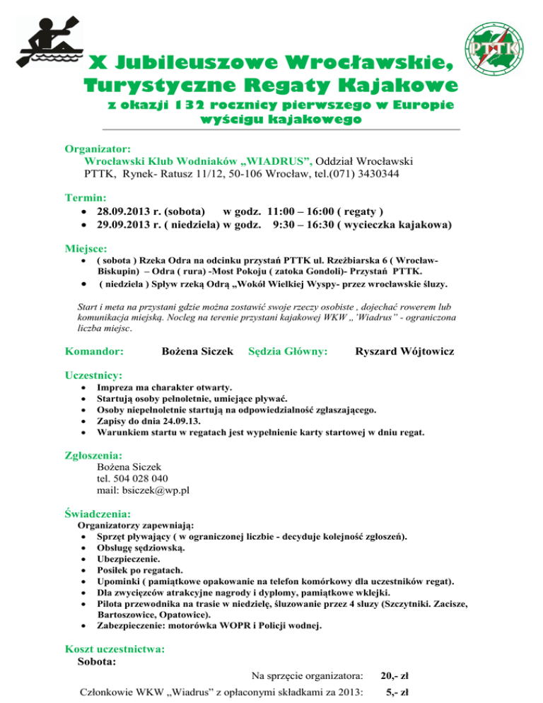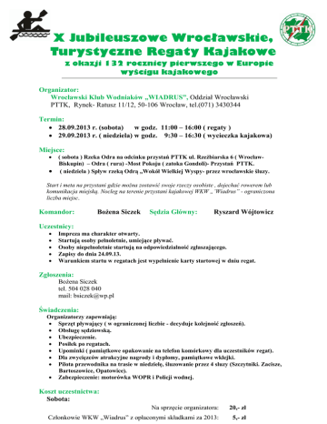 X Jubileuszowe Wrocławskie, Turystyczne Regaty Kajakowe z okazji 132 rocznicy pierwszego w Europie wyścigu kajakowego Organizator: Wrocławski Klub Wodniaków „WIADRUS”, Oddział Wrocławski PTTK, Rynek- Ratusz 11/12, 50-106 Wrocław, tel.(071) 3430344 Termin: 28.09.2013 r. (sobota) w godz. 11:00 – 16:00 ( regaty ) 29.09.2013 r. ( niedziela) w godz. 9:30 – 16:30 ( wycieczka kajakowa) Miejsce: ( sobota ) Rzeka Odra na odcinku przystań PTTK ul. Rzeżbiarska 6 ( WrocławBiskupin) – Odra ( rura) -Most Pokoju ( zatoka Gondoli)- Przystań PTTK. ( niedziela ) Spływ rzeką Odrą „Wokół Wielkiej Wyspy- przez wrocławskie śluzy. Start i meta na przystani gdzie można zostawić swoje rzeczy osobiste , dojechać rowerem lub komunikacja miejską. Nocleg na terenie przystani kajakowej WKW „’Wiadrus” - ograniczona liczba miejsc. Komandor: Bożena Siczek Sędzia Główny: Ryszard Wójtowicz Uczestnicy: Impreza ma charakter otwarty. Startują osoby pełnoletnie, umiejące pływać. Osoby niepełnoletnie startują na odpowiedzialność zgłaszającego. Zapisy do dnia 24.09.13. Warunkiem startu w regatach jest wypełnienie karty startowej w dniu regat. Zgłoszenia: Bożena Siczek tel. 504 028 040 mail: [email protected] Świadczenia: Organizatorzy zapewniają: Sprzęt pływający ( w ograniczonej liczbie - decyduje kolejność zgłoszeń). Obsługę sędziowską. Ubezpieczenie. Posiłek po regatach. Upominki ( pamiątkowe opakowanie na telefon komórkowy dla uczestników regat). Dla zwycięzców atrakcyjne nagrody i dyplomy, pamiątkowe wklejki. Pilota przewodnika na trasie w niedzielę, śluzowanie przez 4 sluzy (Szczytniki. Zacisze, Bartoszowice, Opatowice). Zabezpieczenie: motorówka WOPR i Policji wodnej. Koszt uczestnictwa: Sobota: Na sprzęcie organizatora: 20,- zł Członkowie WKW „Wiadrus” z opłaconymi składkami za 2013: 5,- zł Uczestnicy na własnym sprzęcie: 10,- zł Na sprzęcie organizatora: 40,- zł Członkowie WKW „Wiadrus” z opłaconymi składkami za 2013: 10,- zł Uczestnicy na własnym sprzęcie: 25,- zł Niedziela: Program: ( sobota) 28.09.13 11:00 - Zbiórka załóg, przydzielenie sprzętu, przygotowania (wypełnienie karty startowej) 11:30 - Odprawa sędziowska 12:00 - Start do odcinka długodystansowego przystań PTTK – przepust z Oławy – most Piaskowy-przystań PTTK ( mapa trasy do wglądu) 14:30 - Planowane zamknięcie mety 15:00 - Wręczenie upominków dla zwycięzców 15:30 - Zakończenie imprezy Klasyfikacja załóg - wyścig rozgrywany jest w następujących kategoriach: kobiet, mężczyzn i mikstów KT-2 (kajak dwuosobowy turystyczny) j.w C-2 ( kanadyjka turystyczna) kobiet, mężczyzn K-1 ( jednoosobowy kajak turystyczny) Program: ( niedziela) 29.09.13 9:30 - Zbiórka załóg, przydzielenie sprzętu, przygotowania 10:00 - Start do odcinka rekreacyjnego przystań PTTK – śluza Szytniki- jaz Psie Pole- kanał żeglugowy- śluza Zacisze- śluza Bartoszowice- śluza OpatowicePrzystan PTTK 16:00 - Planowane zamknięcie mety 16:30 - Napoje i przekąska dla uczestników 17:00 - Zakonczenie imprezy Impreza dofinansowana przez Urząd Marszałkowski Województwa Dolnosląskiego oraz Zarząd główny PTTK Serdecznie zapraszamy !